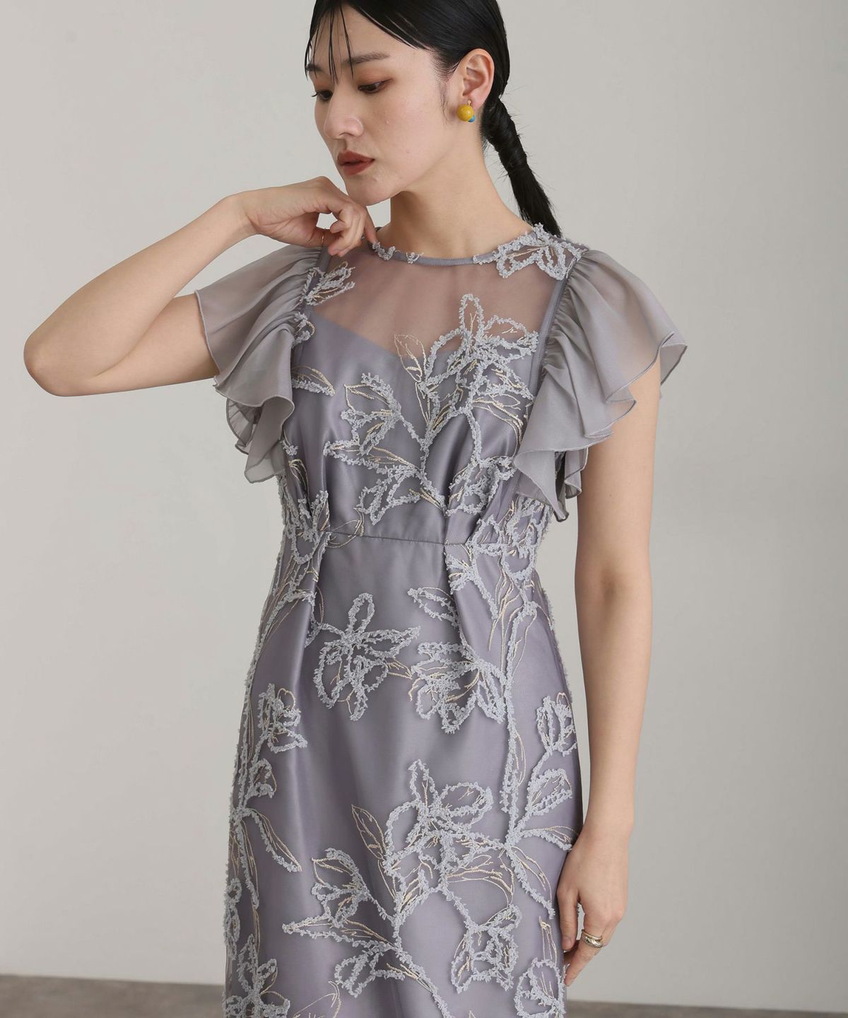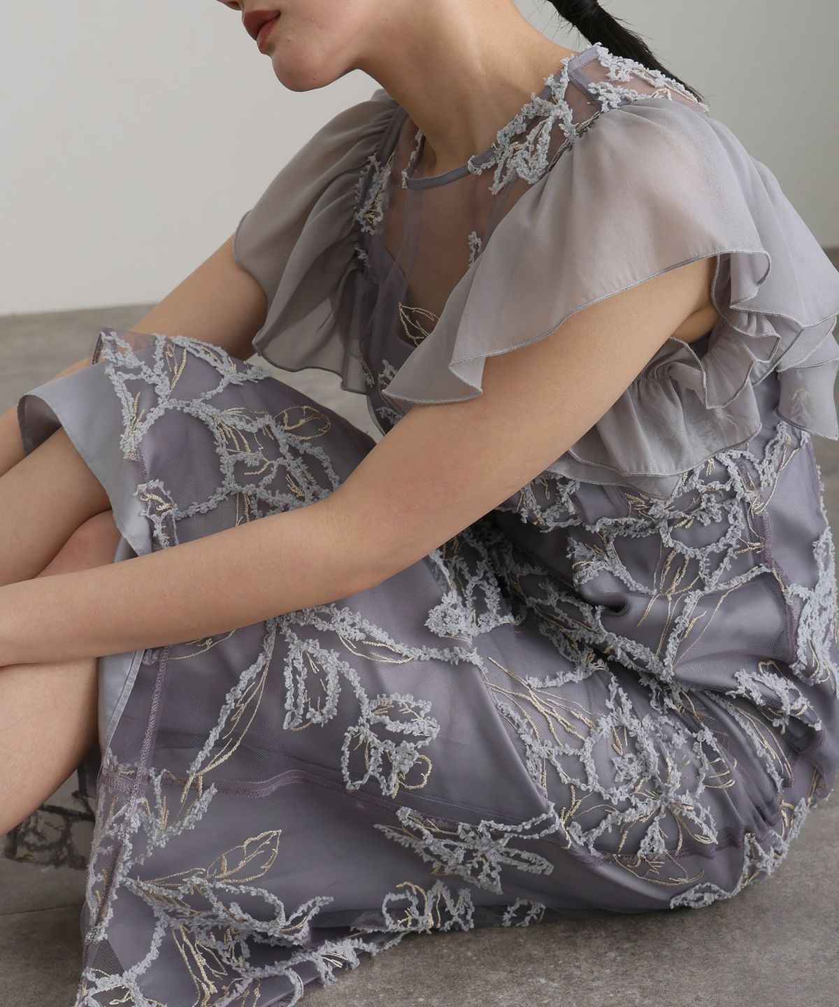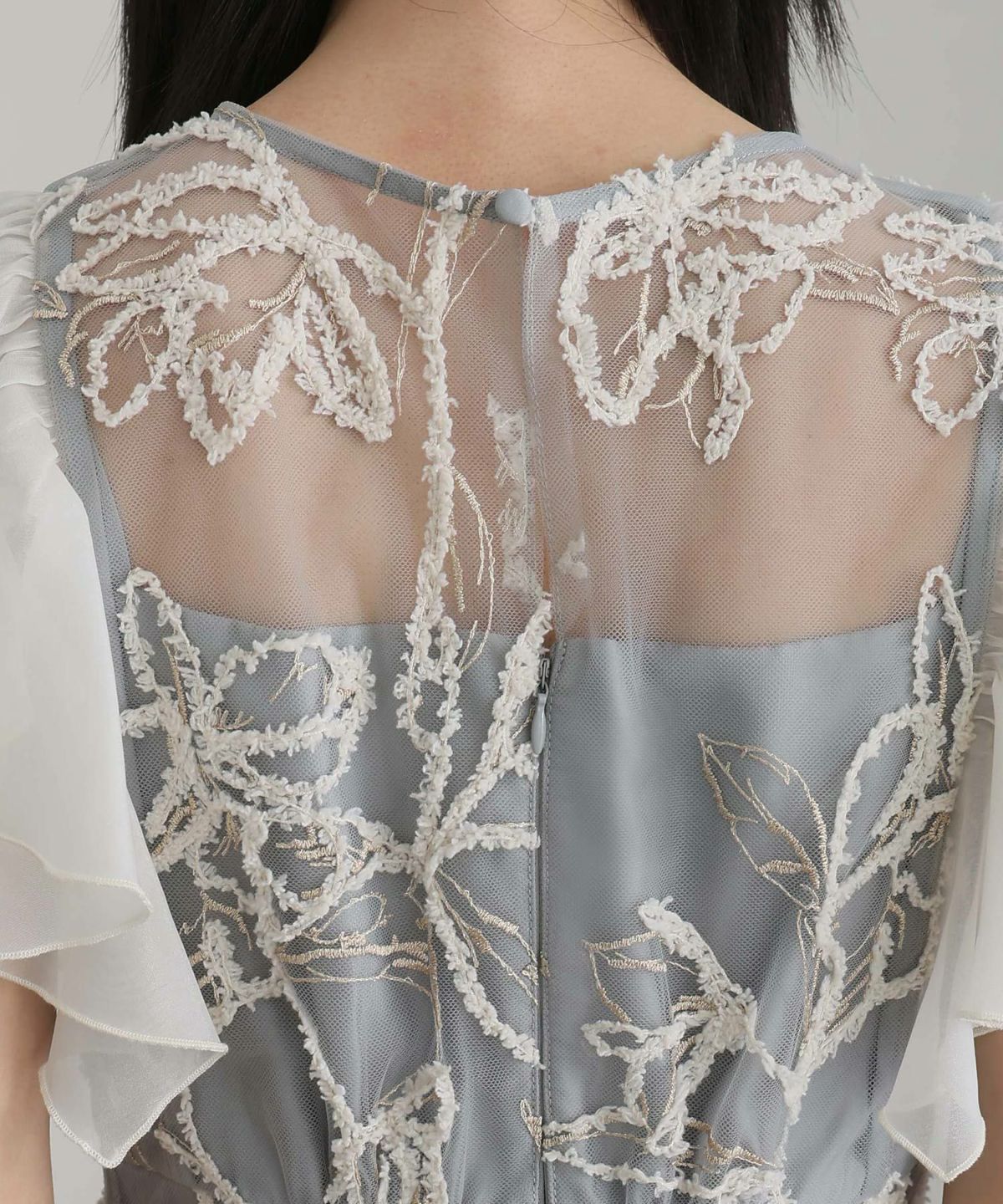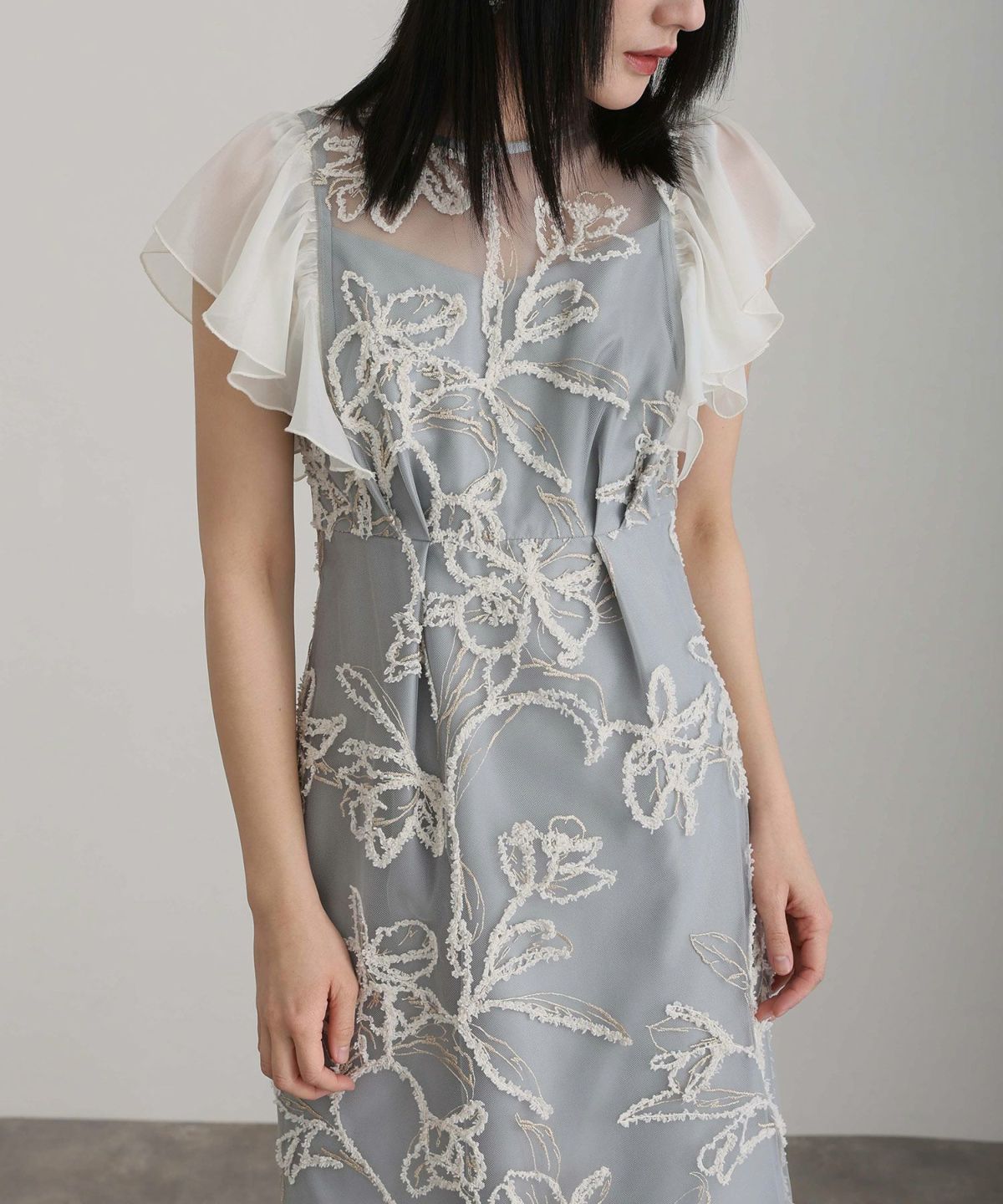 立体感のあるラメ糸を使用した刺繍が華やかな存在感を放つ一着。