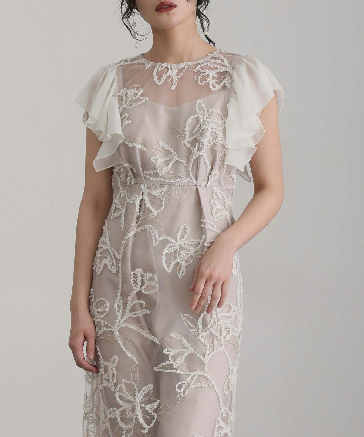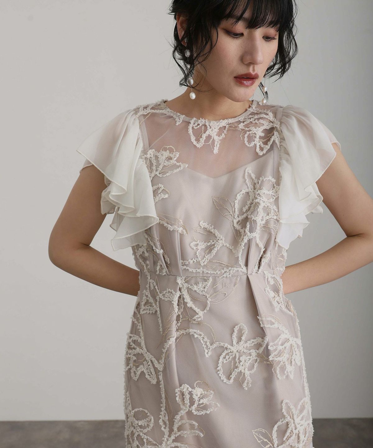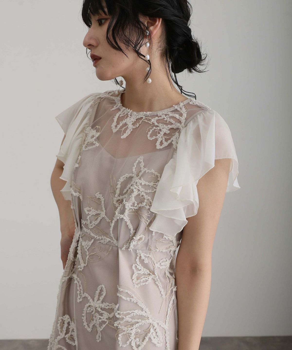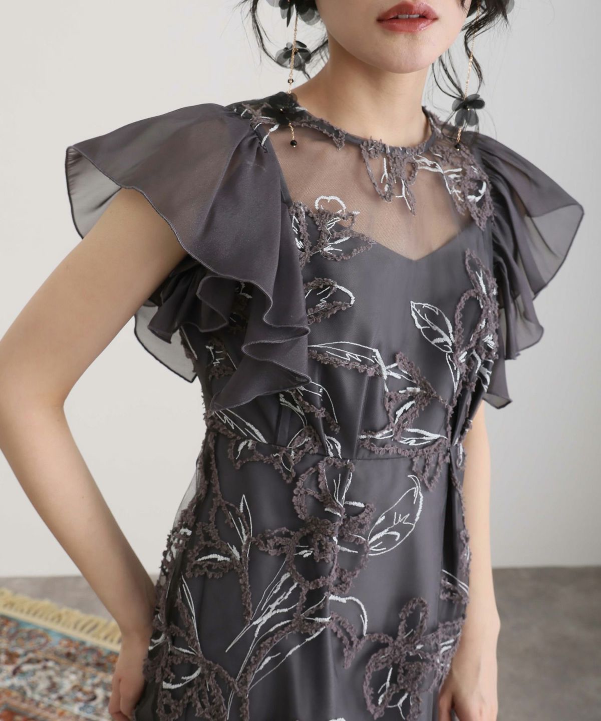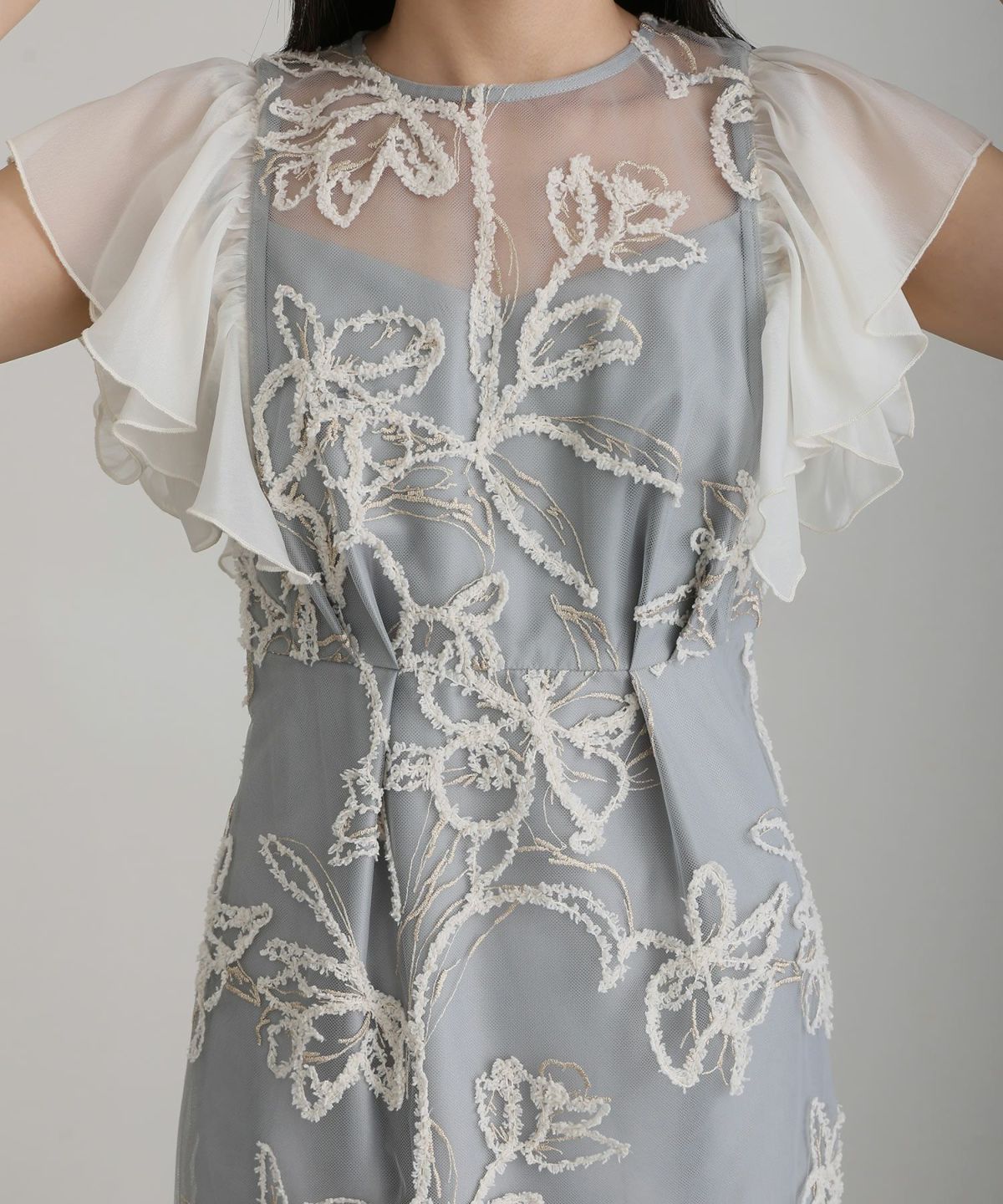 立体感のあるラメ糸を使用した刺繍が華やかな存在感を放つ一着。