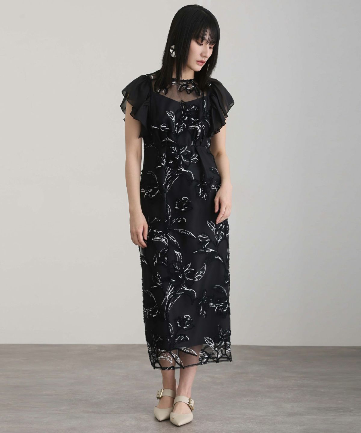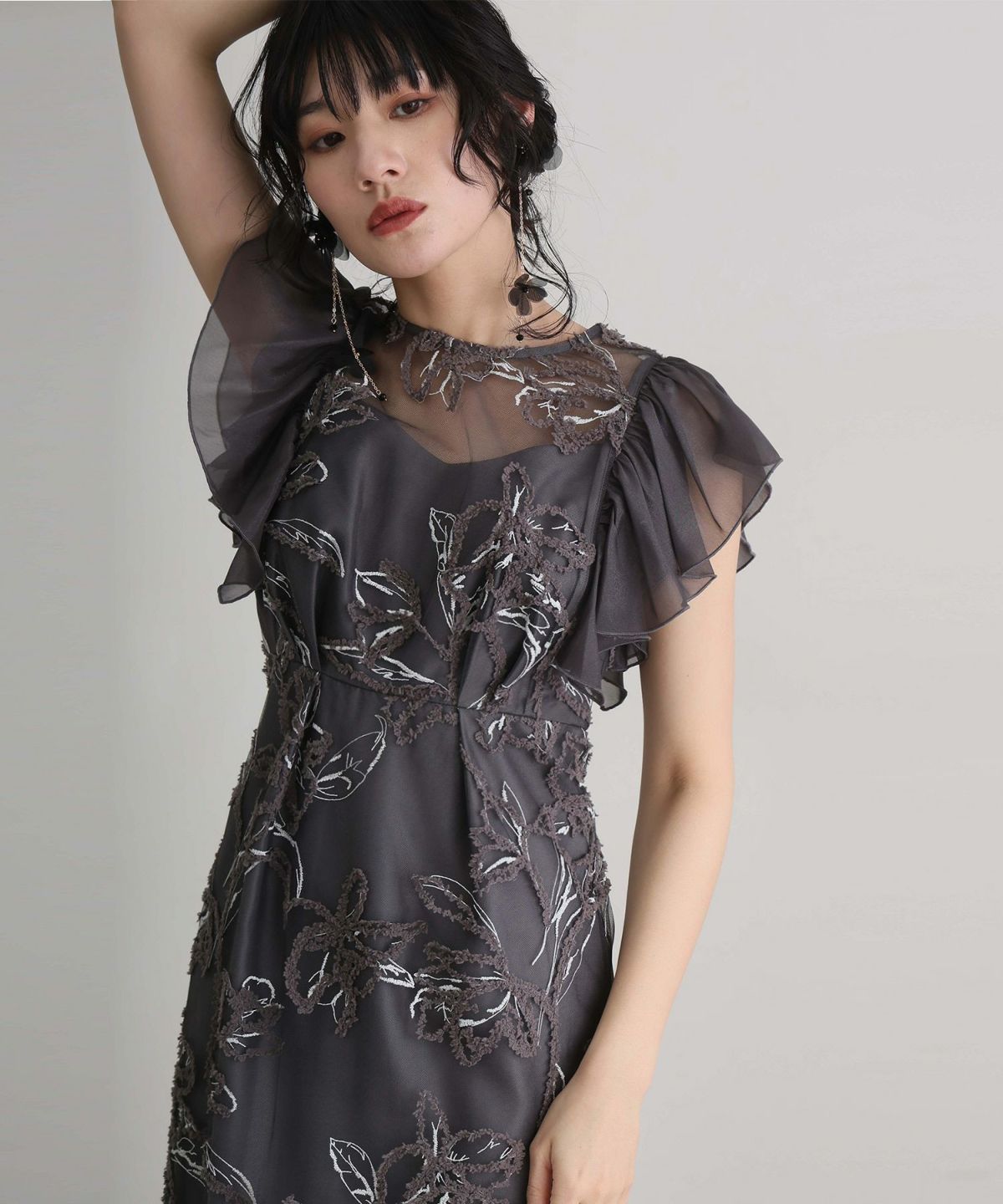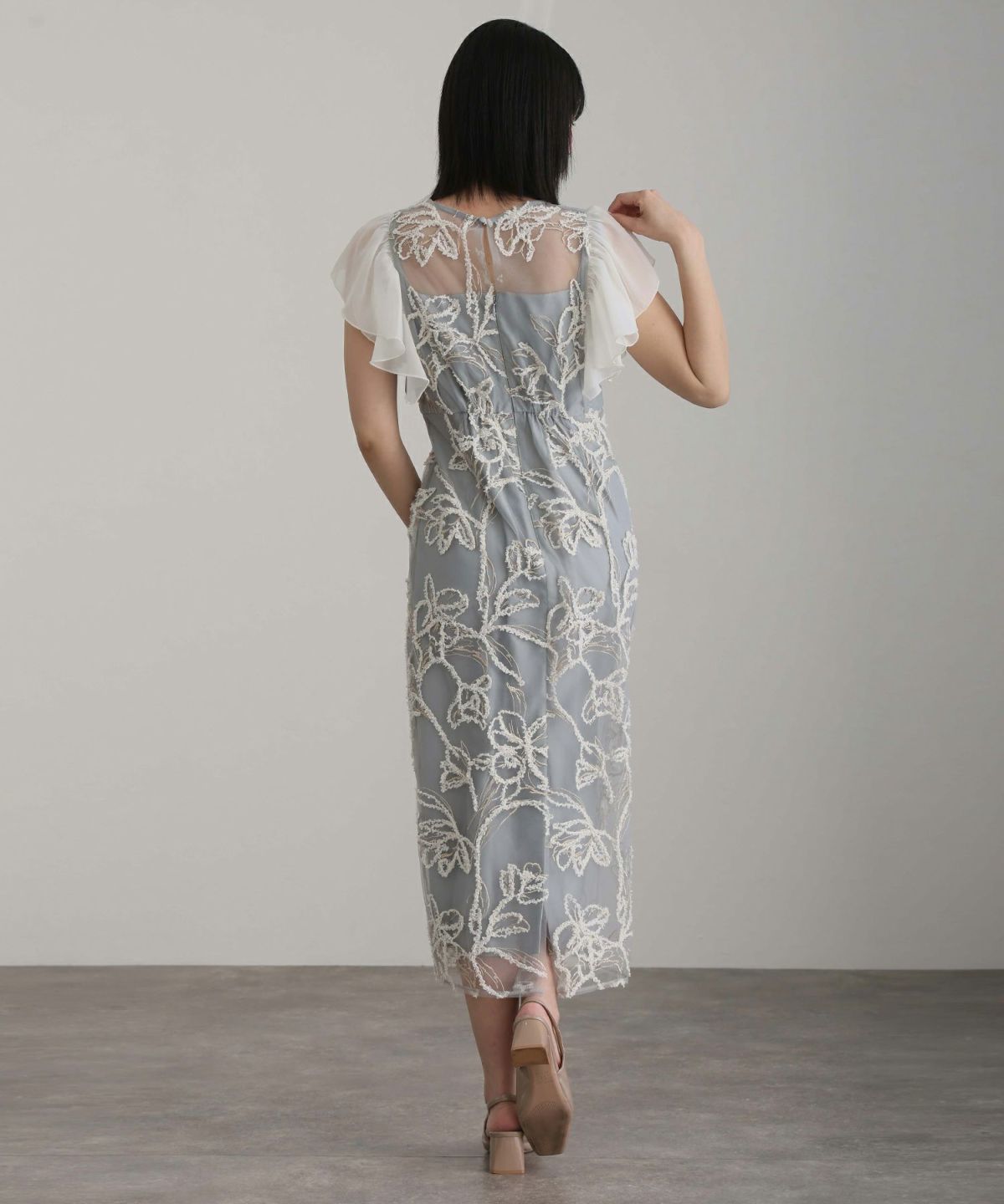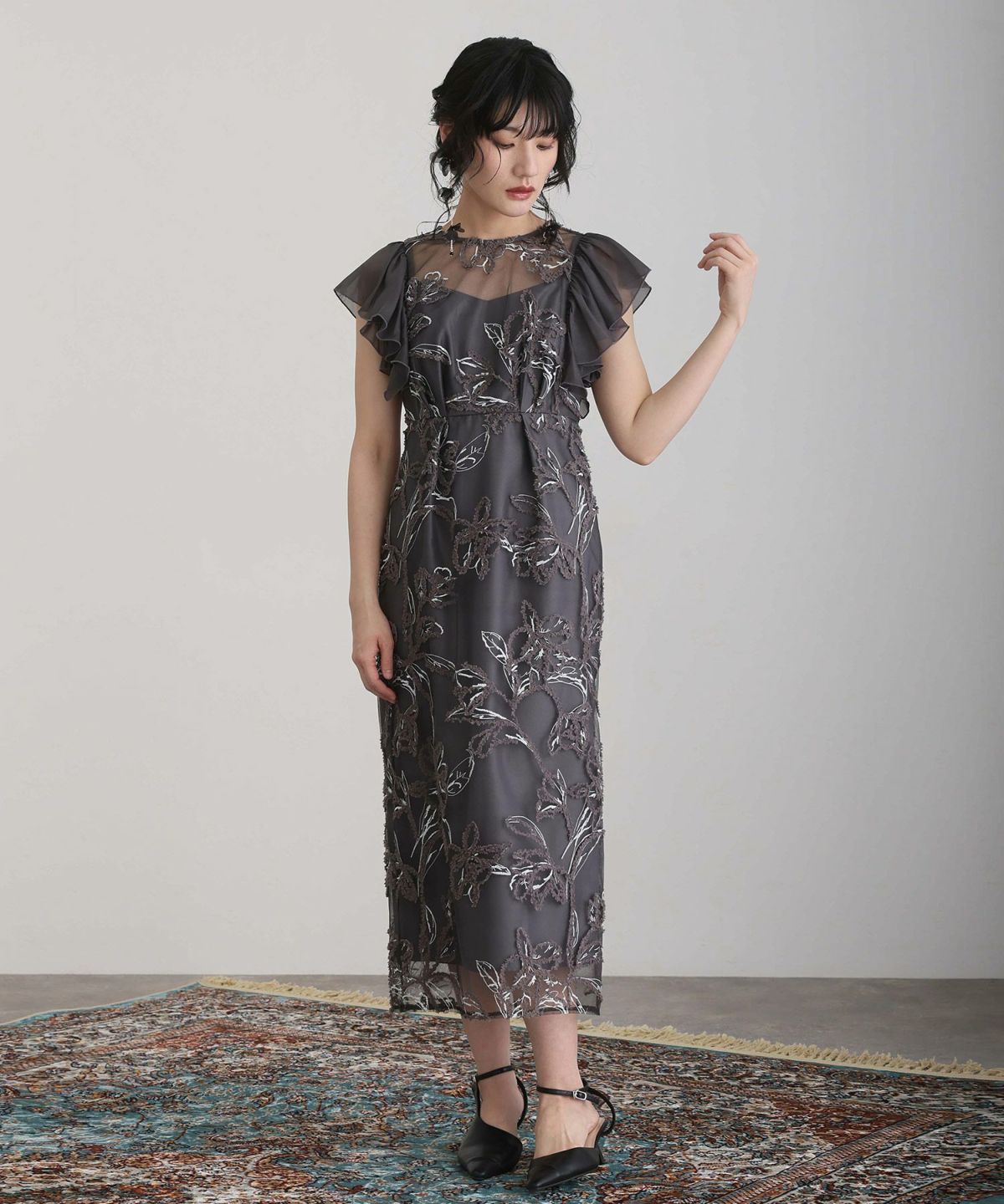 立体感のあるラメ糸を使用した刺繍が華やかな存在感を放つ一着。