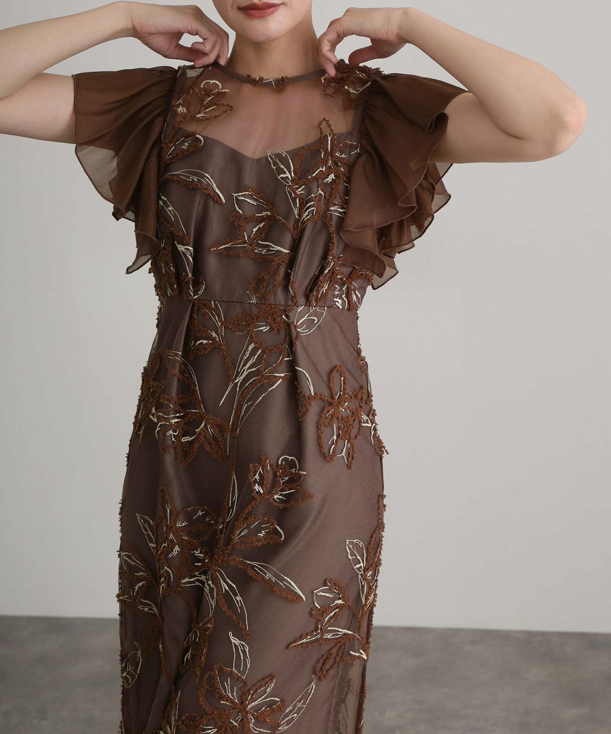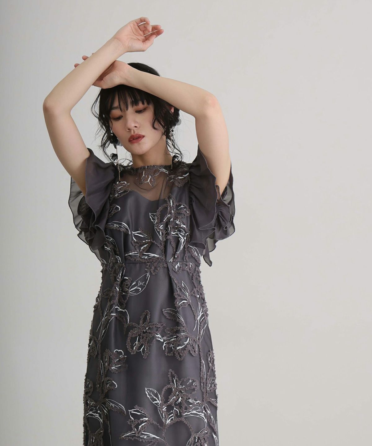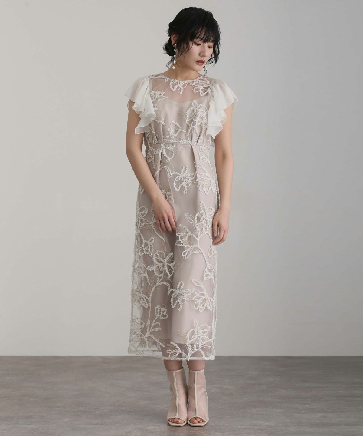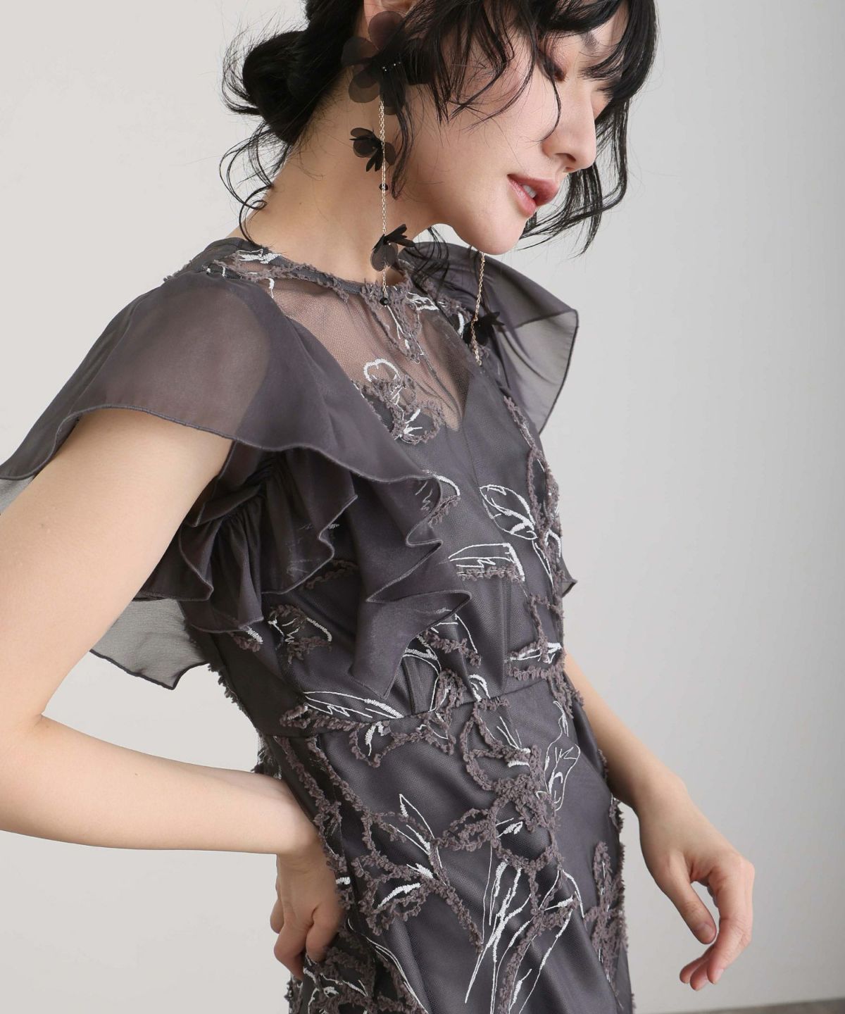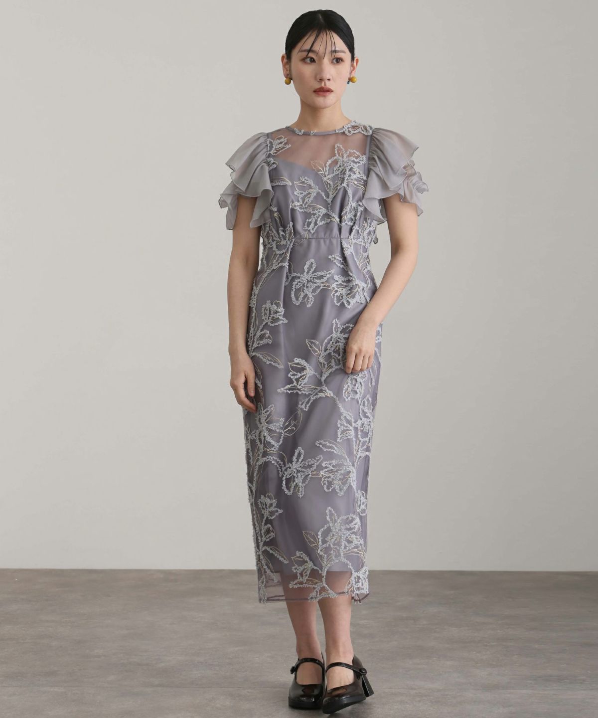 立体感のあるラメ糸を使用した刺繍が華やかな存在感を放つ一着。