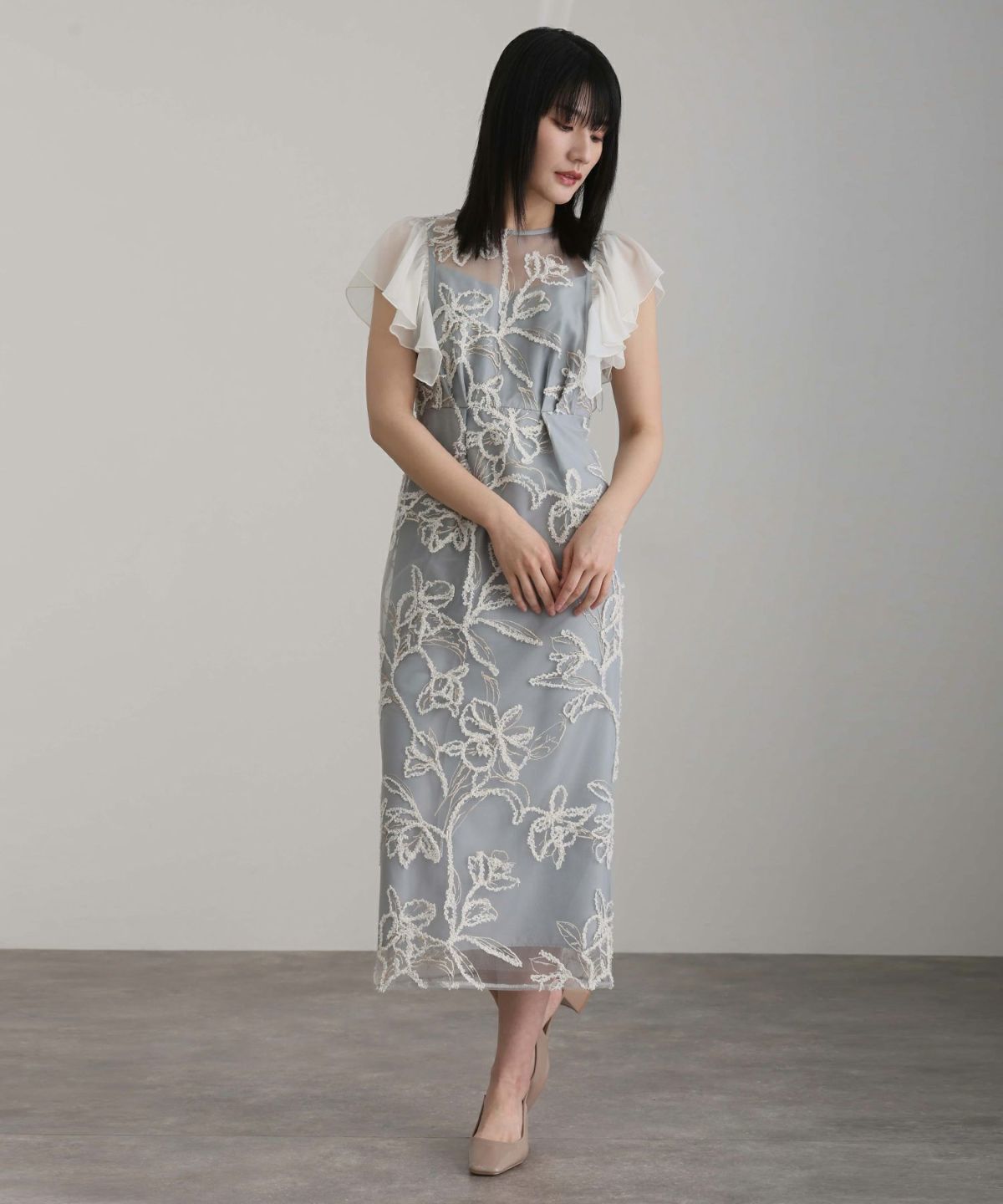 軽やかなフレアが動くたびにふんわりと揺れ、優雅さを演出。