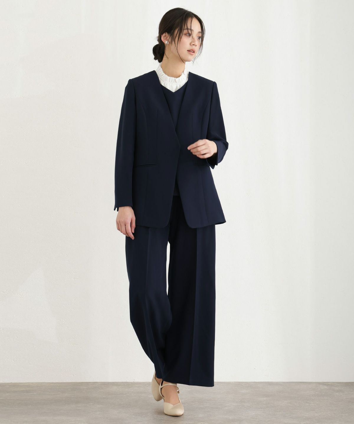 ジャケット、ブラウス2枚、パンツの4点セットで多彩なコーデを楽しめます。