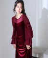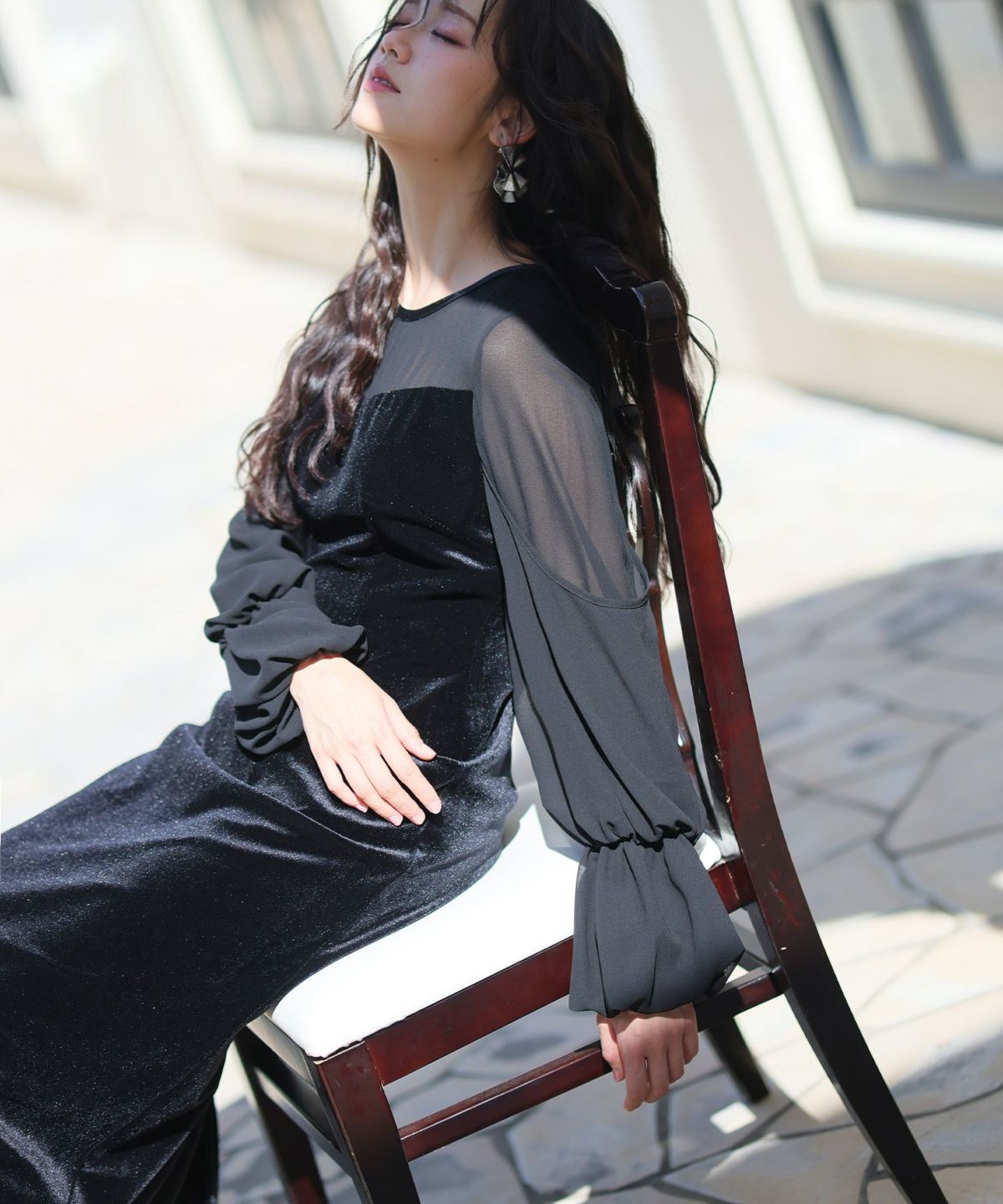 上質なベロアとシフォン素材を組み合わせたフレアドレス。