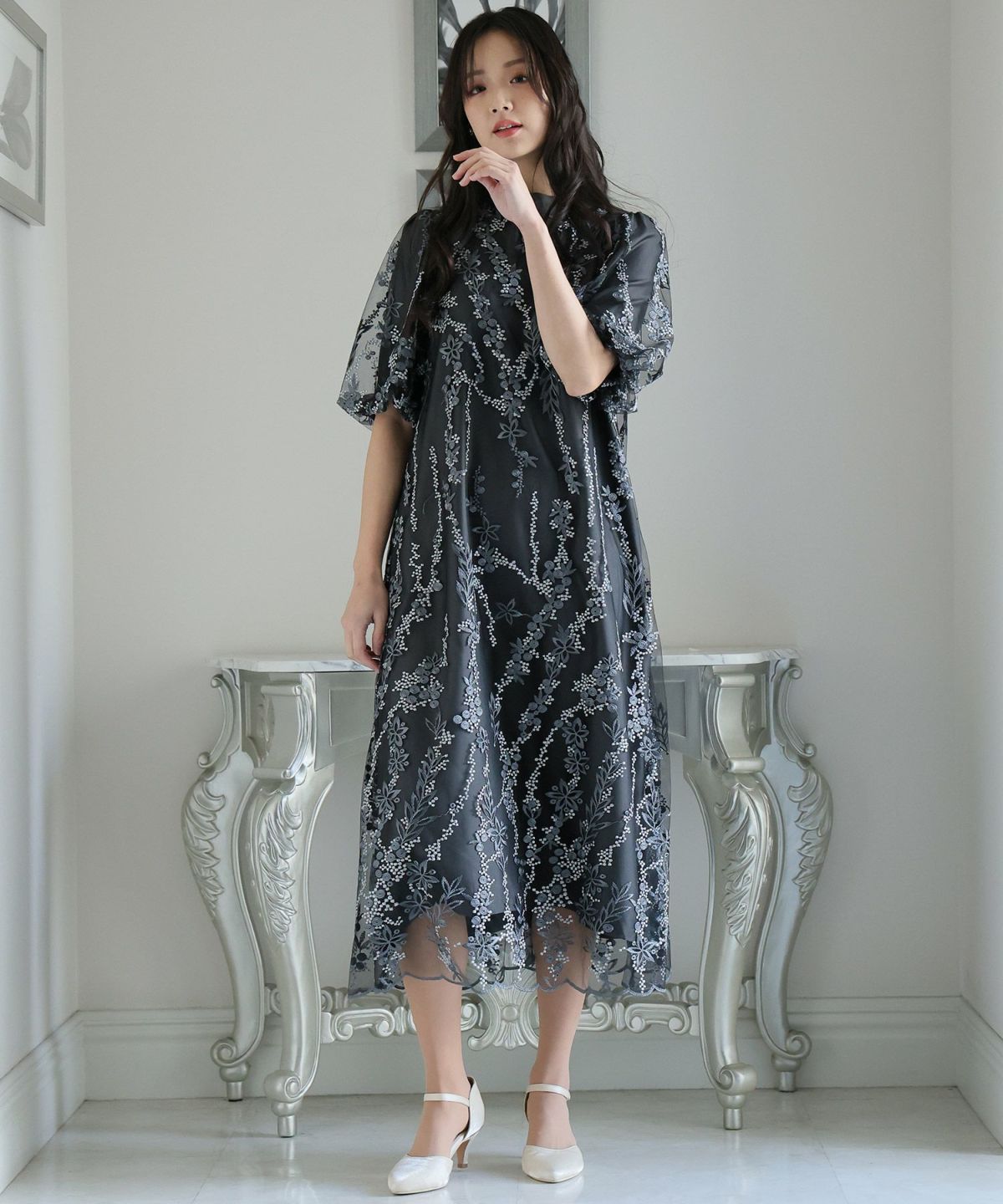 軽やかなチュールに施された美しい刺繍が、特別な日の装いにぴったりの一着。