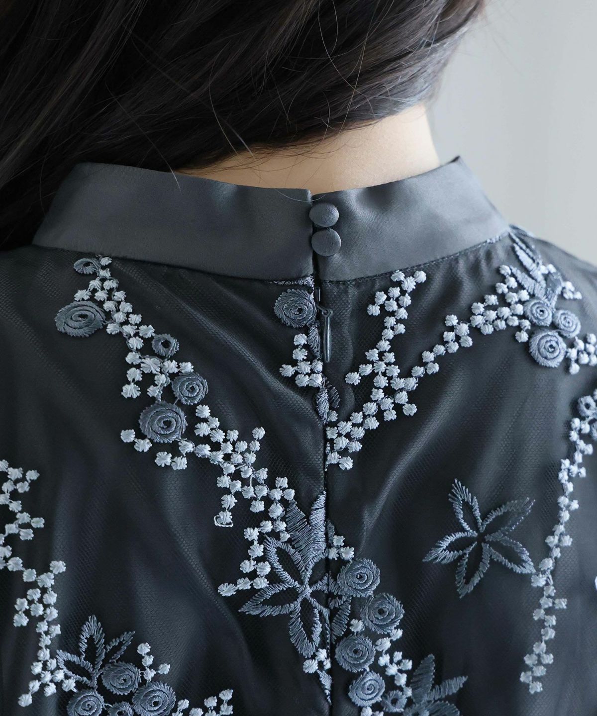 軽やかなチュールに施された美しい刺繍が、特別な日の装いにぴったりの一着。