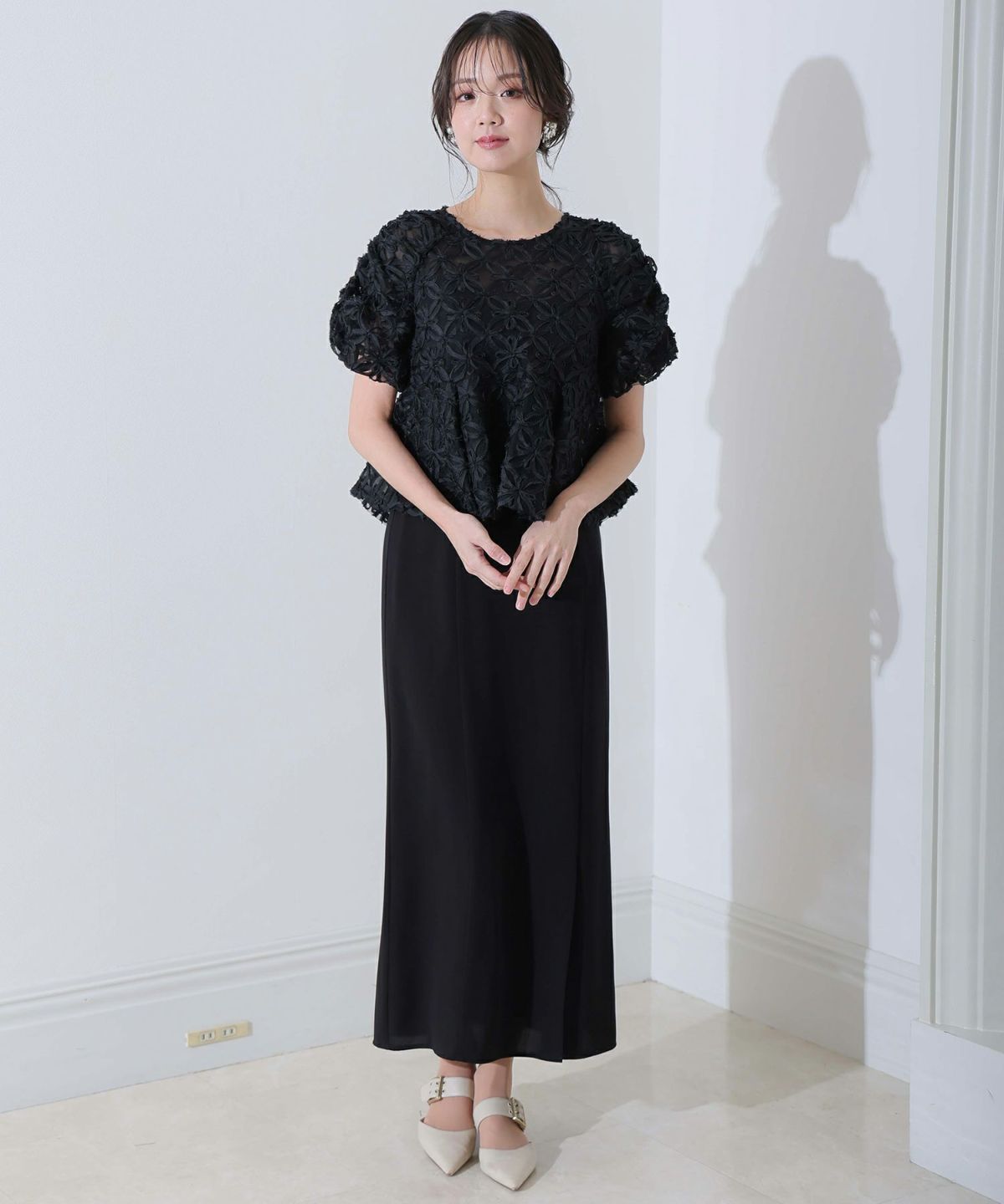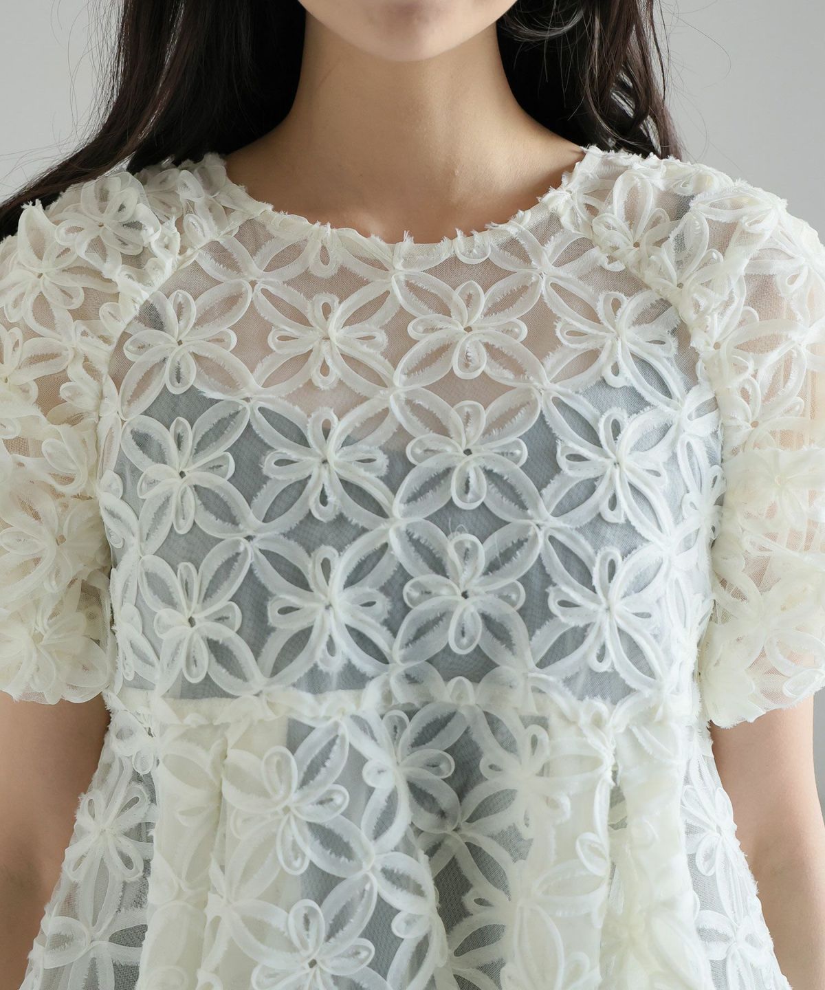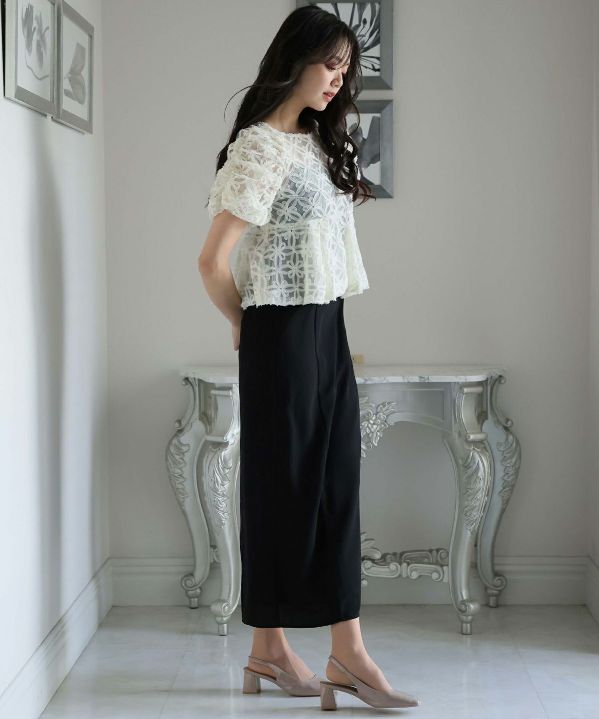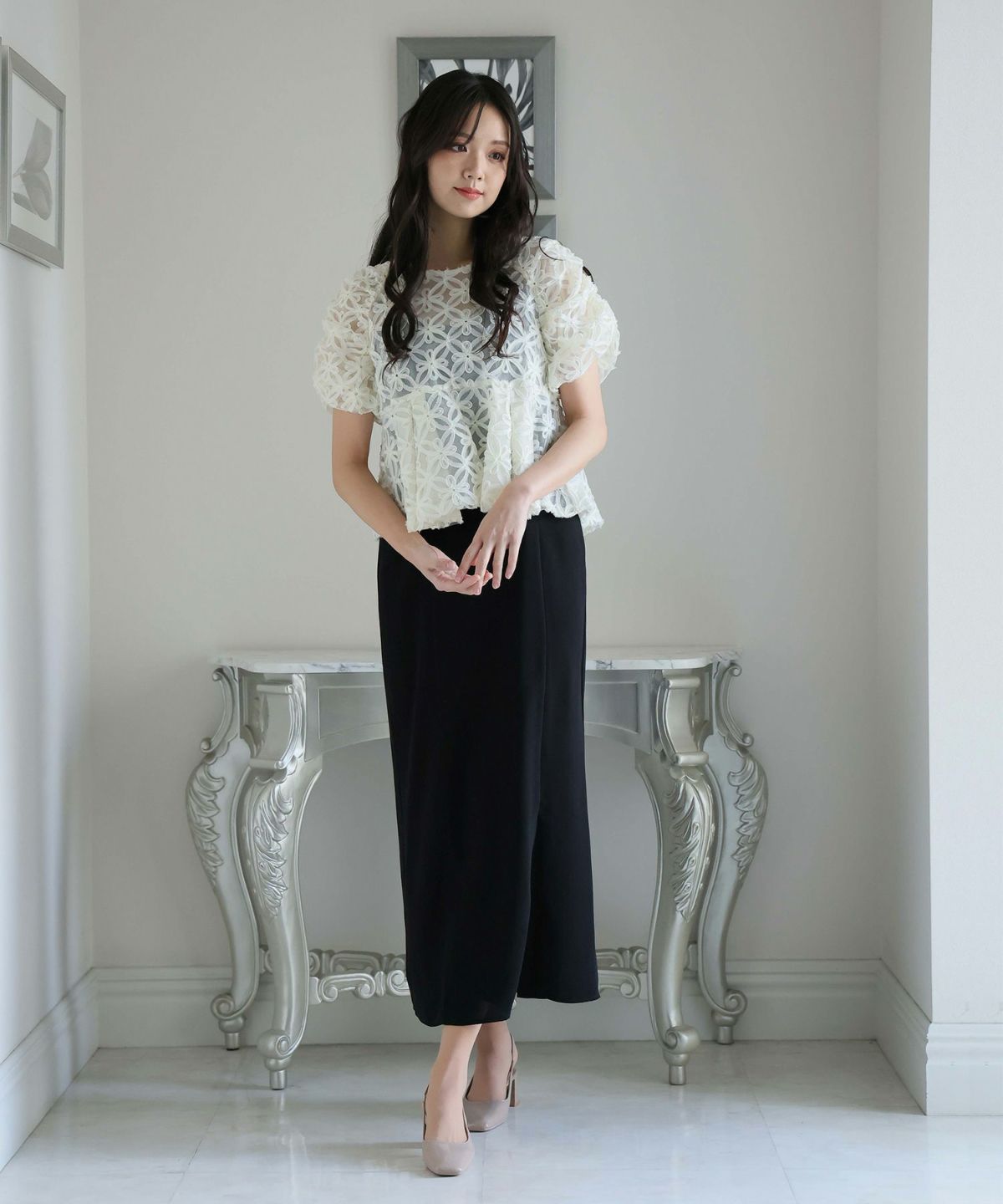 繊細な刺繍のトップスが目を引く上品なデザイン。