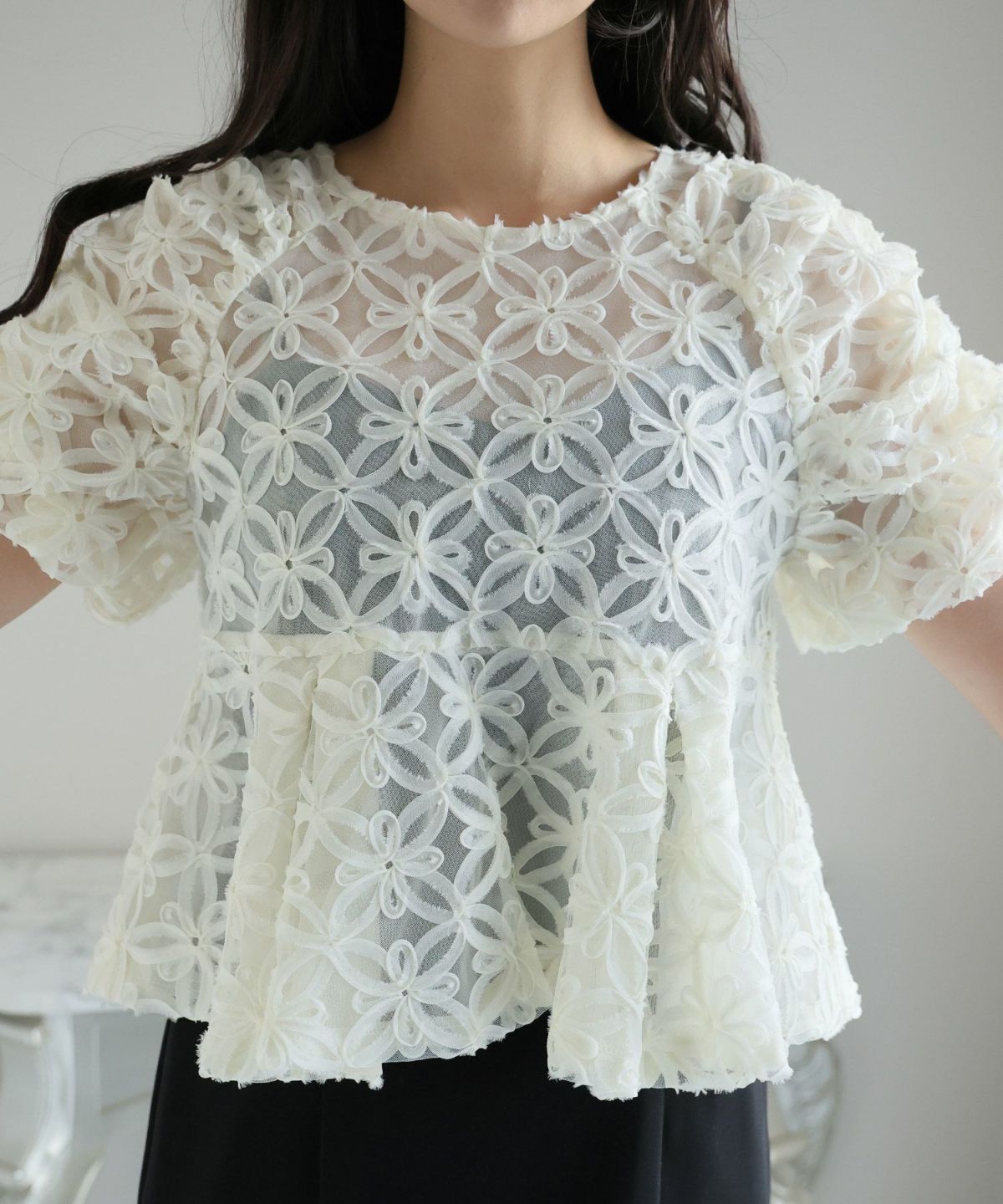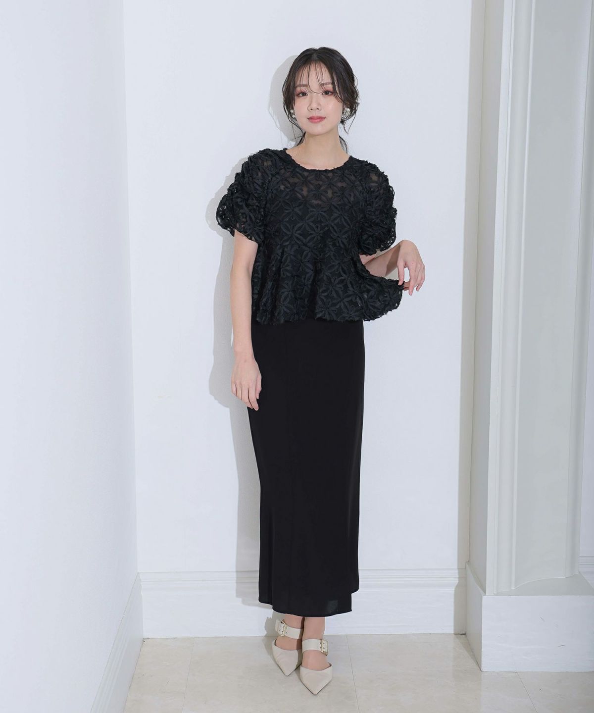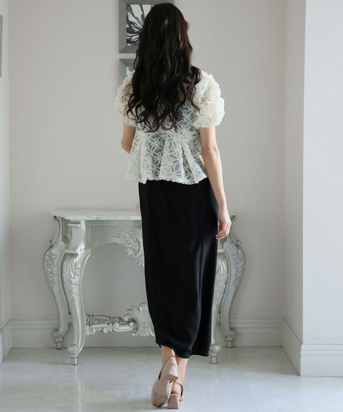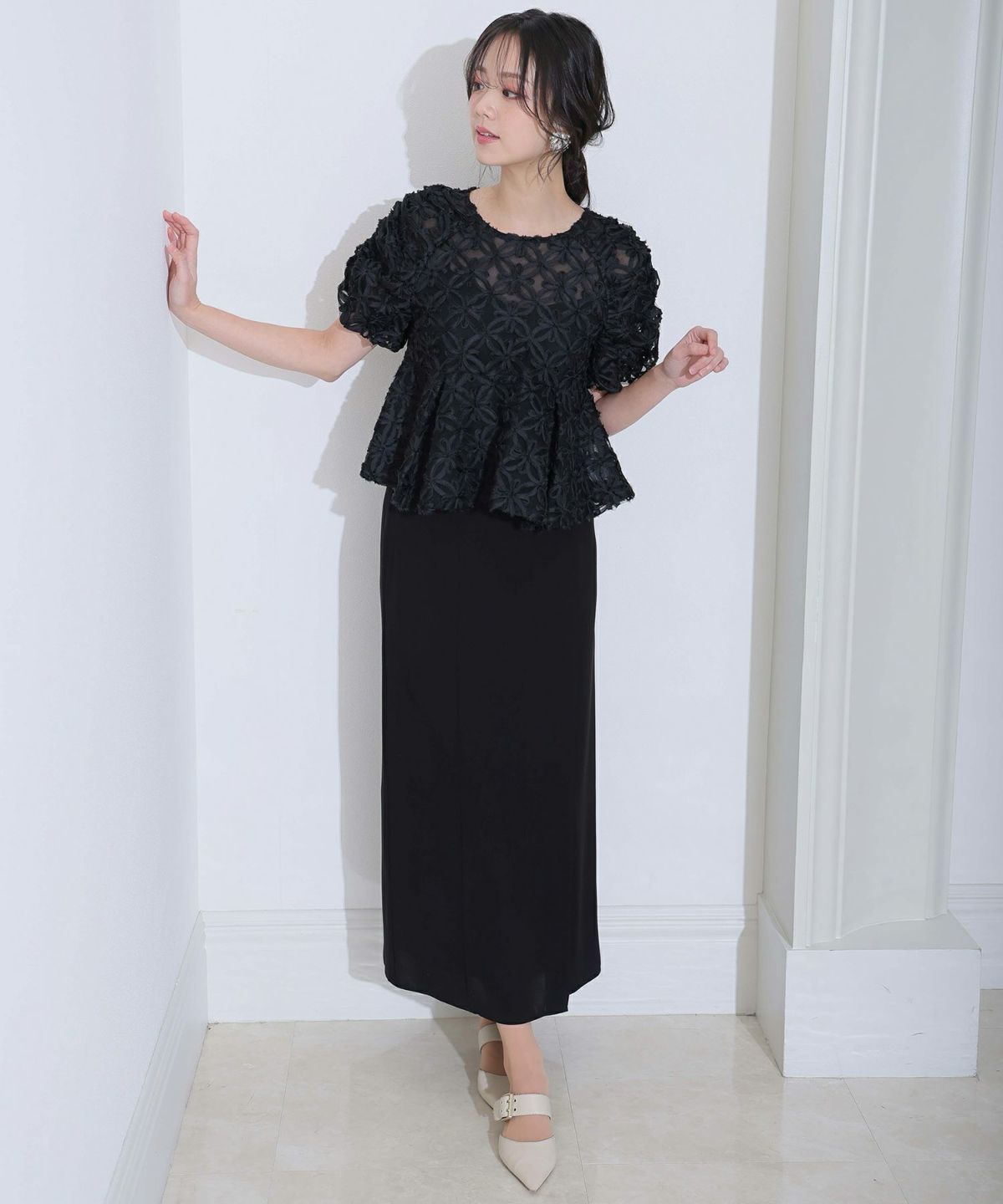 繊細な刺繍のトップスが目を引く上品なデザイン。