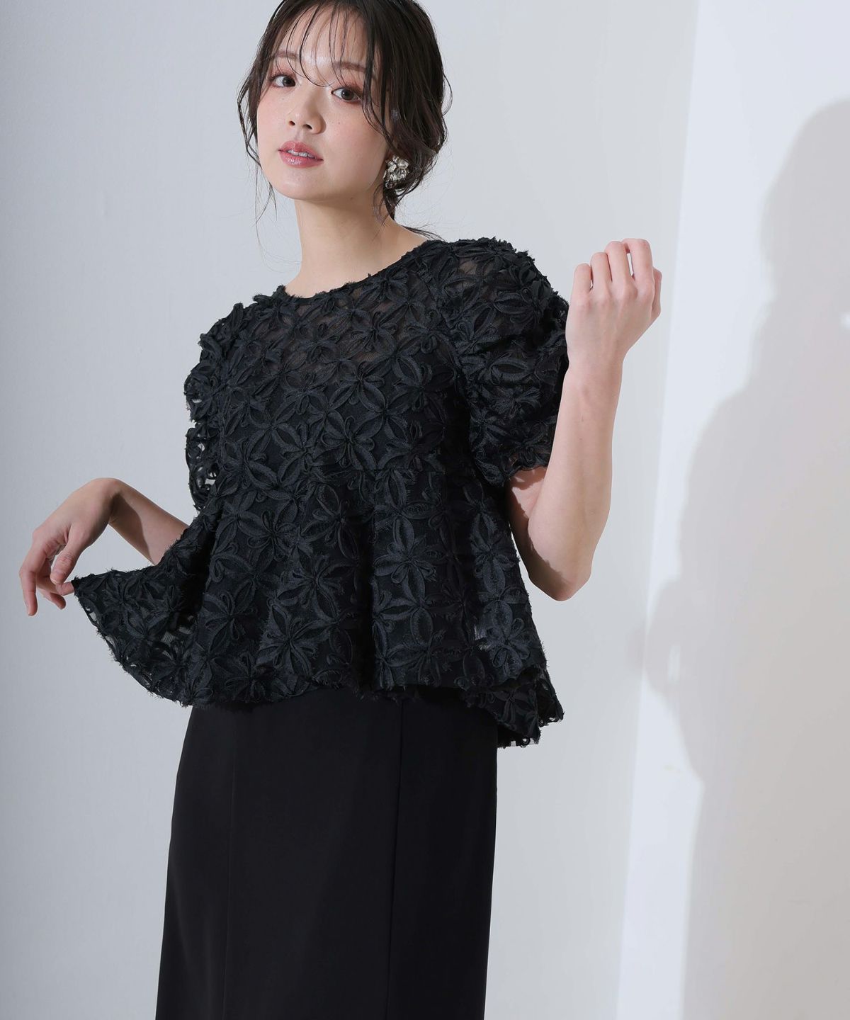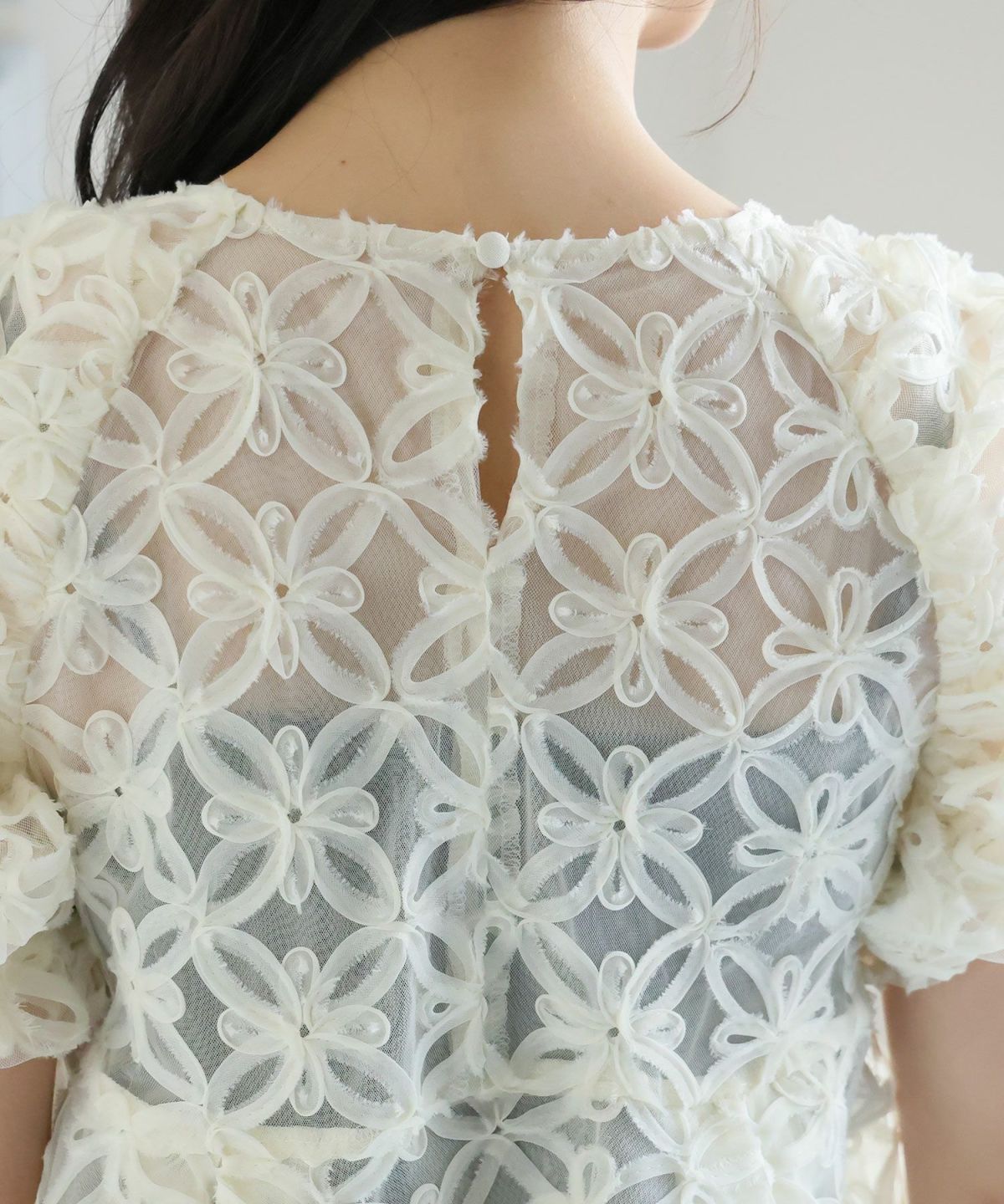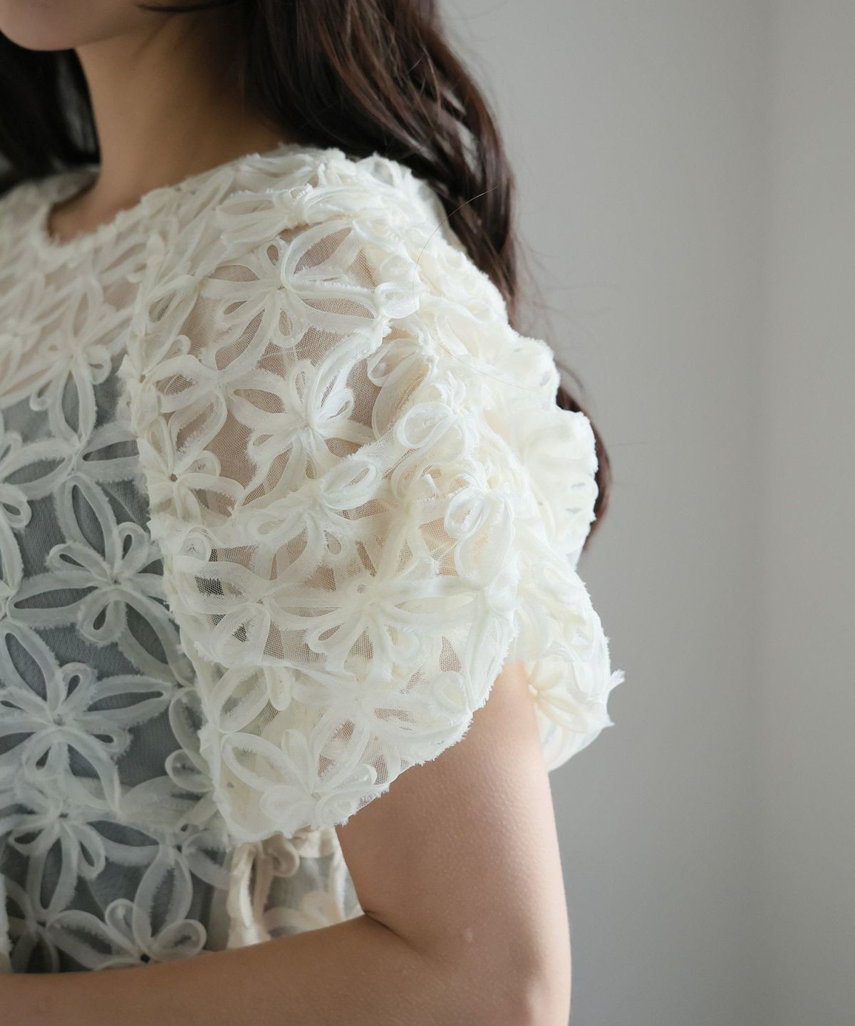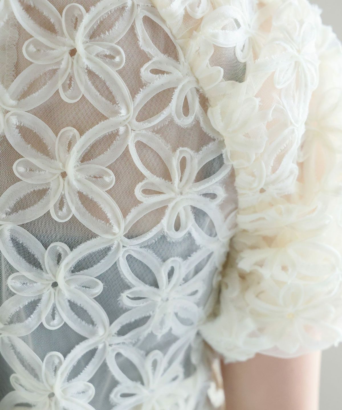 立体感のあるフラワーテープ刺繍が、エレガントな雰囲気を演出。