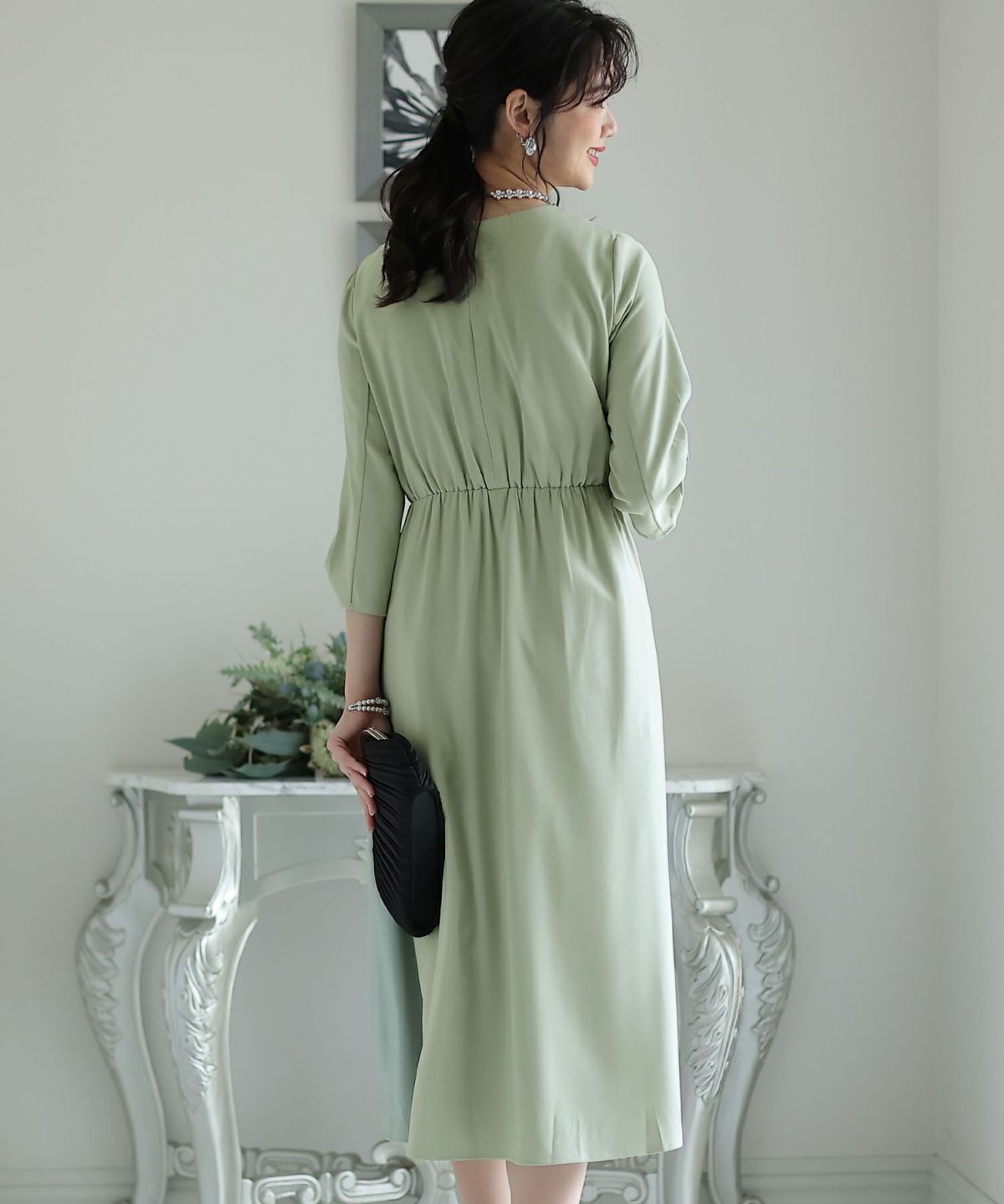 ■体のラインが気にならないシルエット体型カバーポイント:【二の腕】【脚】【ウエスト】【ヒップ】フロントがツイストされていて、気になるウエストをさり気なくカバーしてくれます。首をすっきり見せてくれるシンプルなVネックで、どんなネックレスでもあわせやすい♪