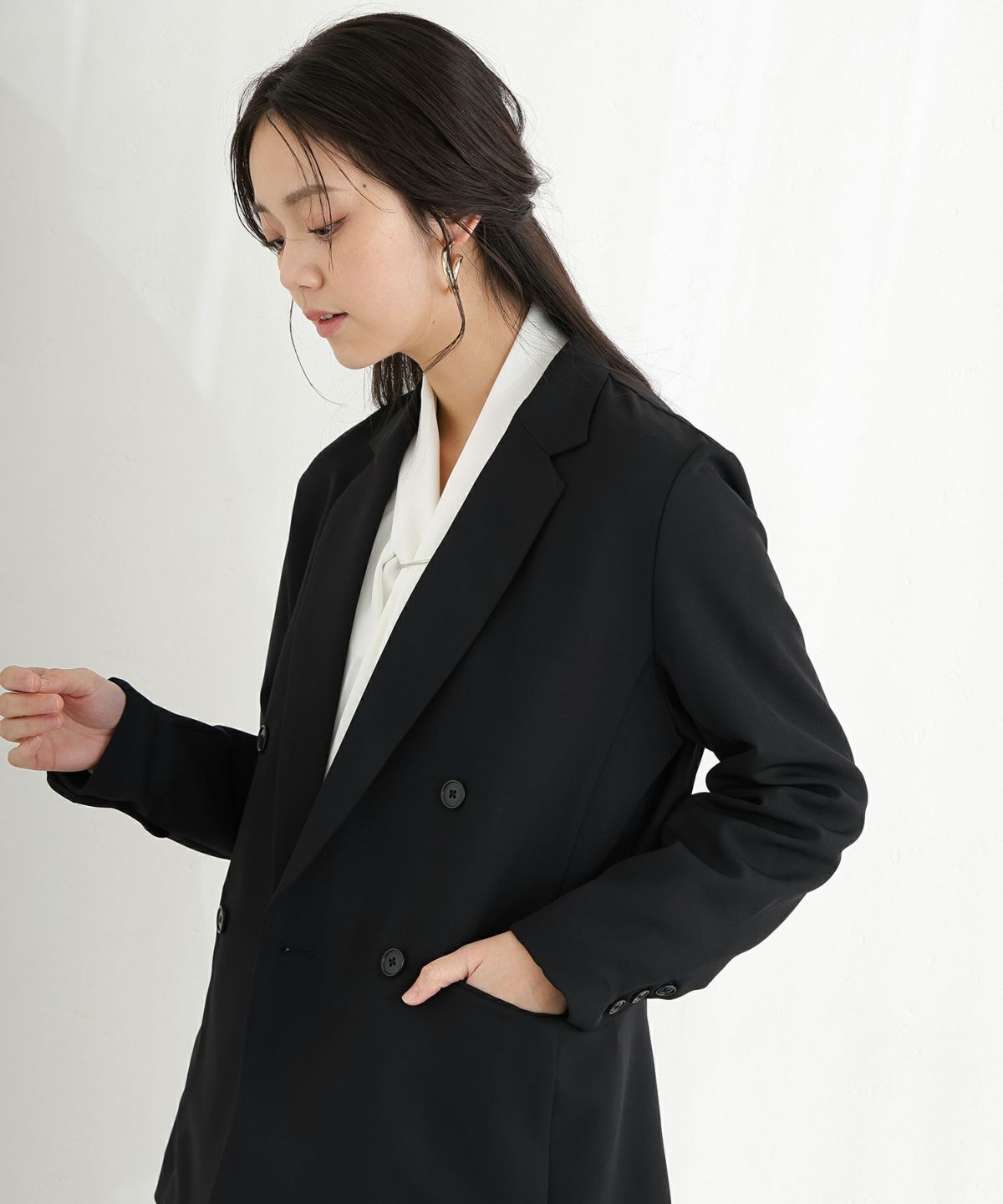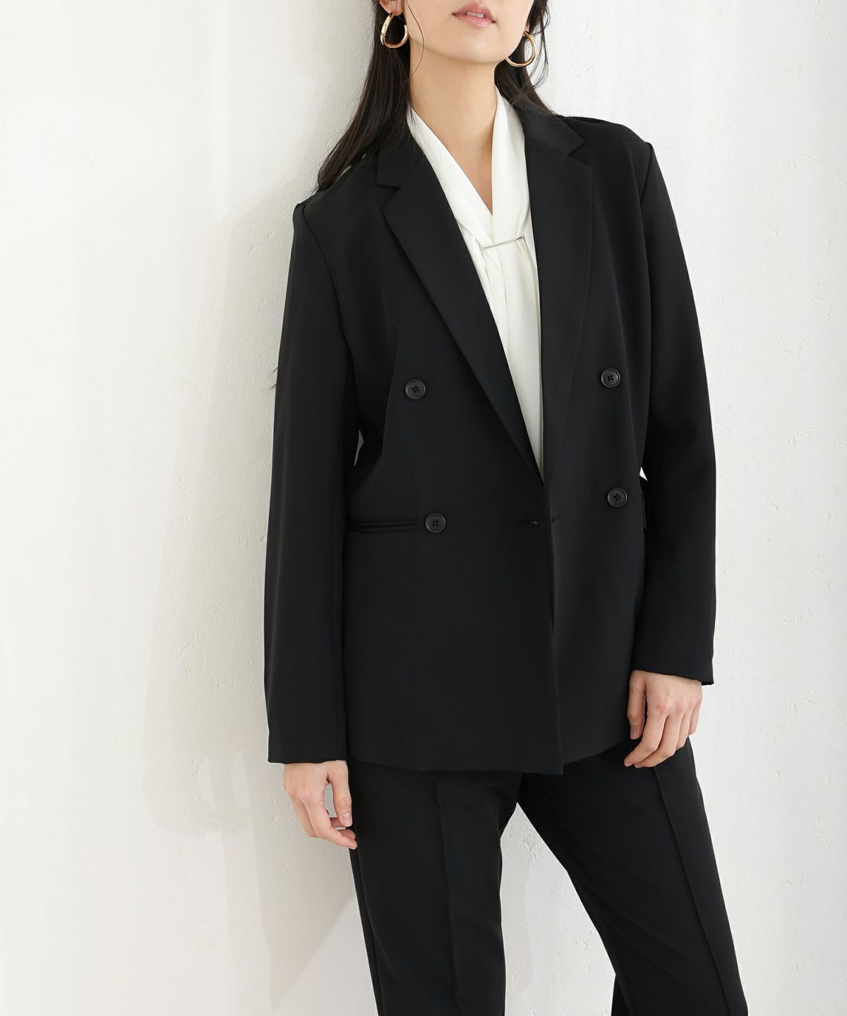 ダブルカラーのジャケットと美しいセンタープレスパンツでスタイリッシュな印象に。
