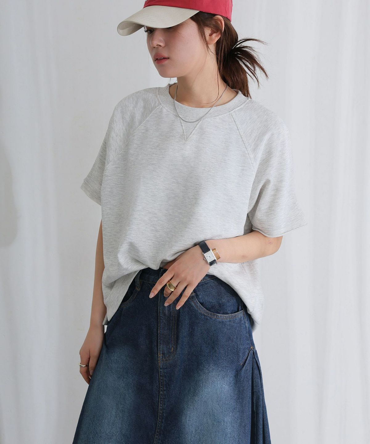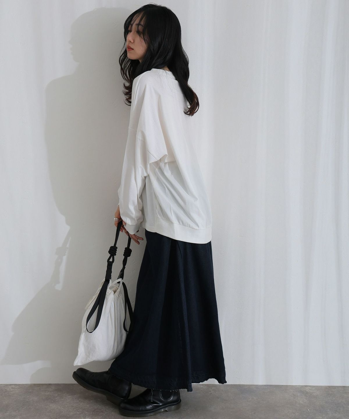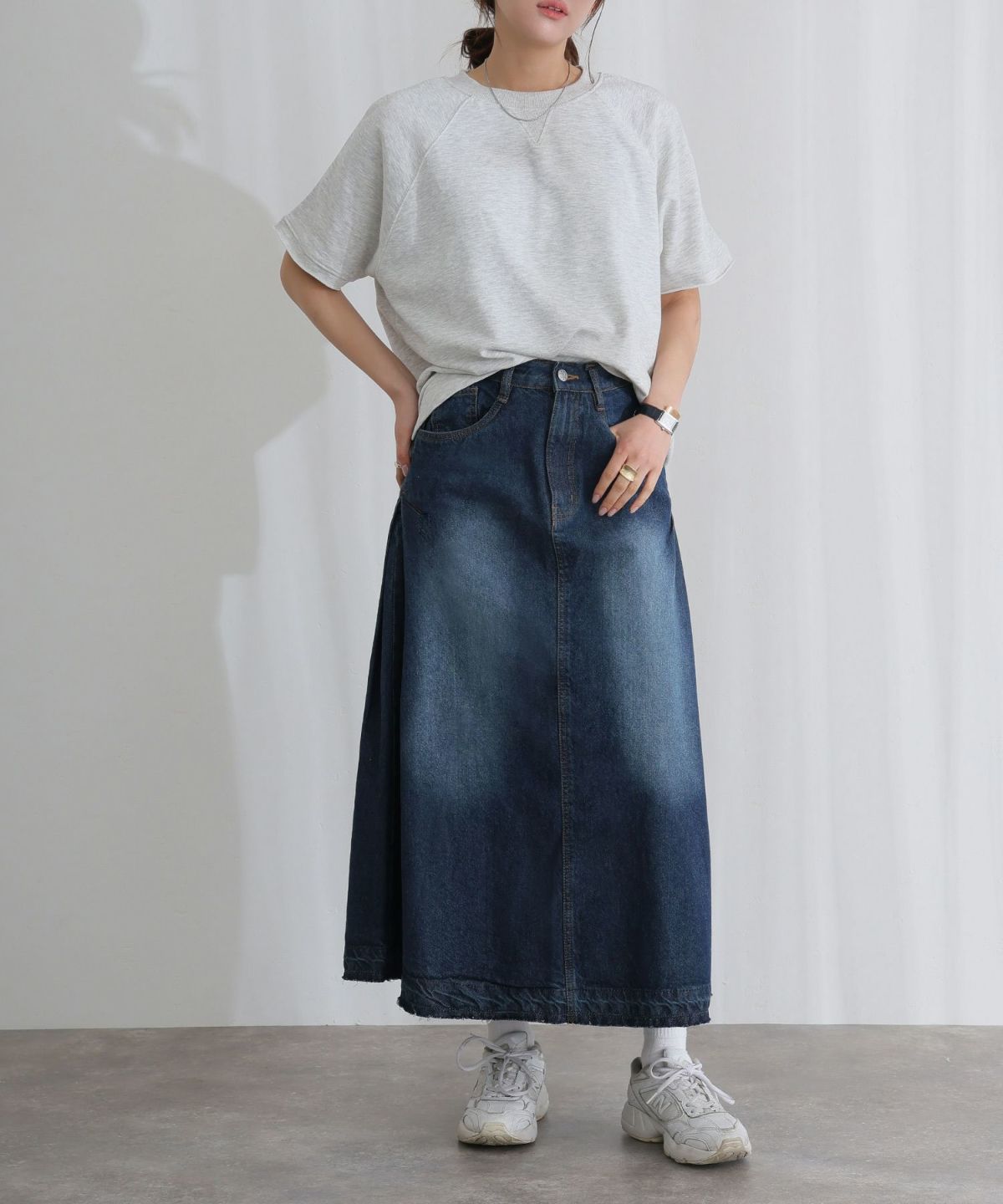 サイドにタックが入ったデザインが、シンプルなデニムスカートに立体感と動きを加えています。