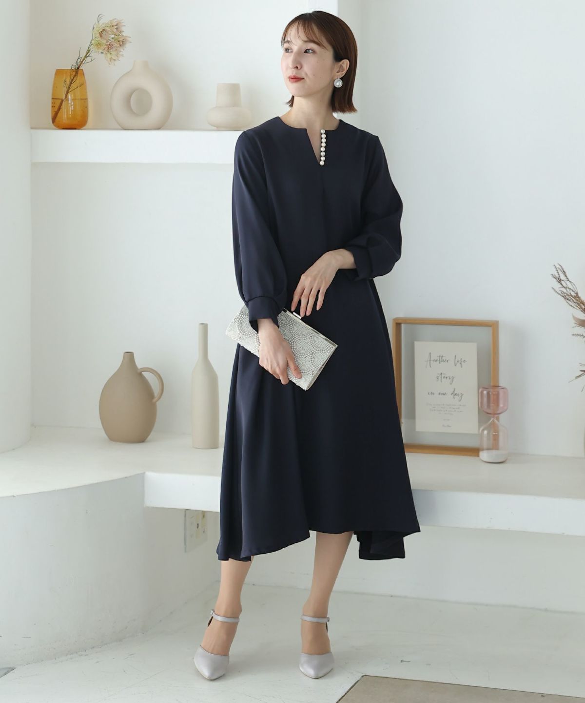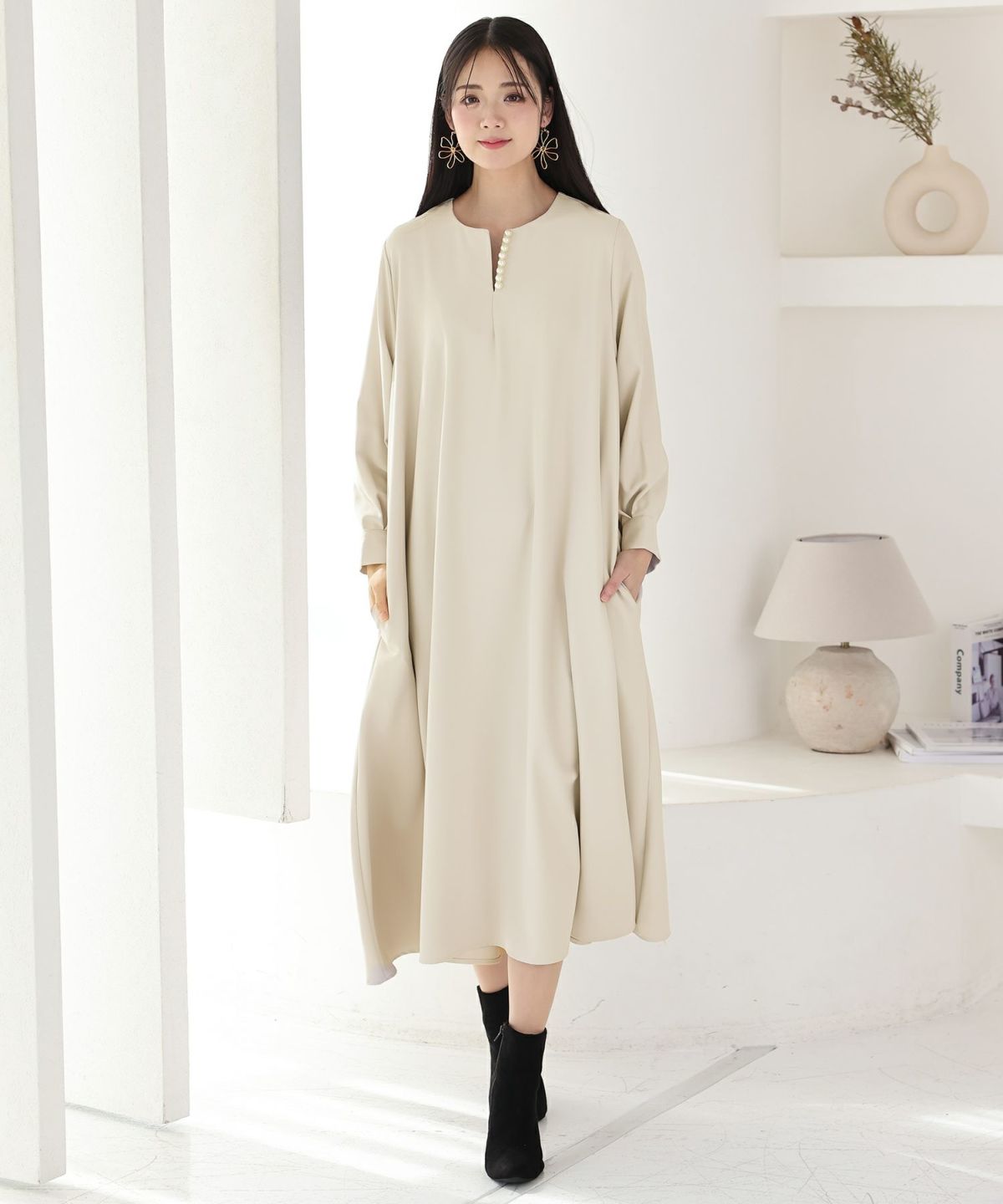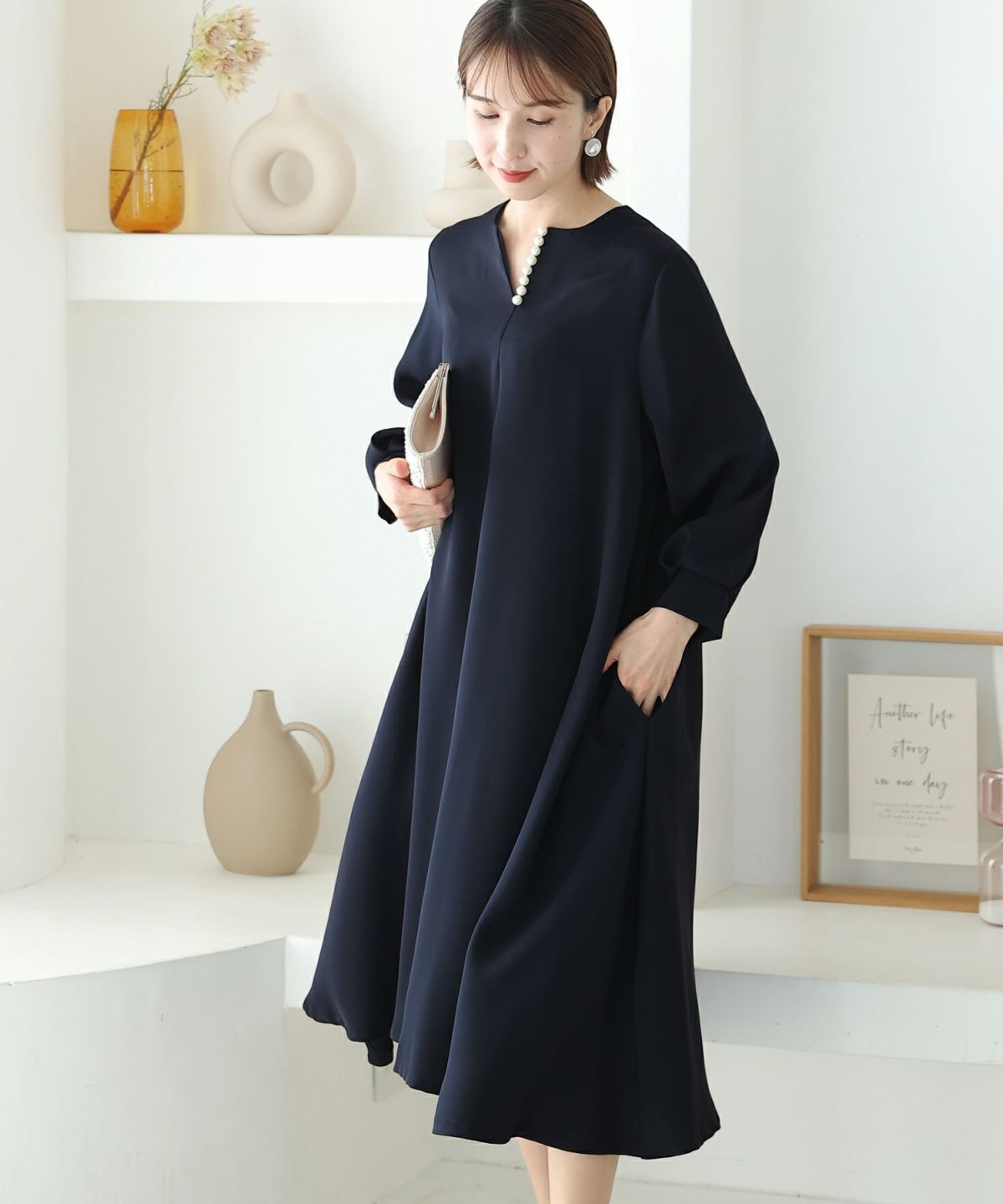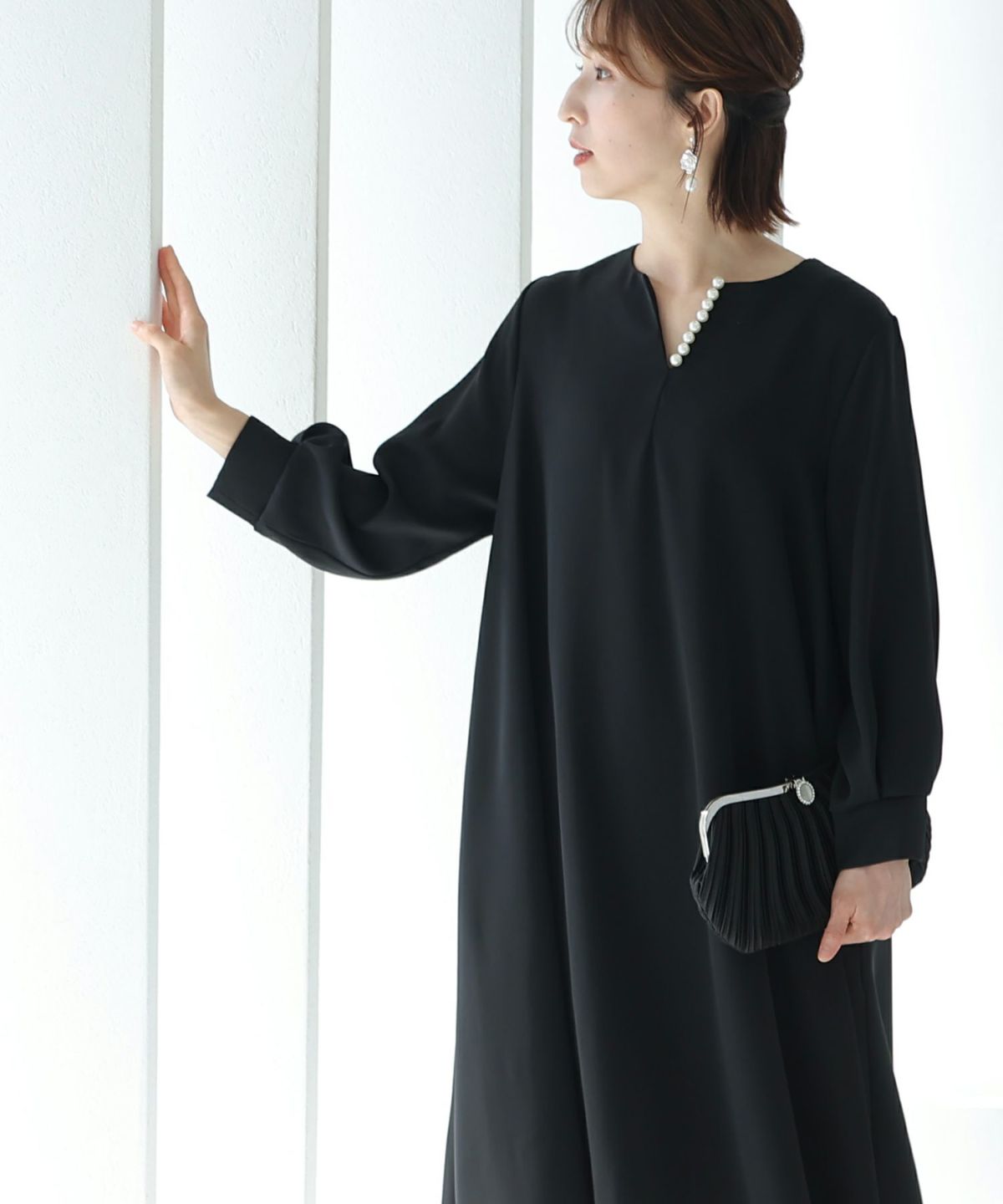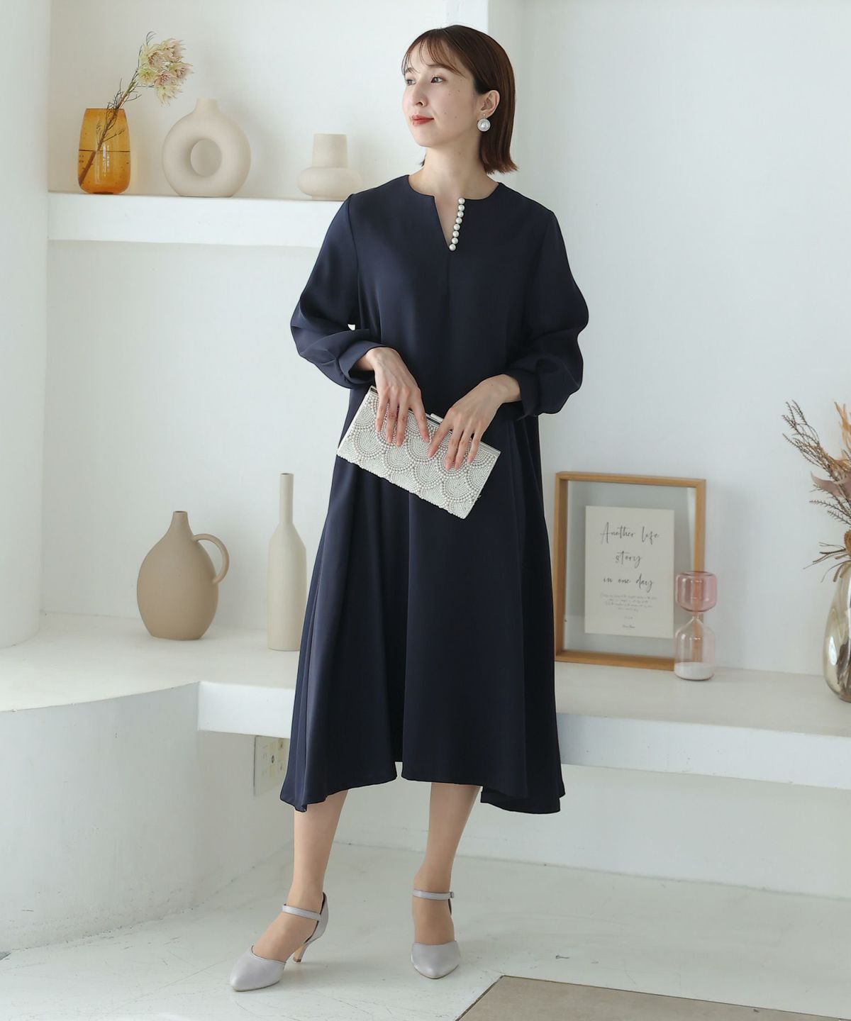 ■パール×キーネックフロントのパール使いが華やかなワンピース。シンプルなデザインで洗練された大人な女性を演出します。ストンと落ち感のきれいなシルエットで上品さもプラス。オケージョンはもちろん、特別な日のお出かけにもおすすめです。