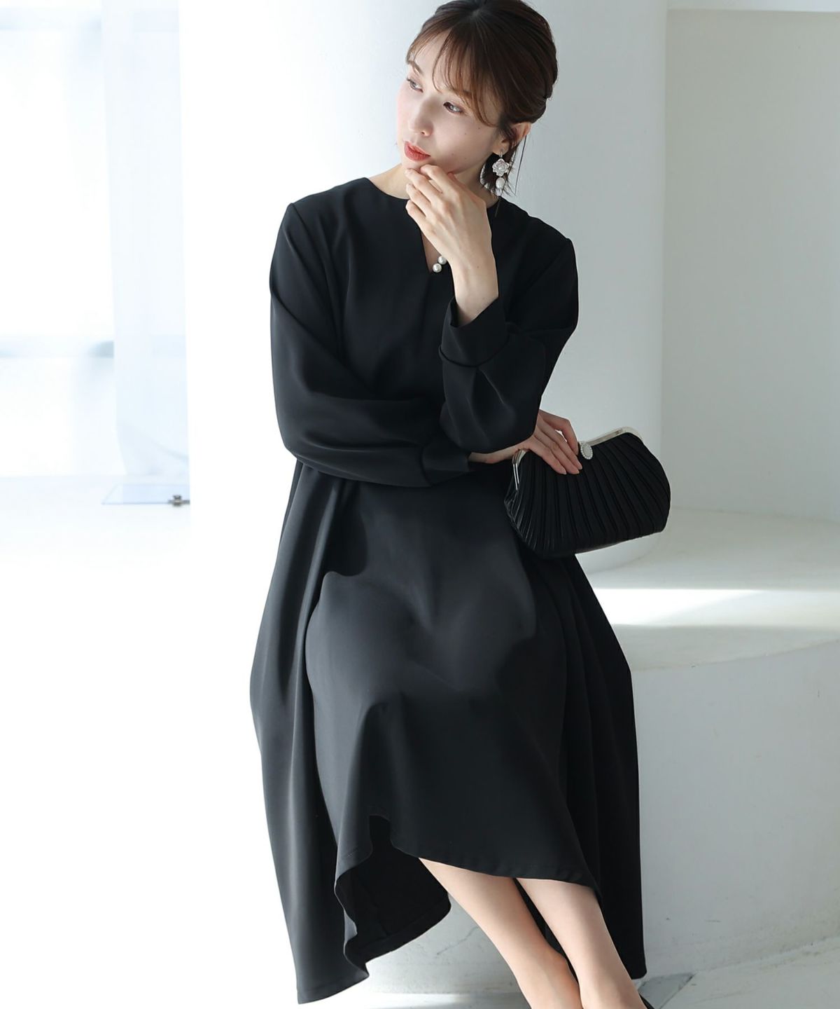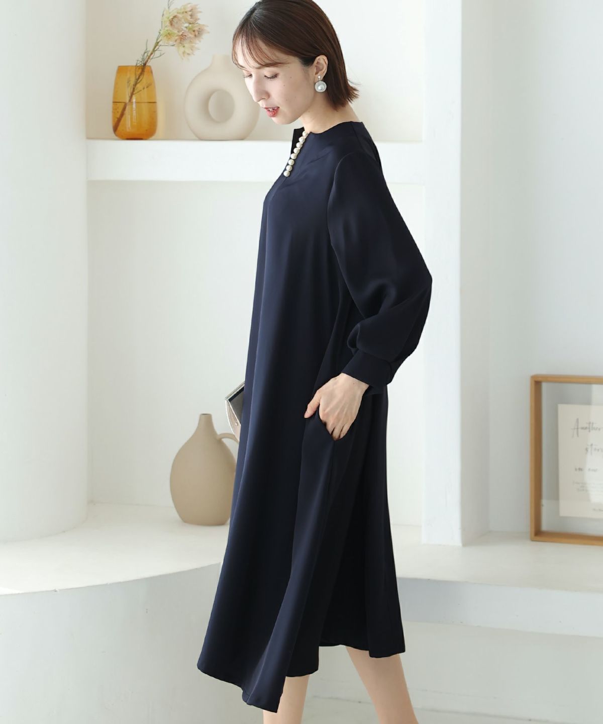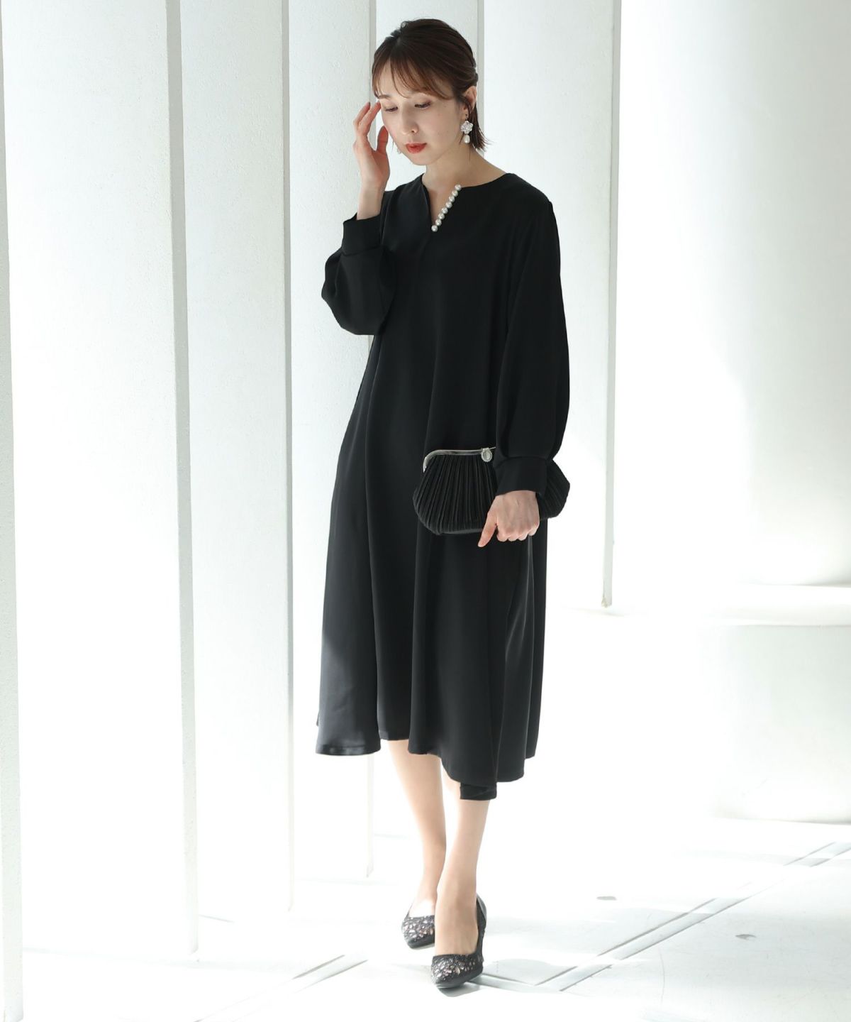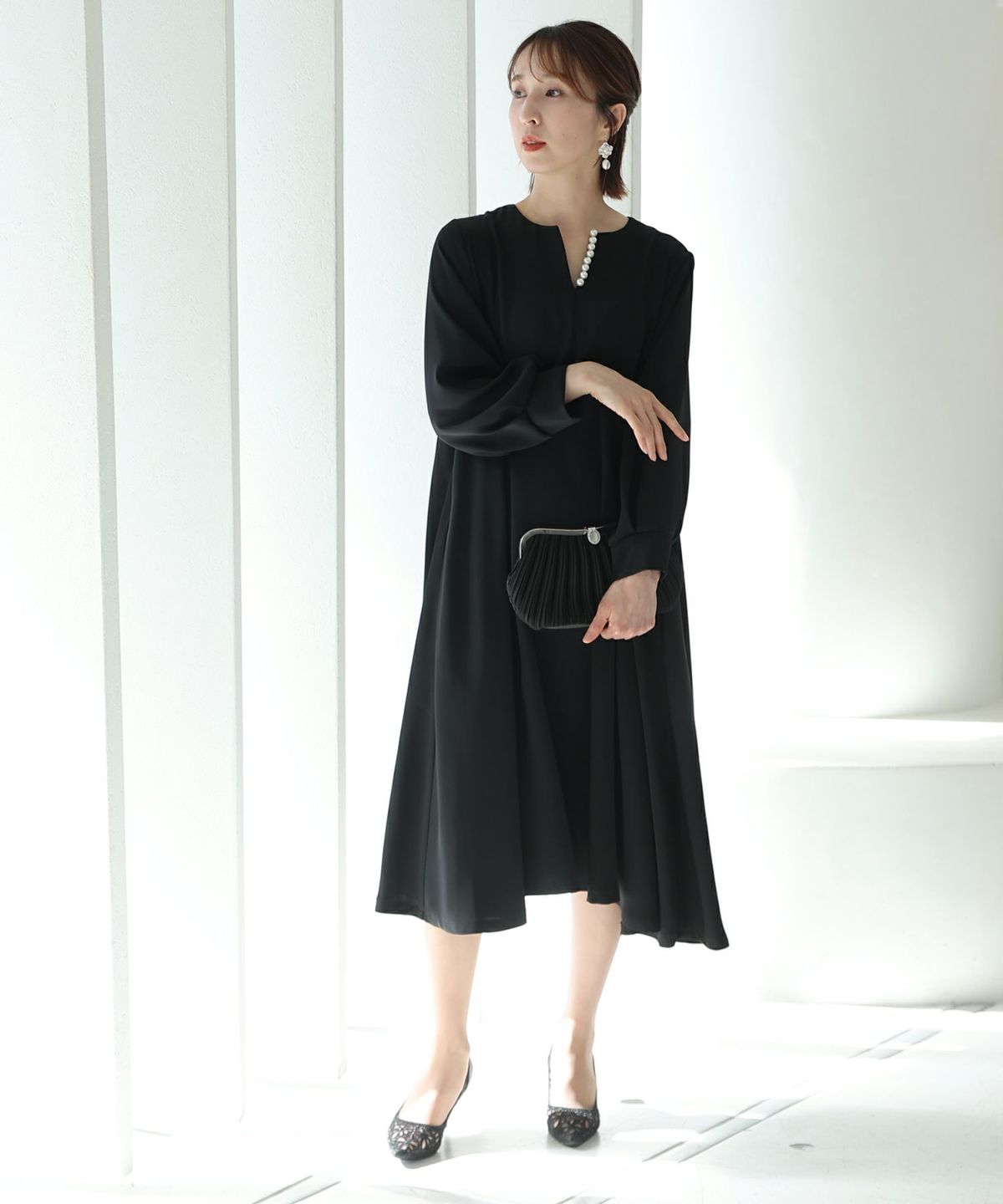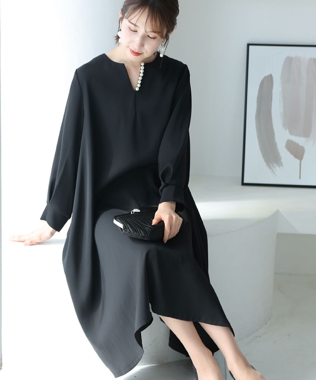 ■パール×キーネックフロントのパール使いが華やかなワンピース。シンプルなデザインで洗練された大人な女性を演出します。ストンと落ち感のきれいなシルエットで上品さもプラス。オケージョンはもちろん、特別な日のお出かけにもおすすめです。