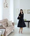 袖有りワンピースなので二の腕カバーが叶い、ウエスト切り替え位置高めのデザインでハイウエスト効果もあり♪