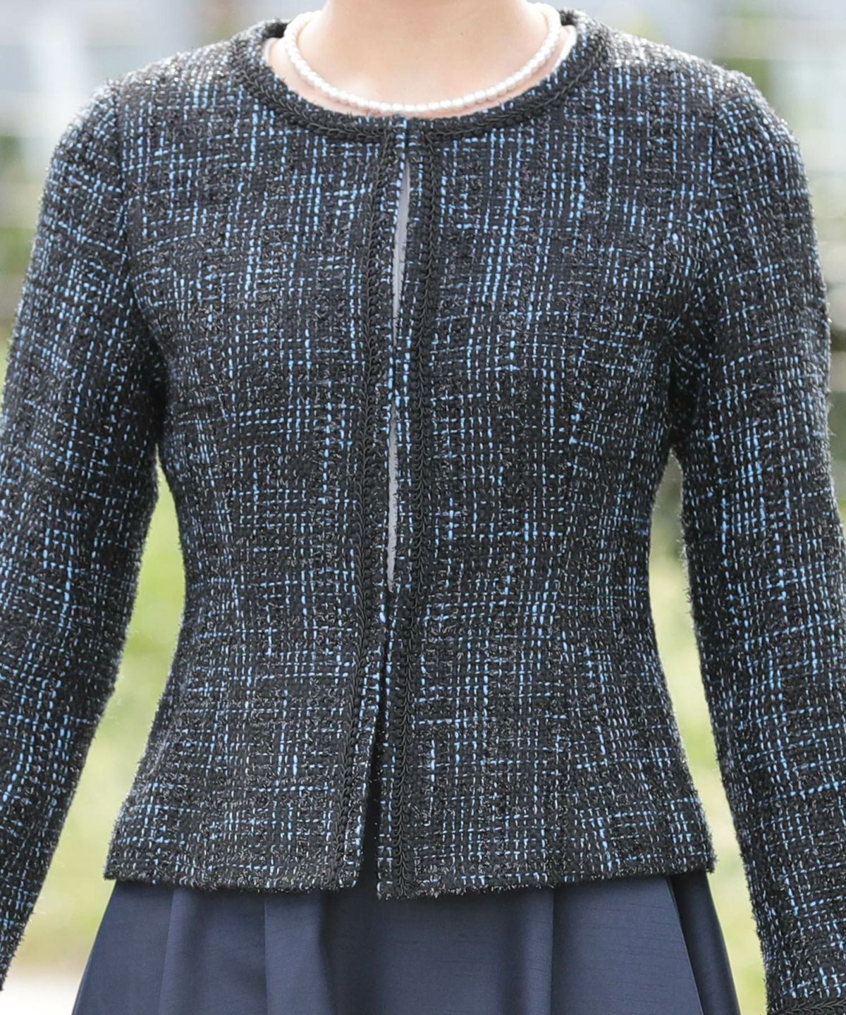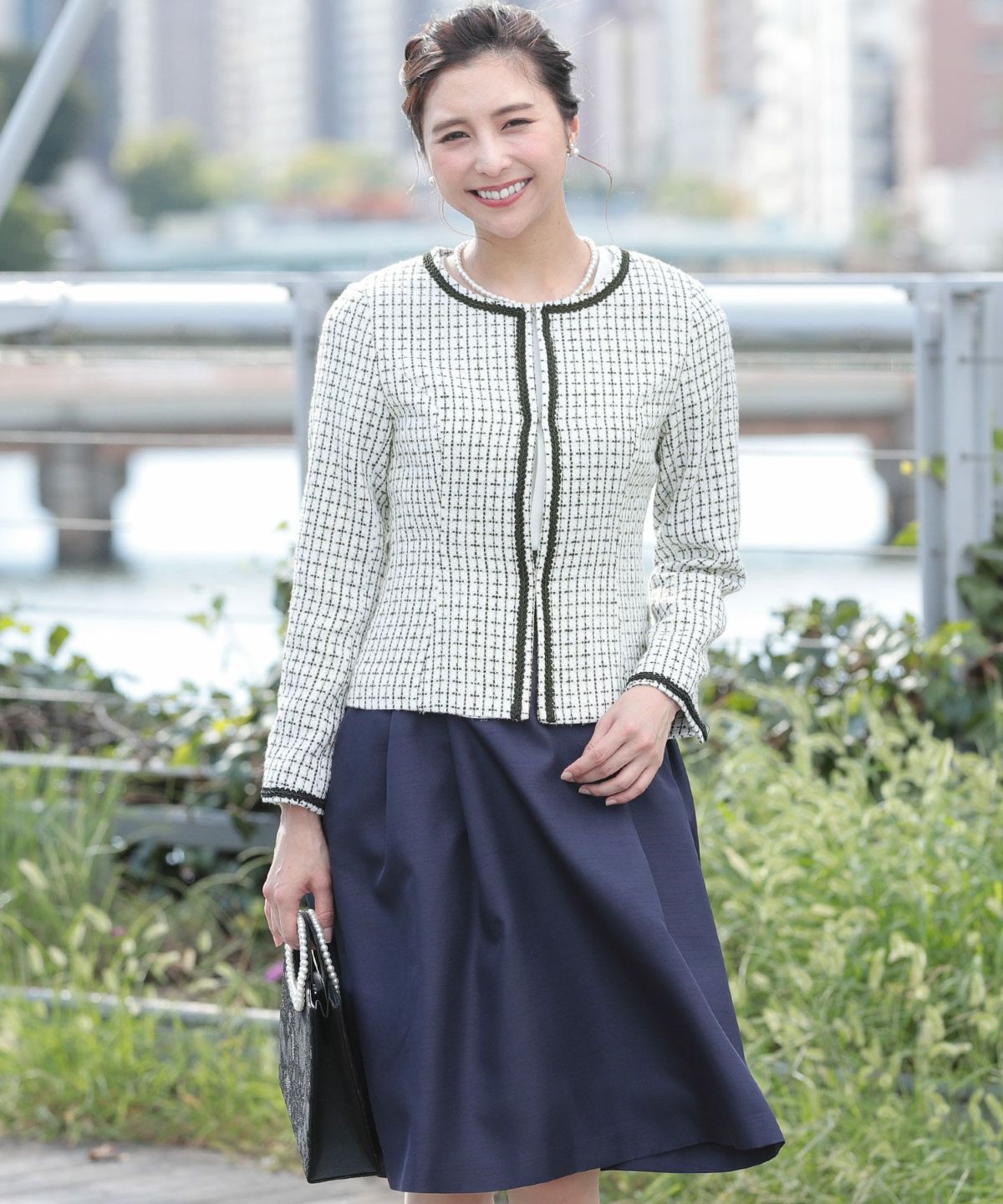 ツイード生地のノーカラージャケットには高級感ある先染め素材使用。