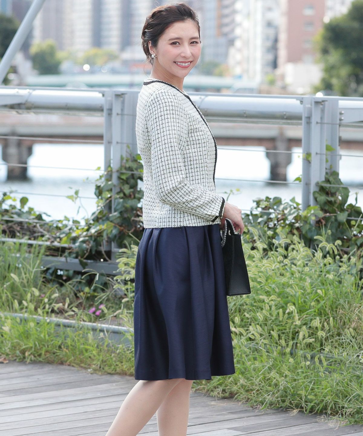 先染め素材が風合いの美しいミックスツイード生地を使用したジャケット。ワンピースのスカート部分は光沢感ある上品で華のある生地感になっています。