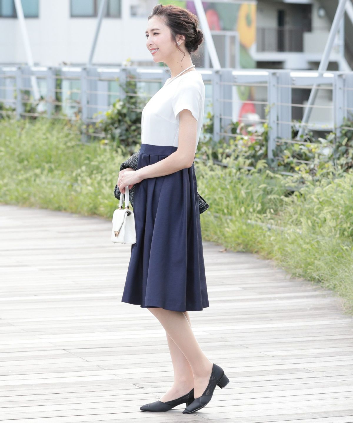 ハイウエスト切り替えのワンピースは脚長効果があり、上品なアイテム。