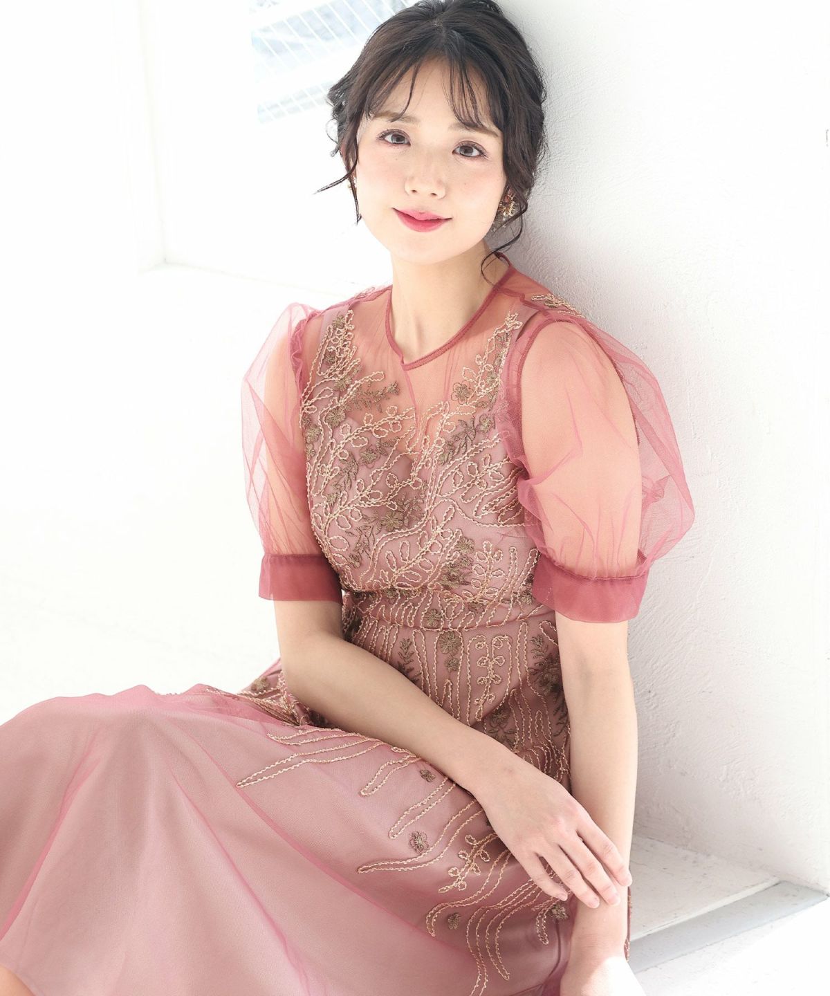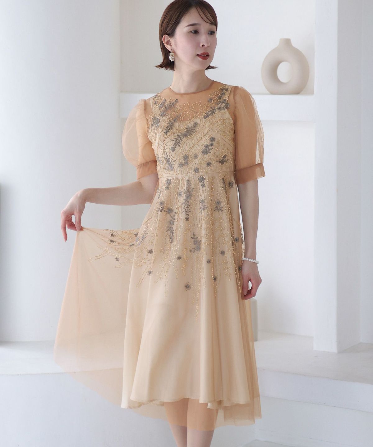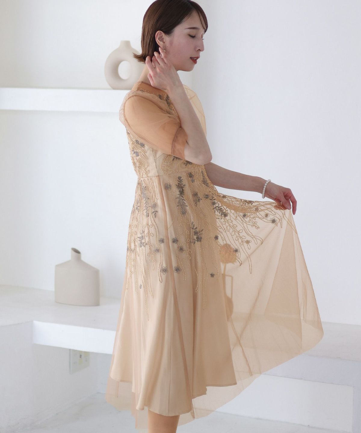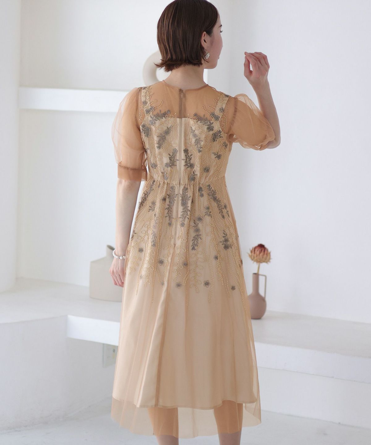 ■ビーズ×チュールレースビーズとラメ糸で刺繍されたチュールレースが煌びやかなワンピースです。ワンピース一枚だけで華やかで可愛いアイテム。程よい透け感で甘くなりすぎず大人っぽい印象に。オケージョンシーンから特別なお食事会まで幅広くお使いいただけます。