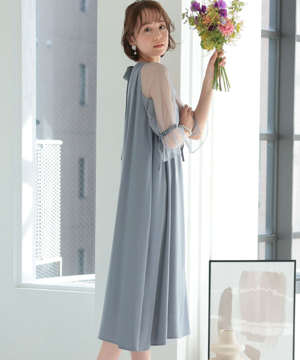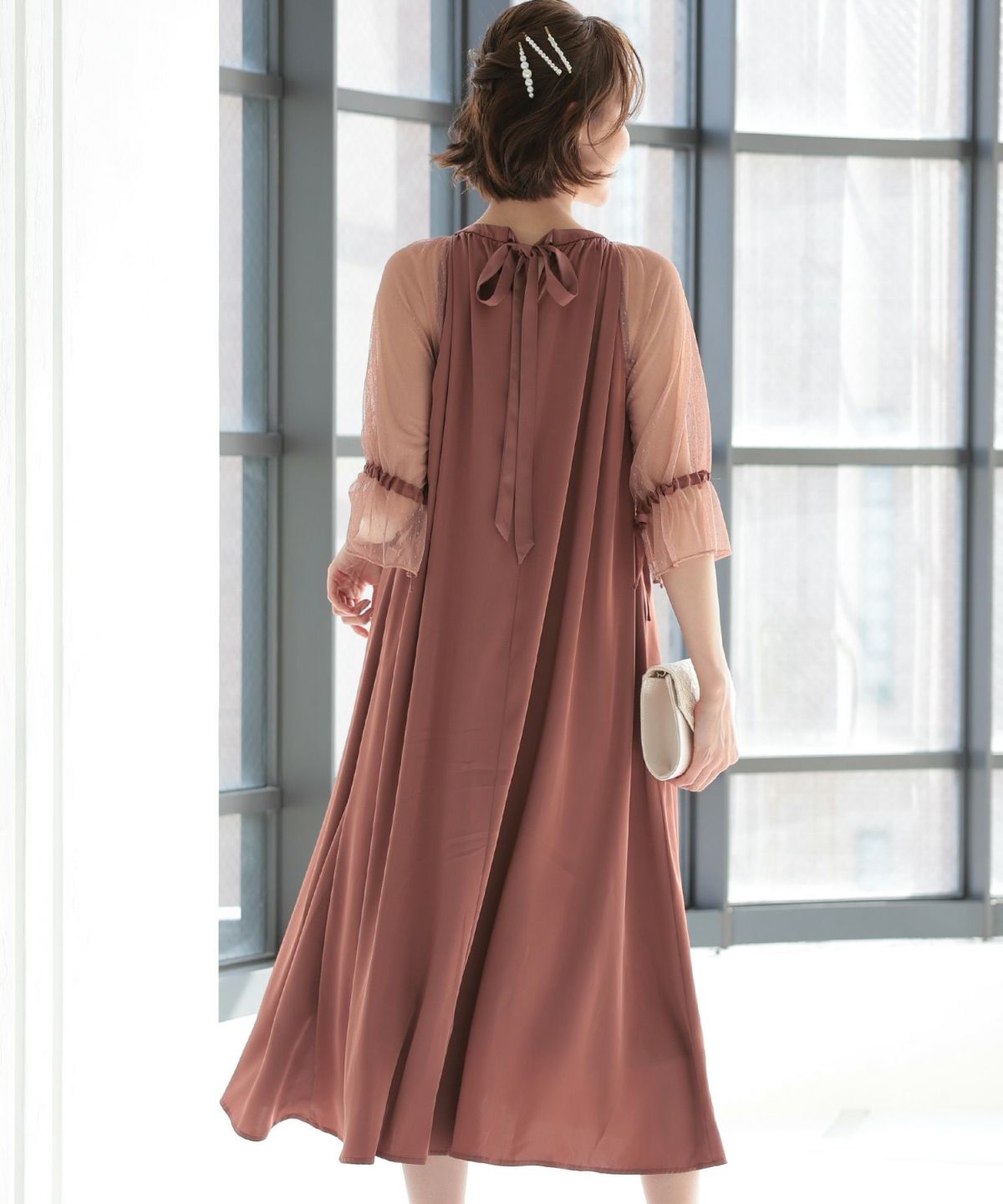 ■ドットレース×ラグランスリーブふわっとしたAラインが上品でエレガントなワンピース袖のドットレースがコーデのアクセントにバックリボンで後ろ姿もかわいい袖には調整可能なリボン付きで可愛さもプラス