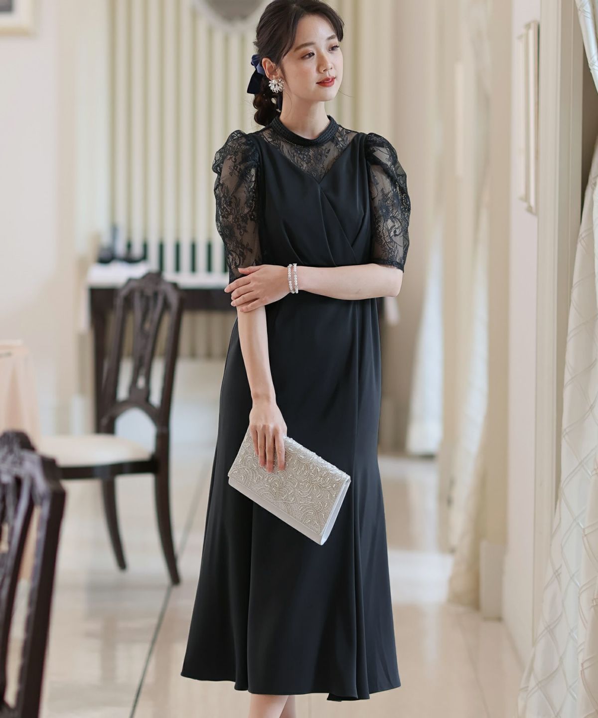 ■マーメイド×配色レース配色コードレースをレイヤードしたようなデザインのワンピースです。マーメイドシルエットで女性らしさアップ。デコルテ~袖の程よい透け感が上品な印象に。オケージョンシーンはもちろん特別なお食事会などにもおすすめです。