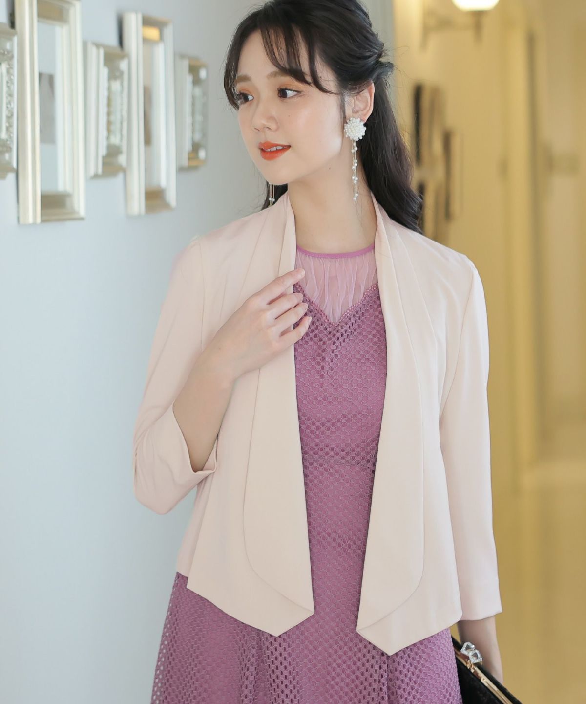 ■ショールカラーが大人可愛いボレロジャケットショールカラーデザインで女性らしいボレロジャケットです。シンプルでクラシカルな雰囲気に。かっちりしすぎないジャケットシルエットで合わせやすい。オケージョンシーンの羽織はもちろんデニムボトムス等のカジュアルアイテムと合わせて普段使いにも◎