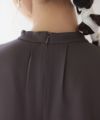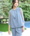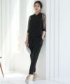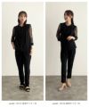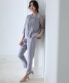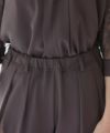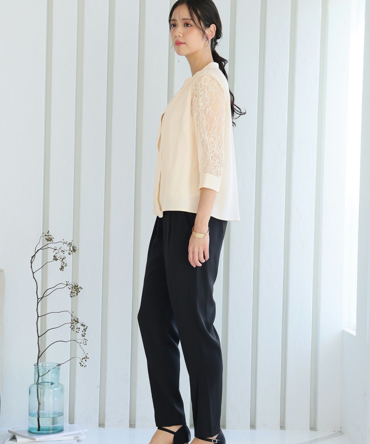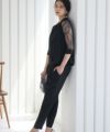 セットアップのパンツドレスにレースの切り替えで上品な装いに。
