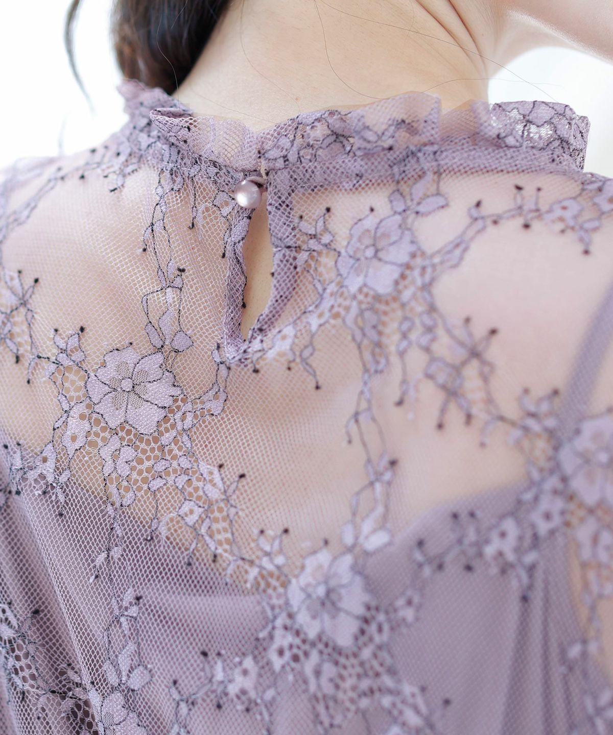 少し高めのネックとフリルで首長効果。アクセサリーなしでも華やかな印象に。首後ろはくるみボタン仕様で、細部までこだわりが詰まっています。