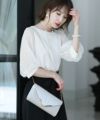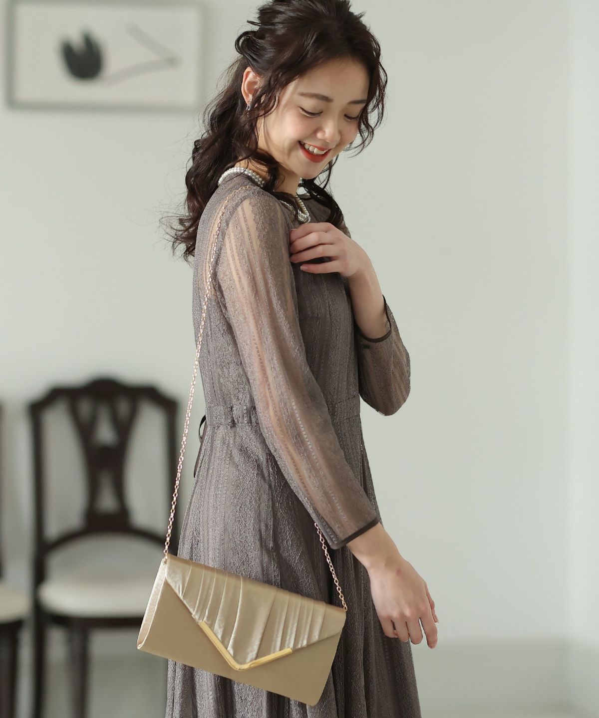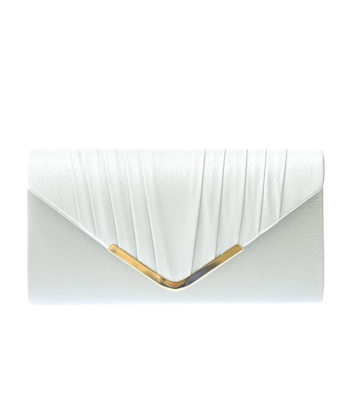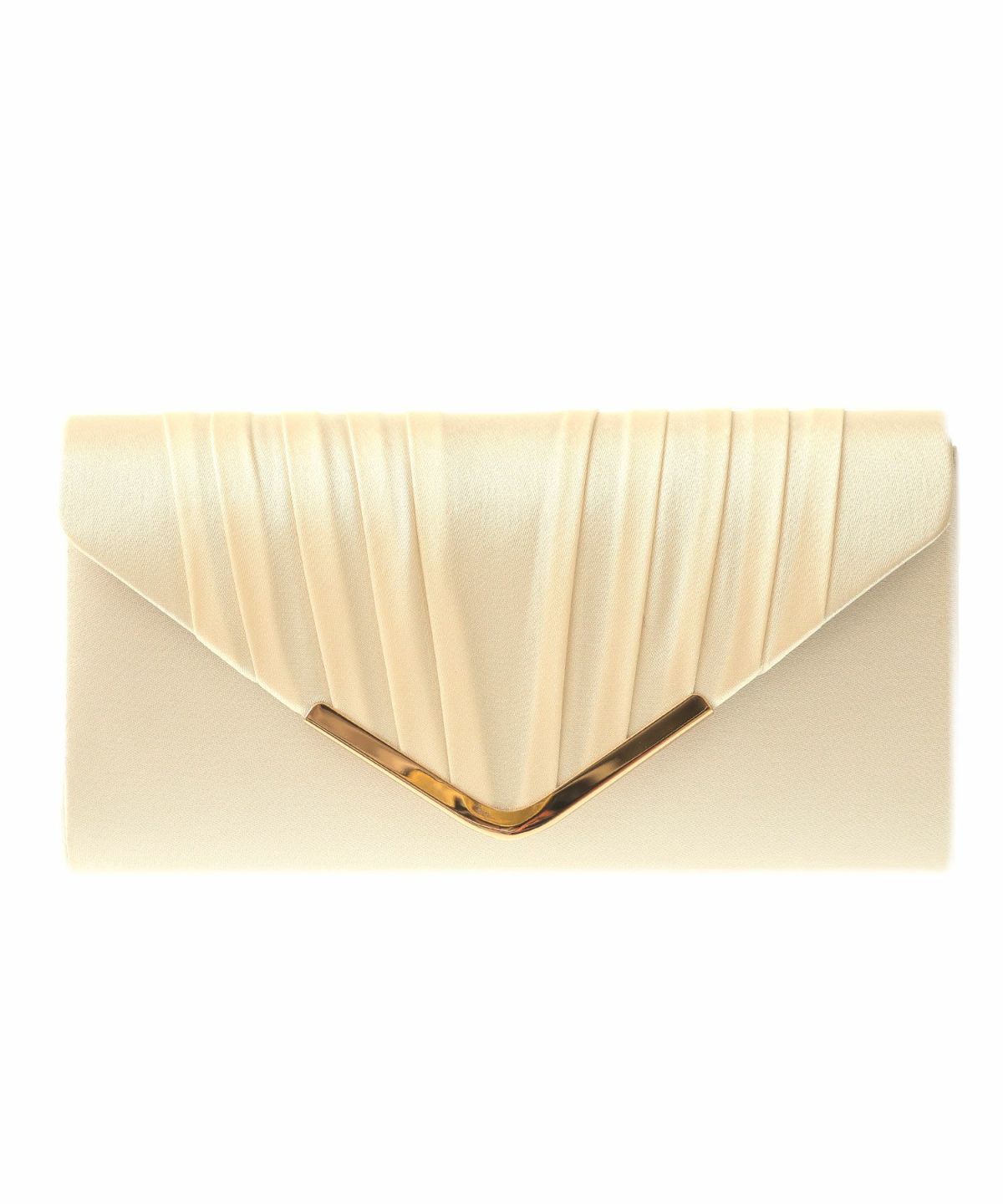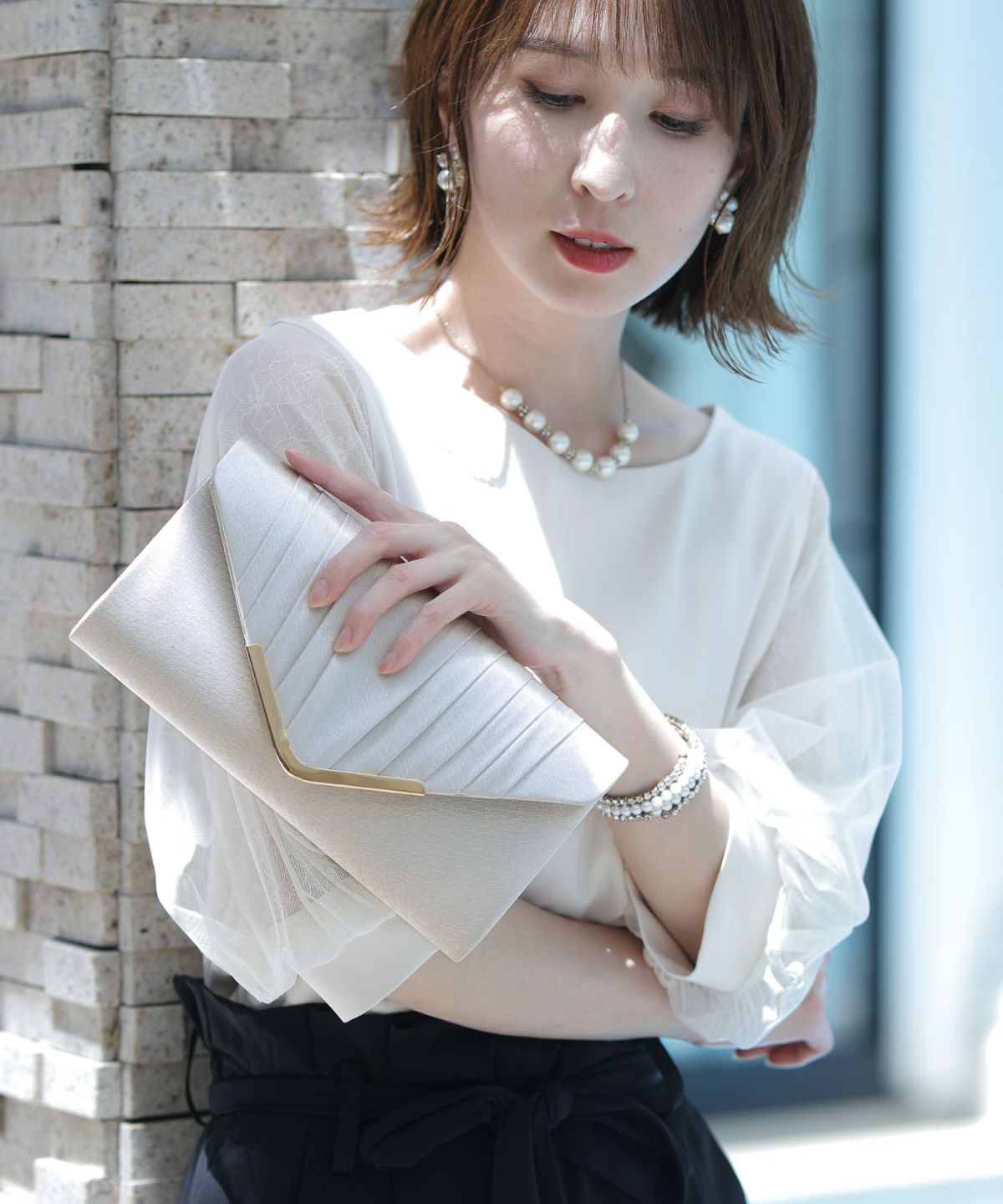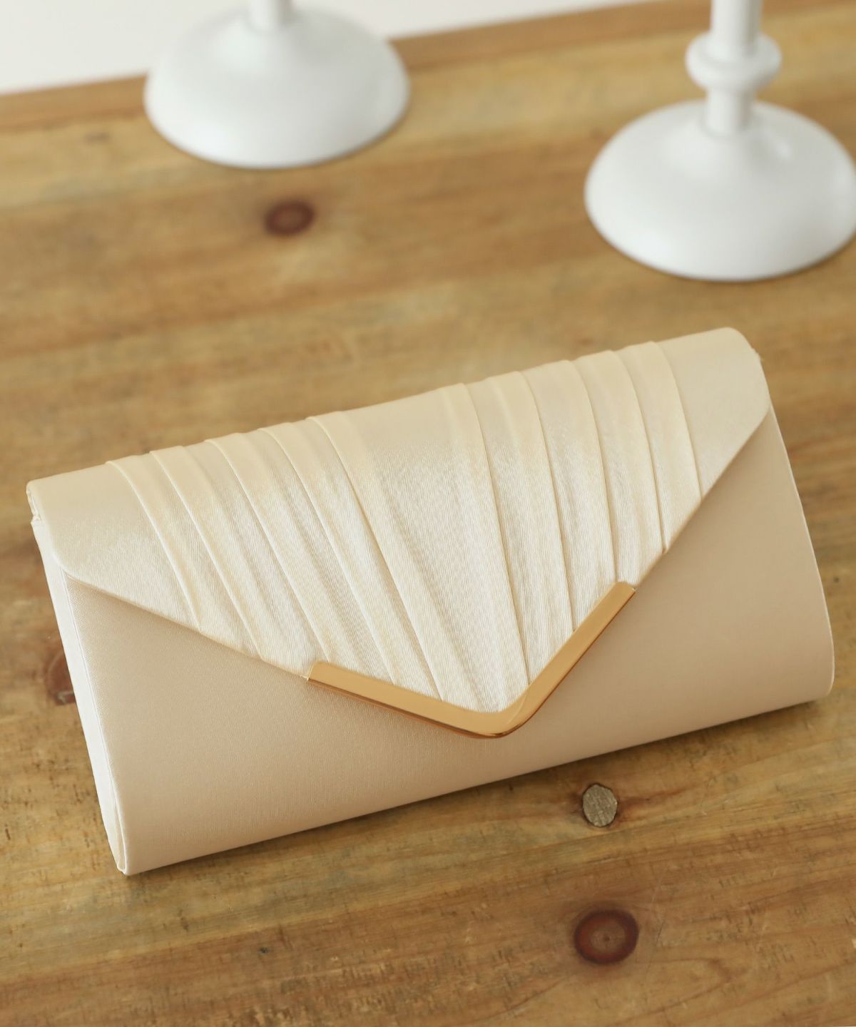 サテン地とタックのシンプルなデザインが上品な印象を引き立てるクラッチバッグ。