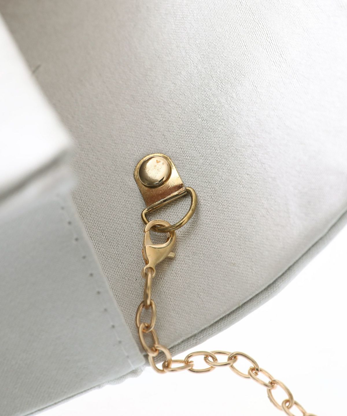 シンプルな光沢感あるサテン地が上品。ショルダーチェーンと開け口の金具はゴールドで華やかに。