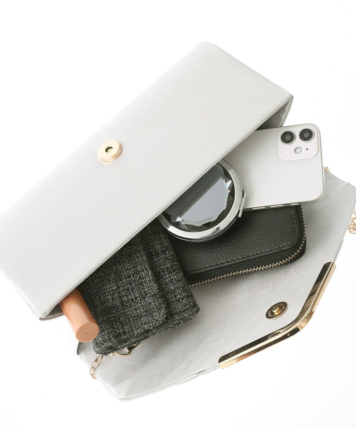 財布やスマホ、お直し用リップや袱紗など必需品をしっかり収納できる嬉しい作り。