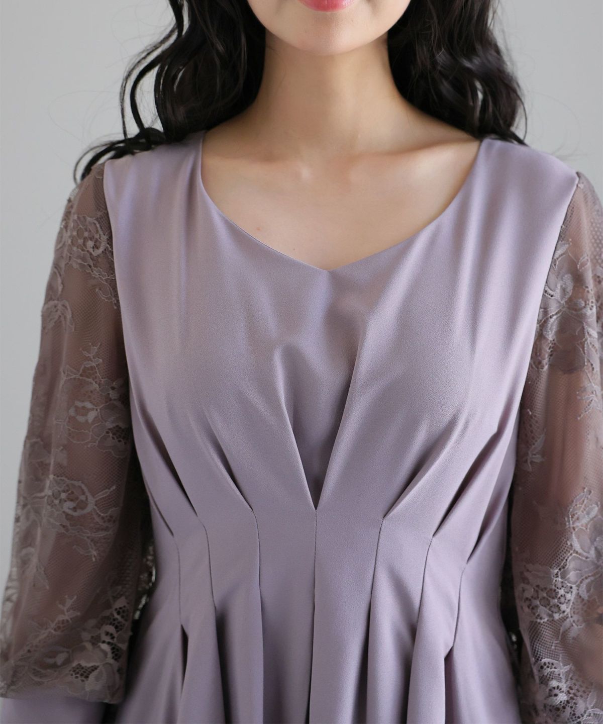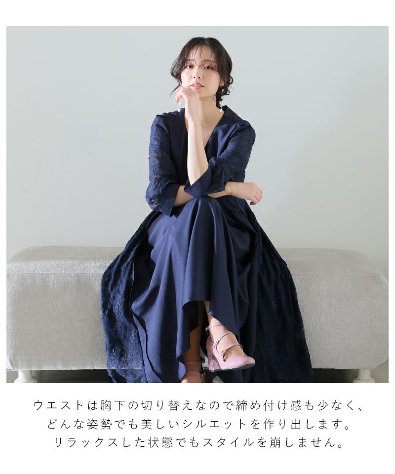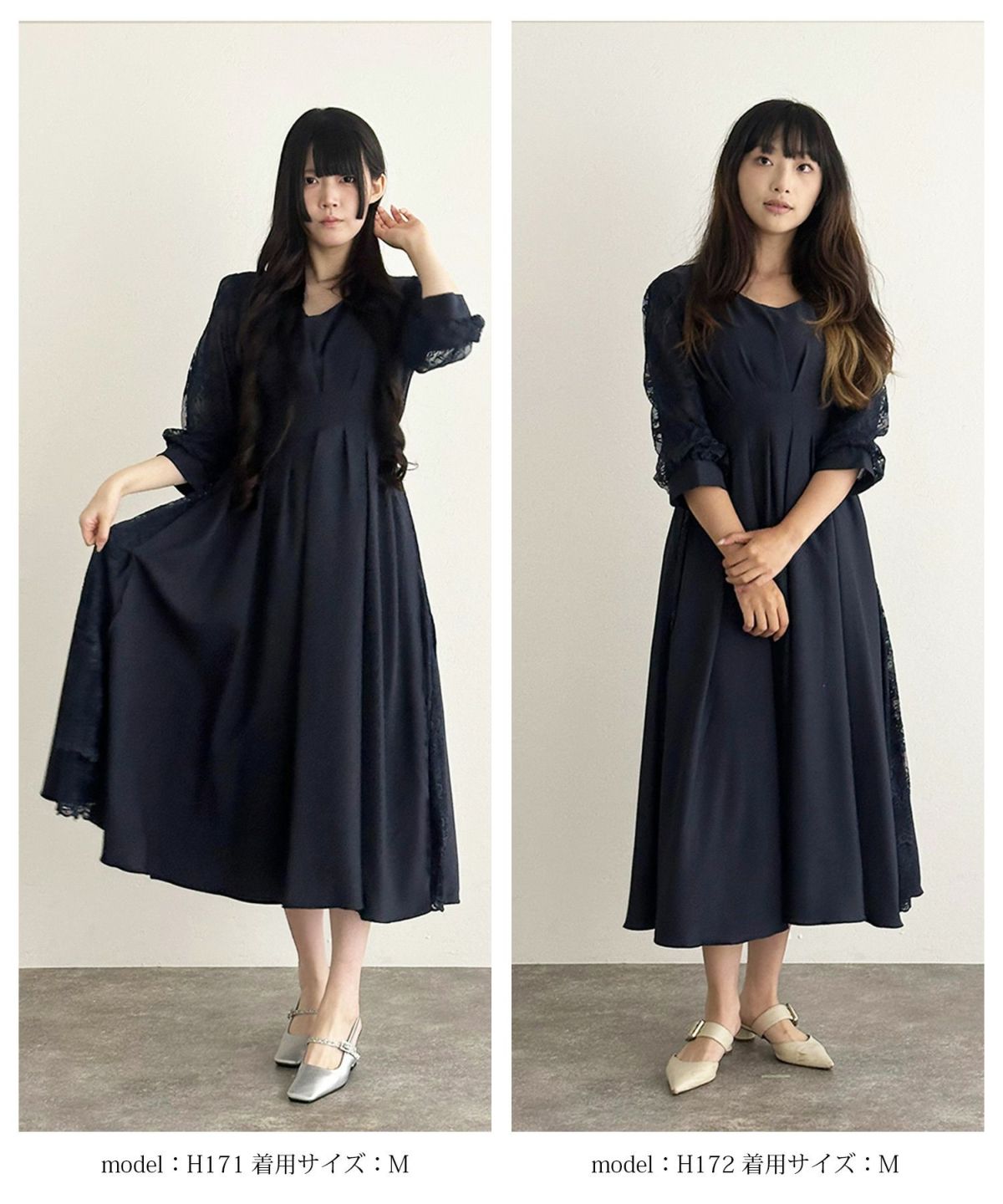 たっぷり生地を使用したロングフレアスカートが動くたびにとても優美に揺れます。お袖はオーガンジーに繊細なレースを重ね上品なシアー感に仕上がっています。