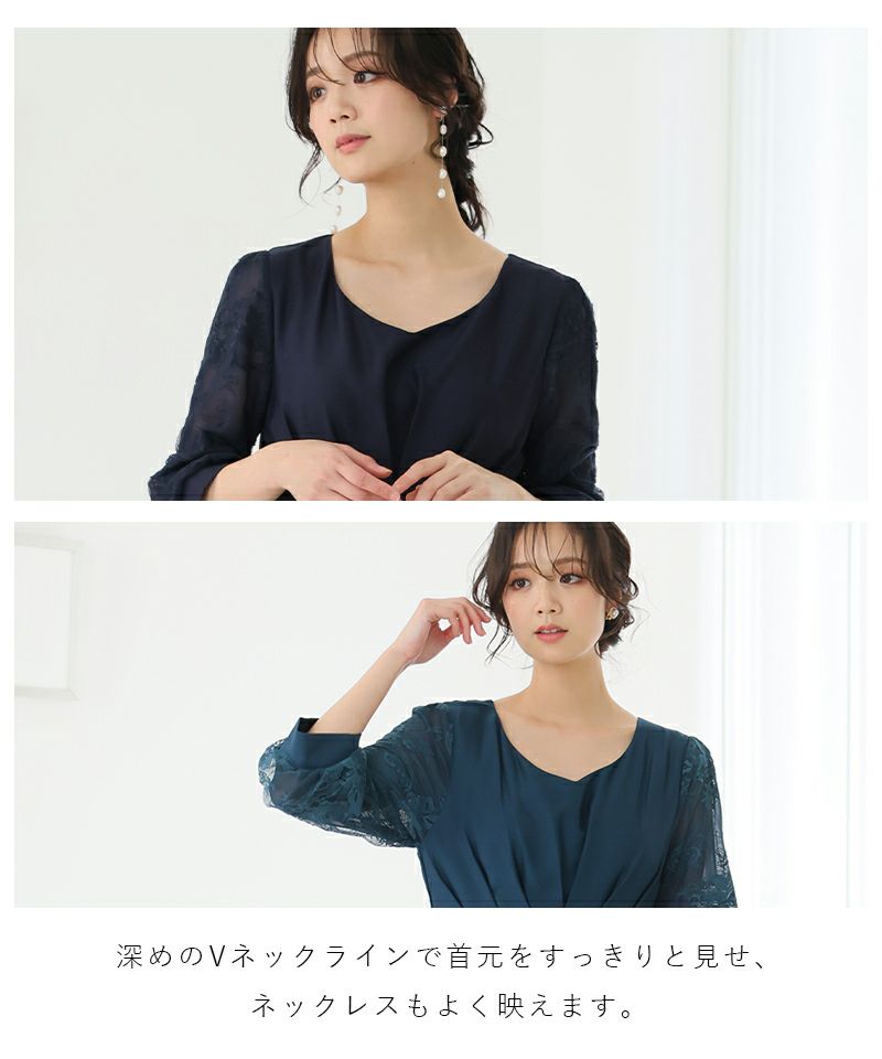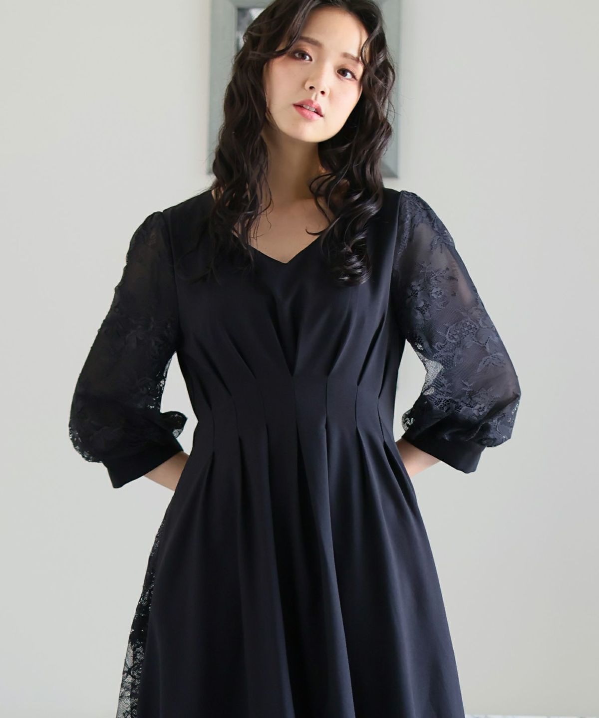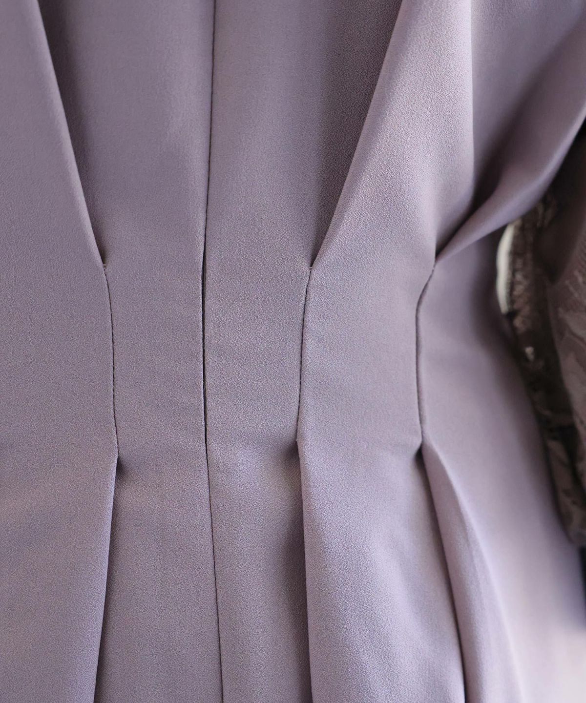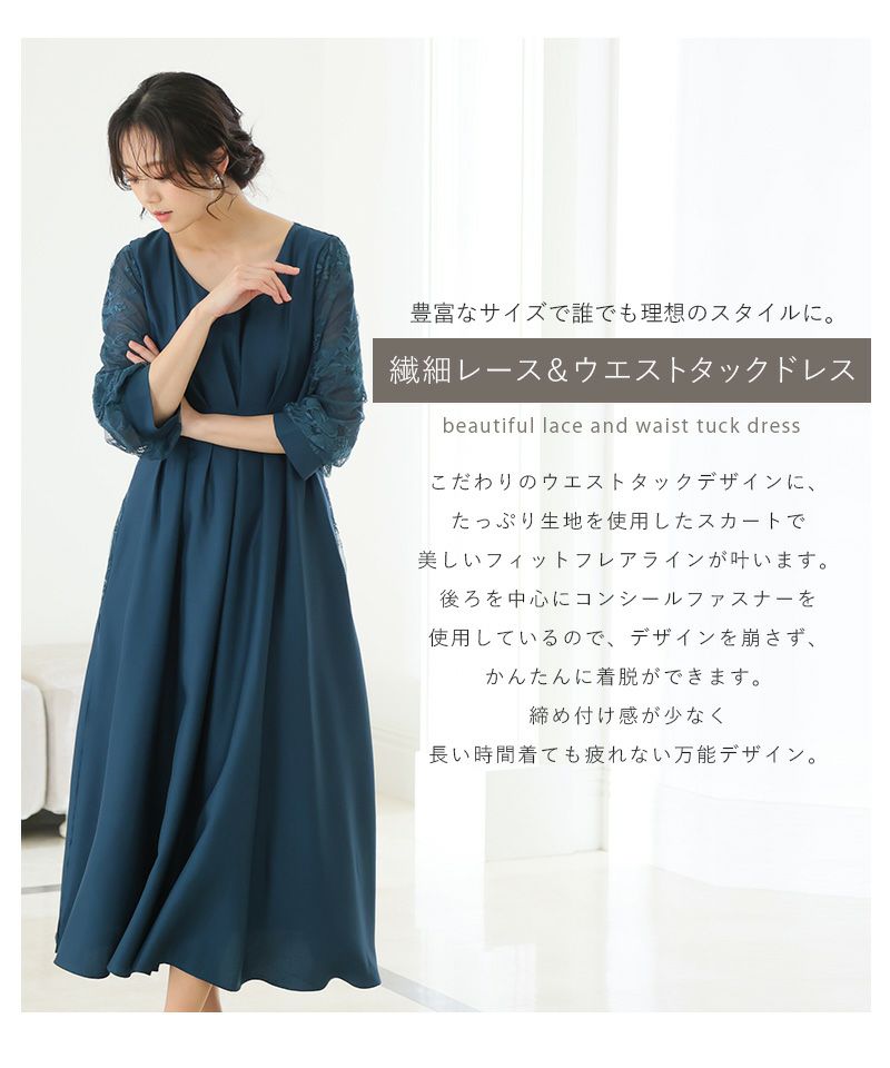 たっぷり生地を使用したロングフレアスカートが動くたびにとても優美に揺れます。お袖はオーガンジーに繊細なレースを重ね上品なシアー感に仕上がっています。