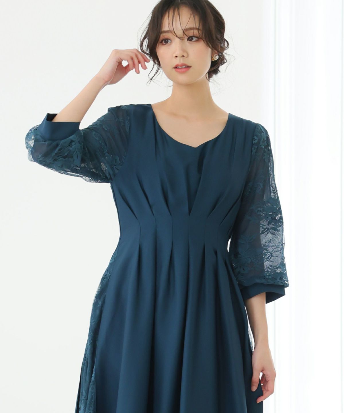 たっぷり生地を使用したロングフレアスカートが動くたびにとても優美に揺れます。お袖はオーガンジーに繊細なレースを重ね上品なシアー感に仕上がっています。