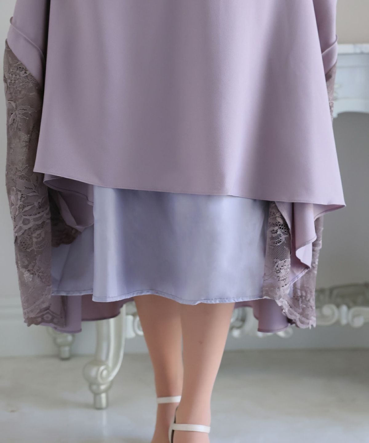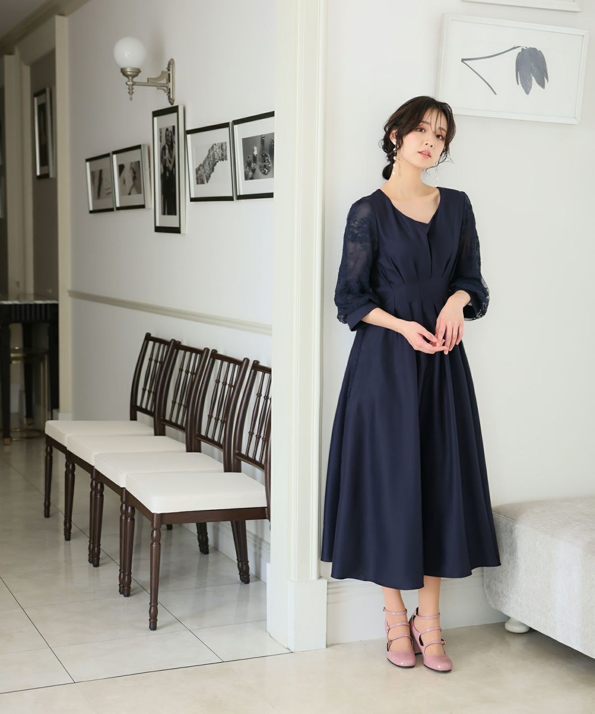 たっぷり生地を使用したロングフレアスカートが動くたびにとても優美に揺れます。お袖はオーガンジーに繊細なレースを重ね上品なシアー感に仕上がっています。