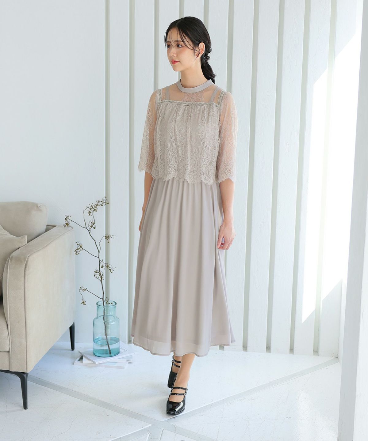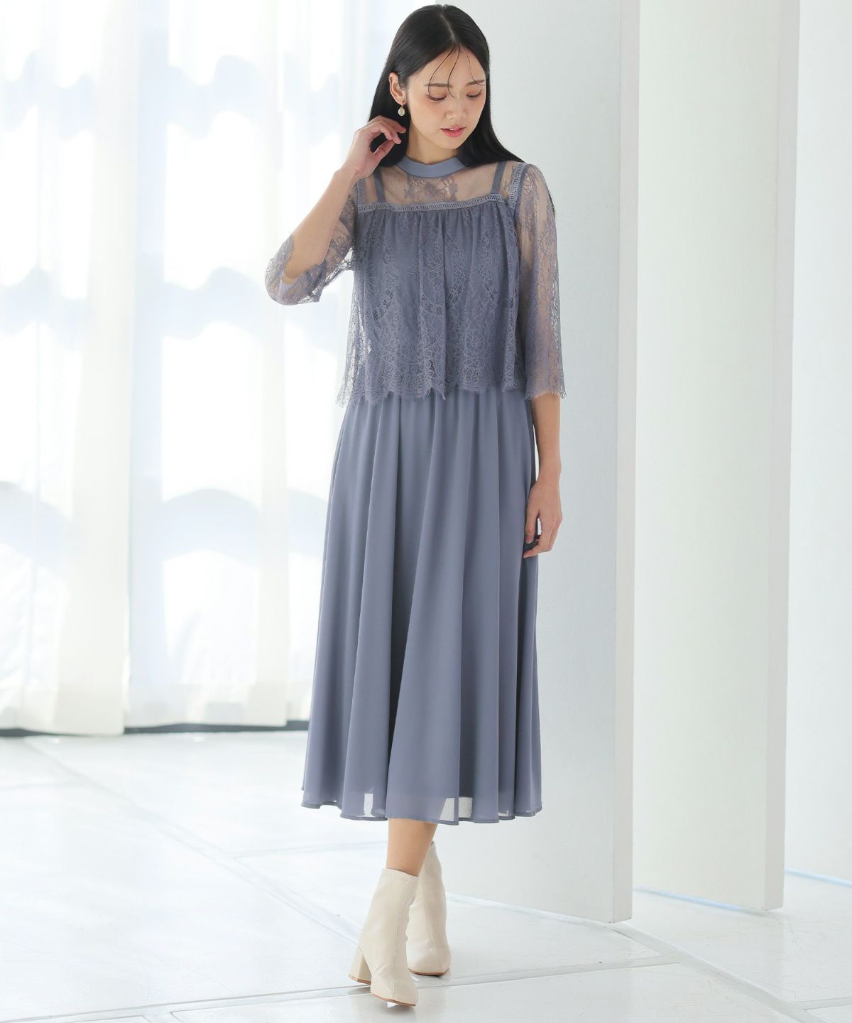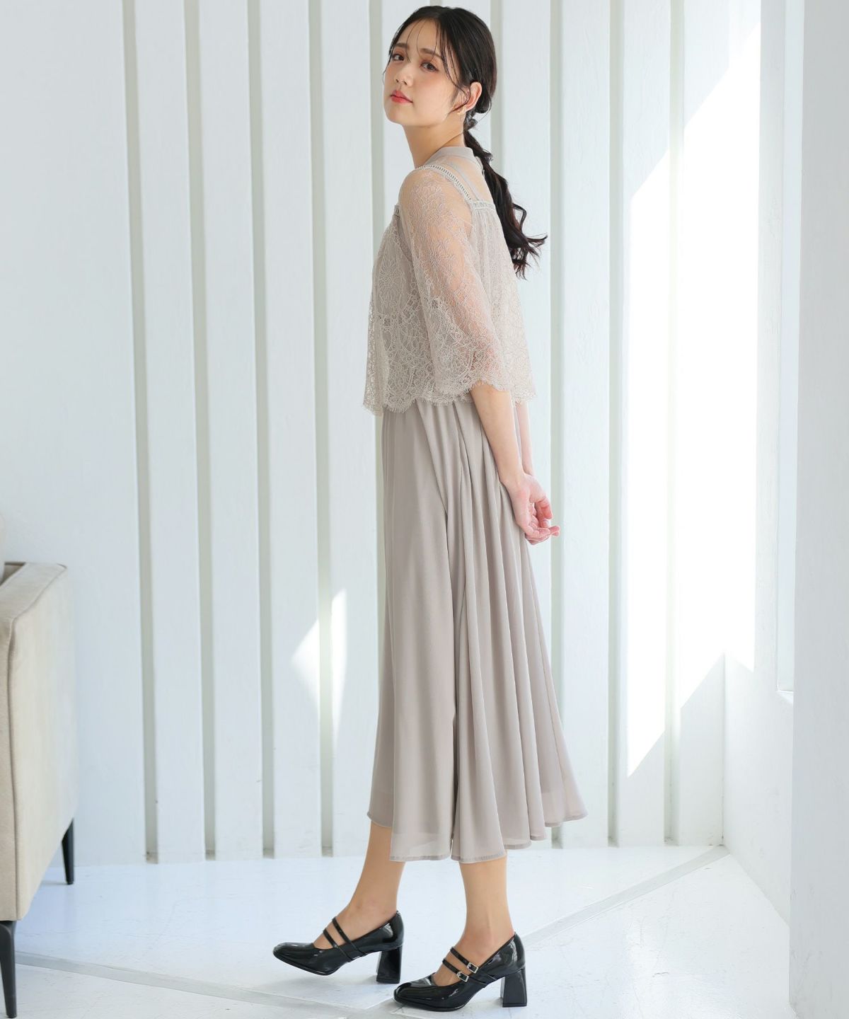 ■レースのスカラップとシフォンスカートがフェミニンな雰囲気を演出