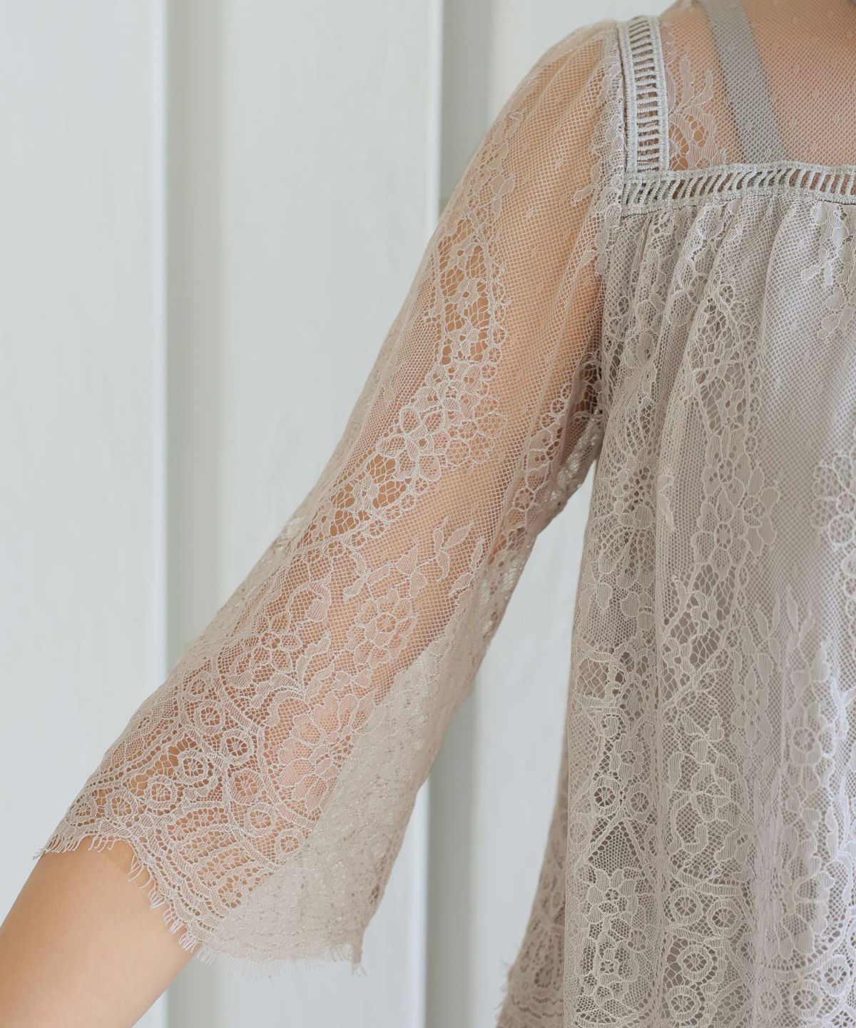 身頃部分と袖に施されたレースのスカラップがとても上品な一枚。