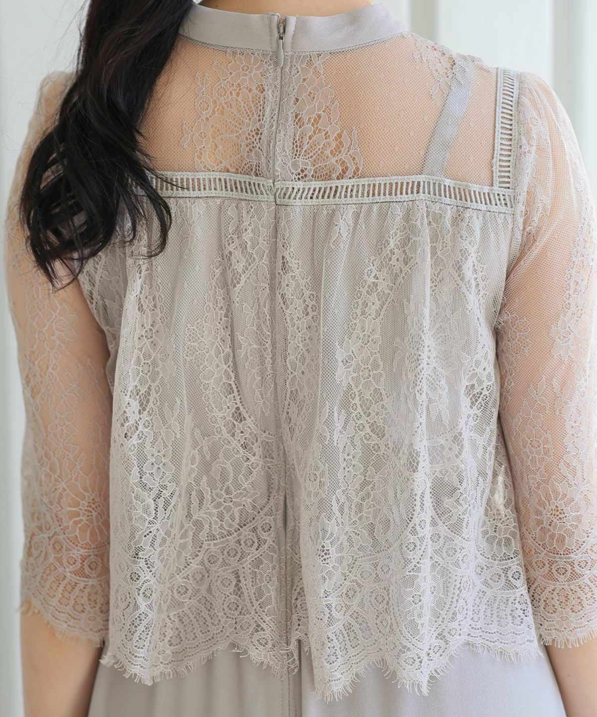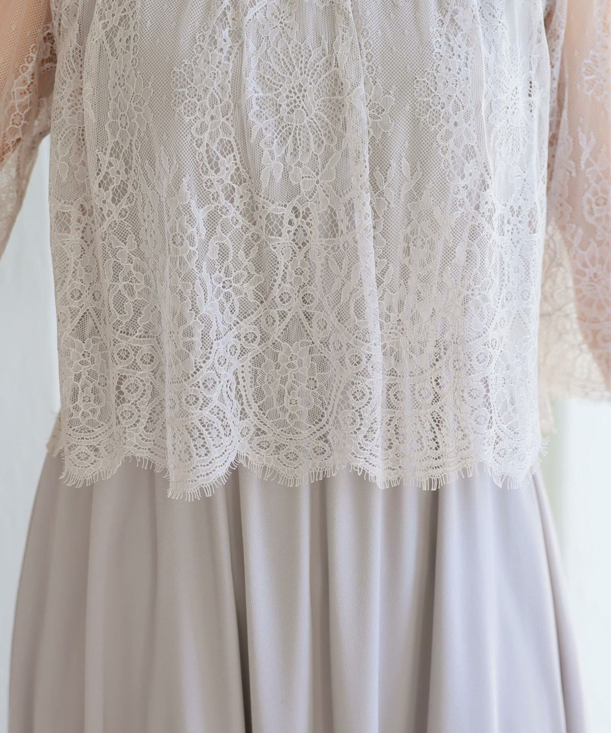 ■ケープを重ねたようなレースデザインが二の腕とウエスト周りをふんわりとカバー