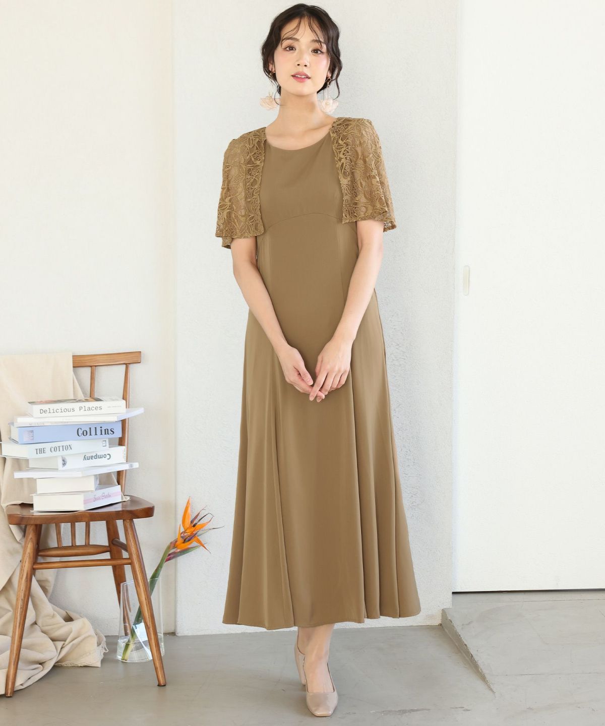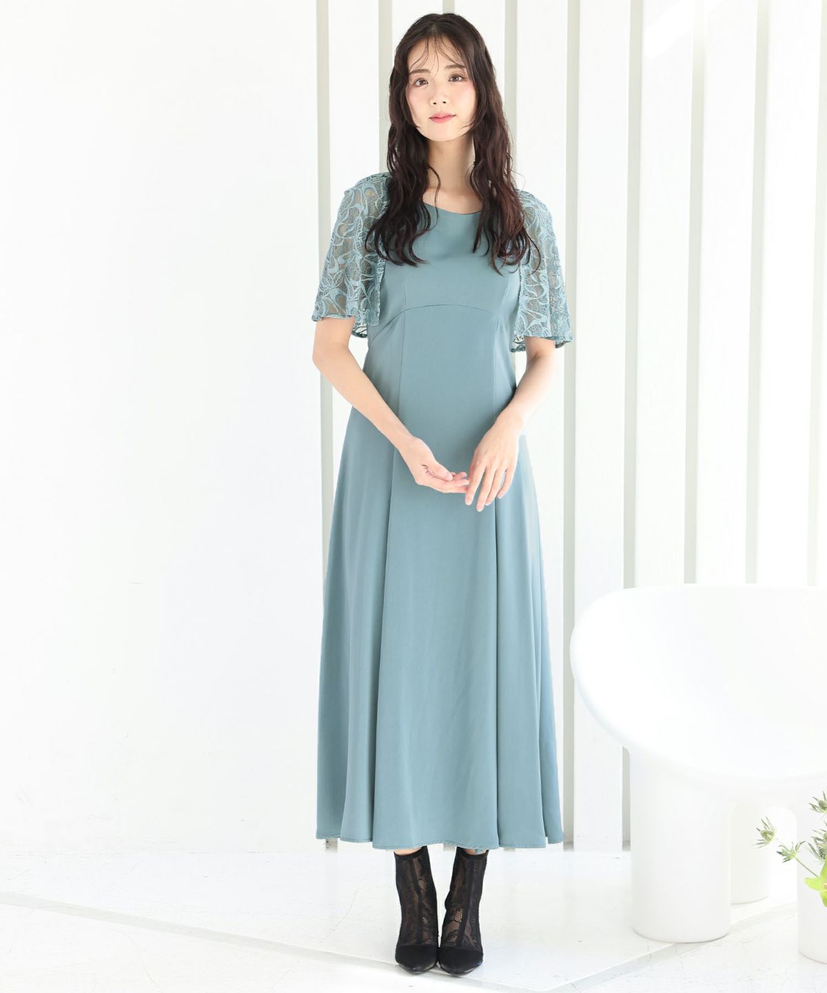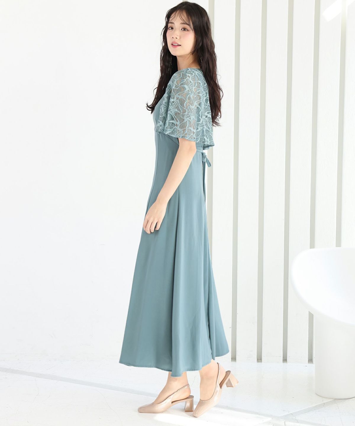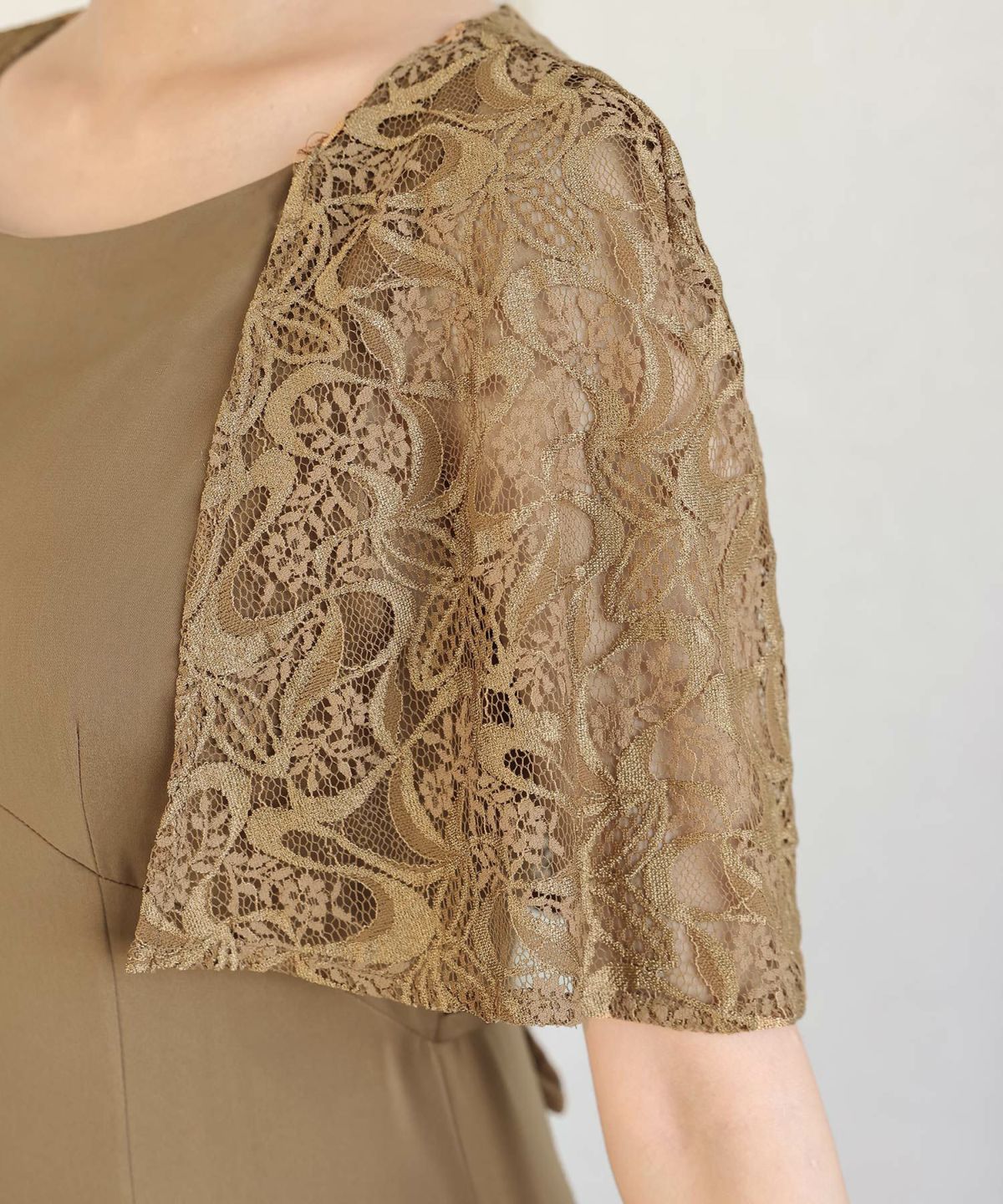 レースのケープが二の腕をカバーしてくれます。Uネックデザインで顔周りをすきっりと見せてくれます。