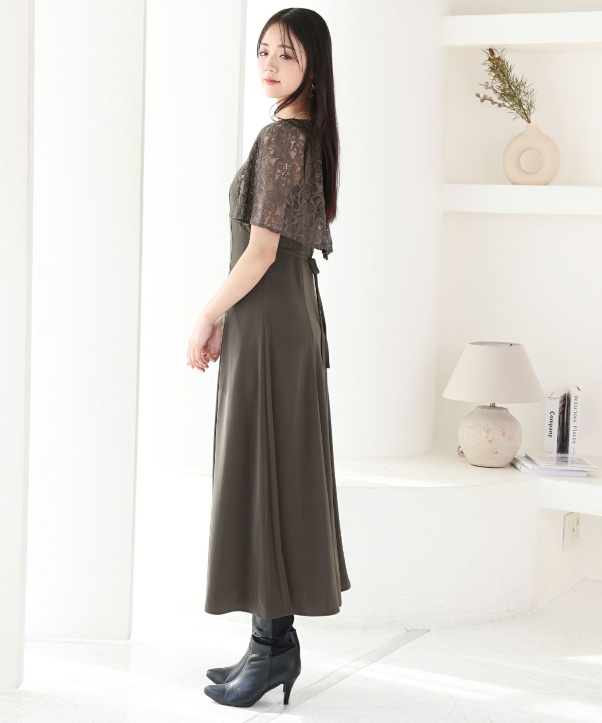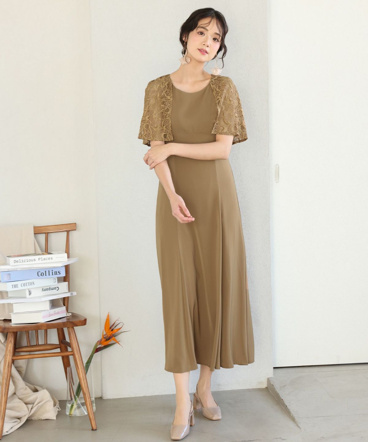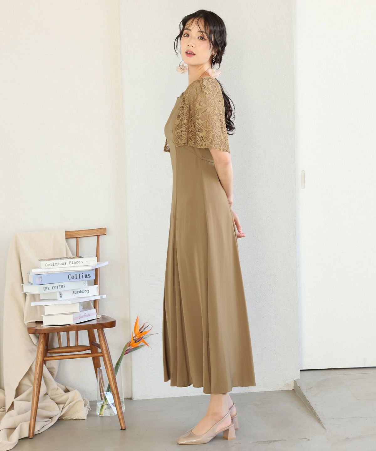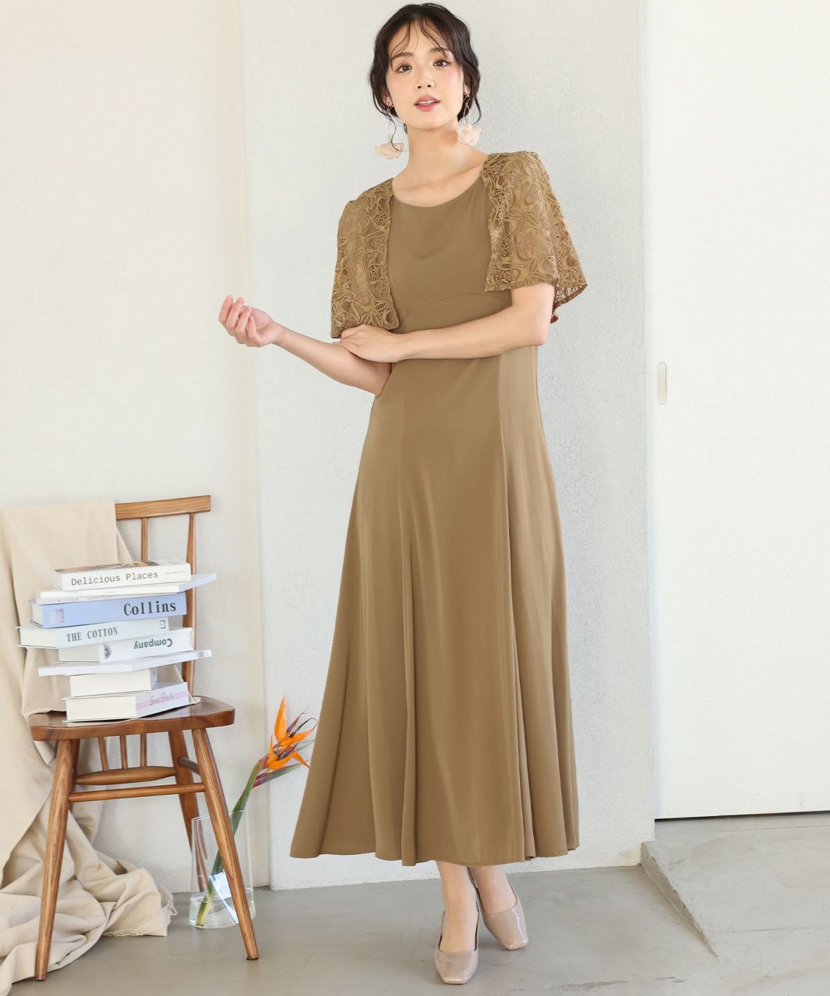 レースのケープが二の腕をカバーしてくれます。Uネックデザインで顔周りをすきっりと見せてくれます。