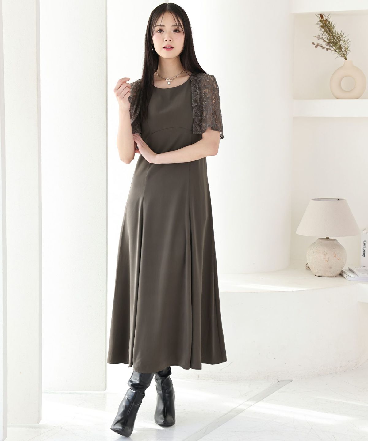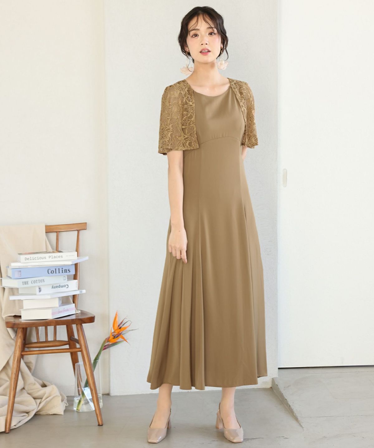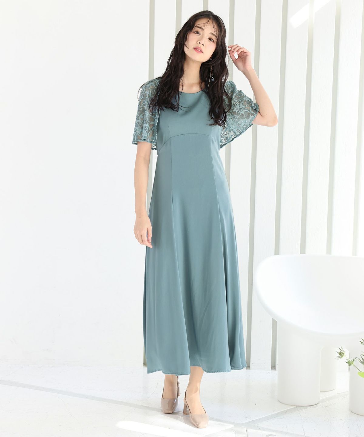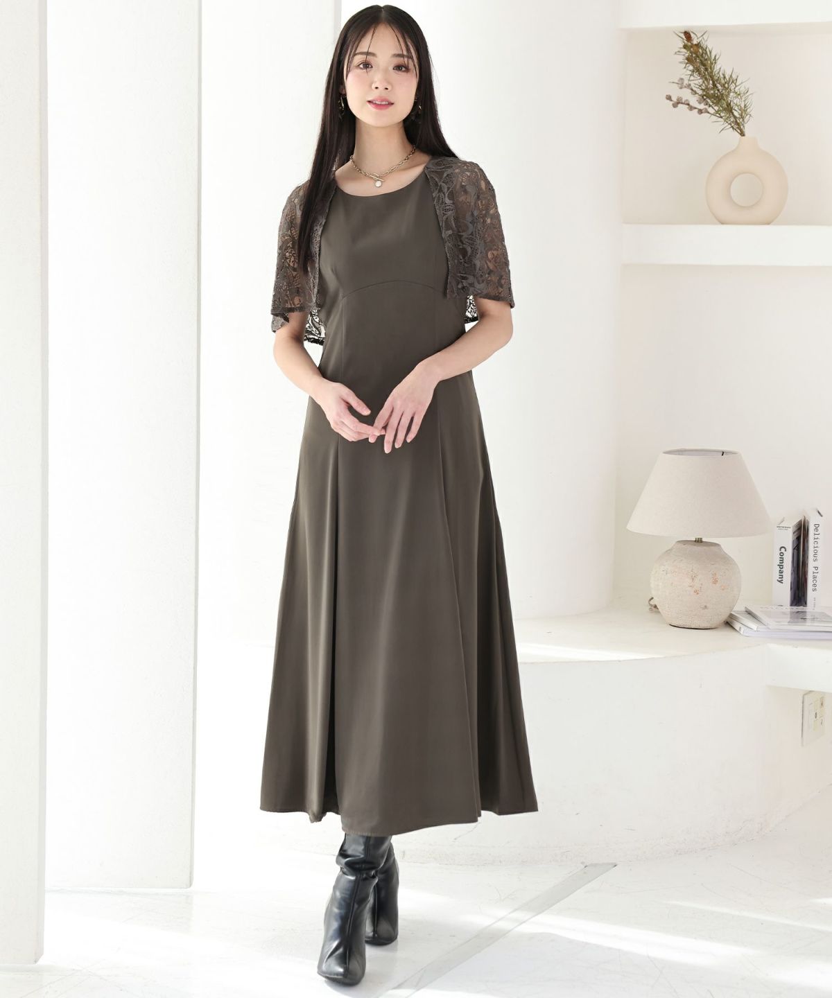 レースのケープが二の腕をカバーしてくれます。Uネックデザインで顔周りをすきっりと見せてくれます。