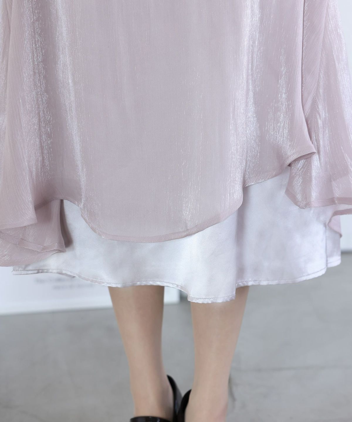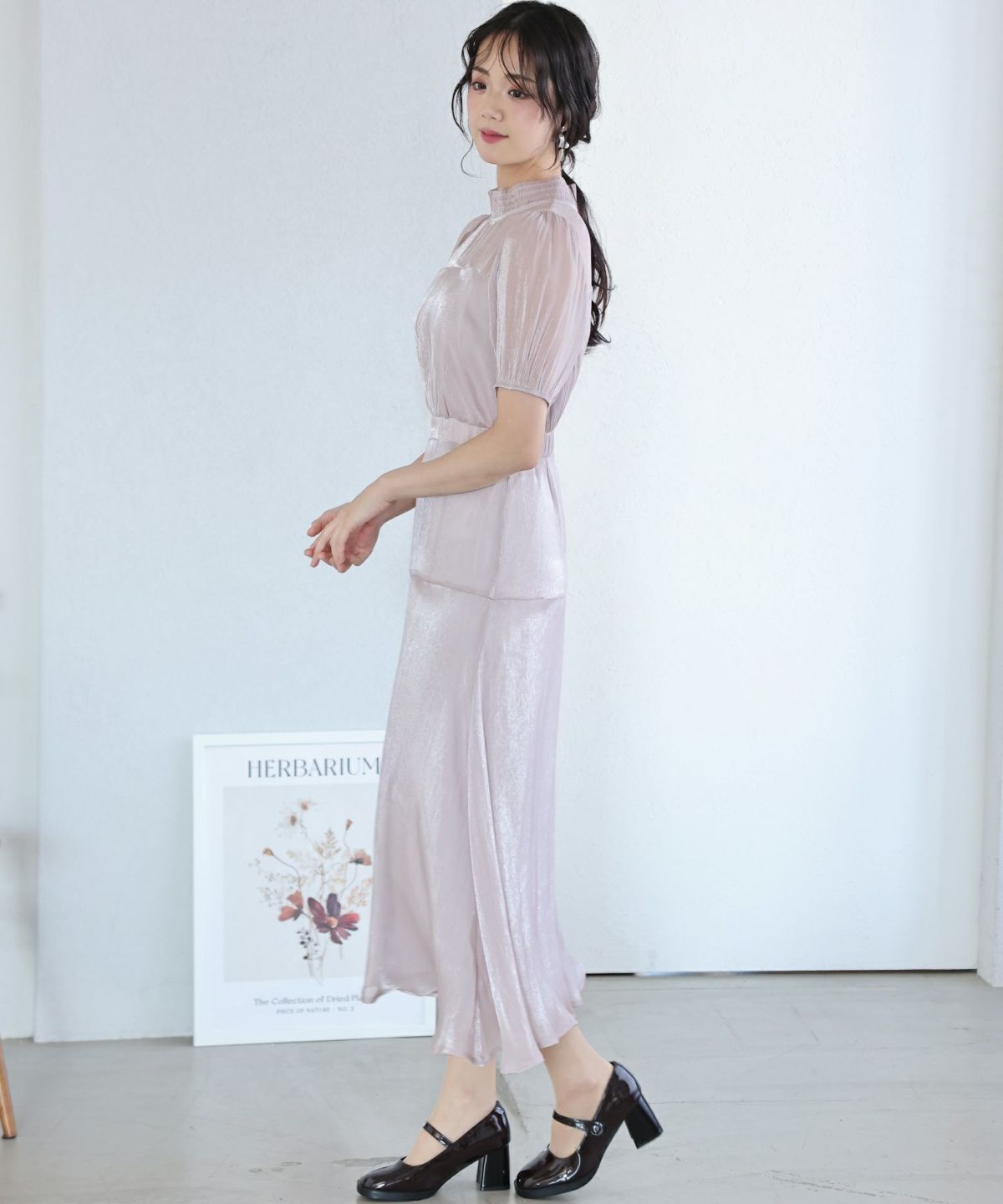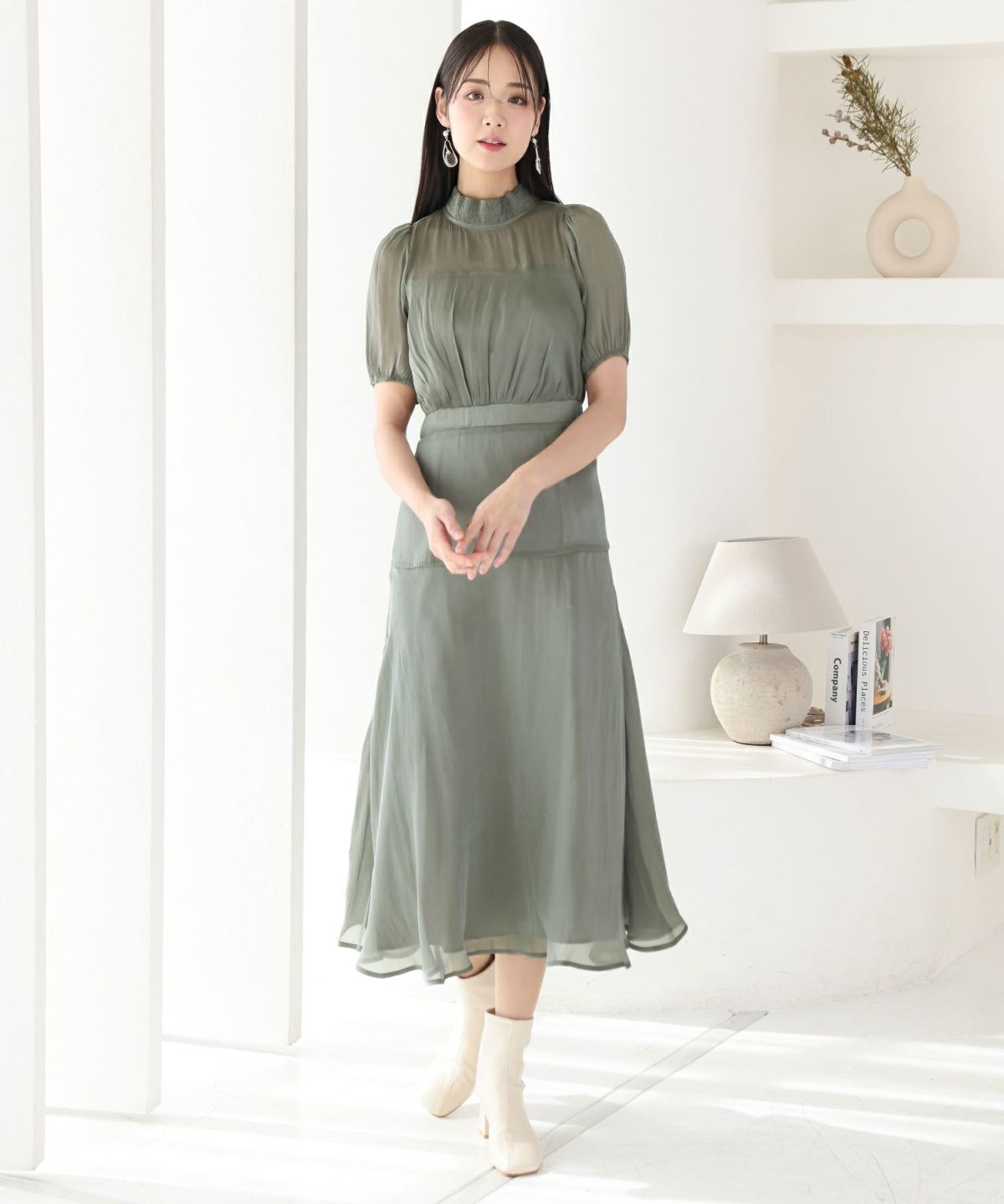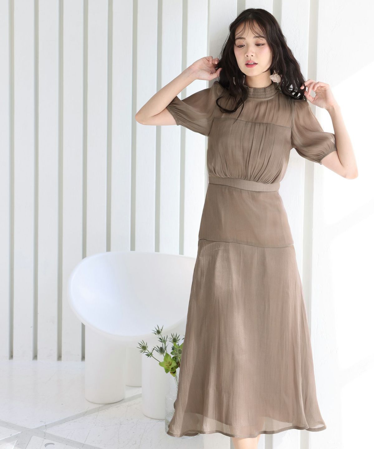 程よい透け感が上品なスタンドネックワンピース。スカートには途中切替があり、スカートラインを綺麗に見せてくれます。ふんわりと余裕のある生地感でフェミニンな印象に。オケージョンシーンや同窓会、特別なお食事会などにおすすめです。