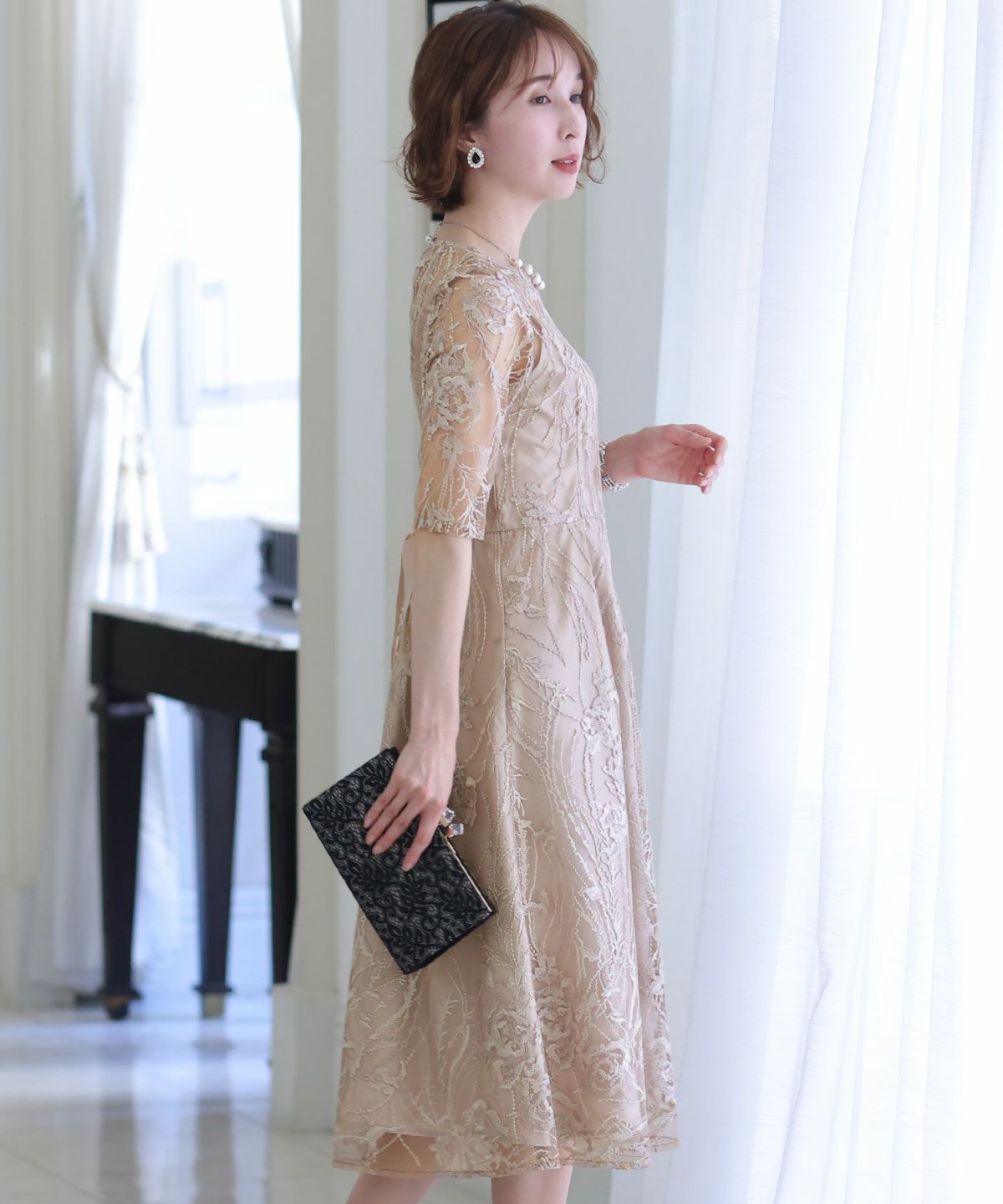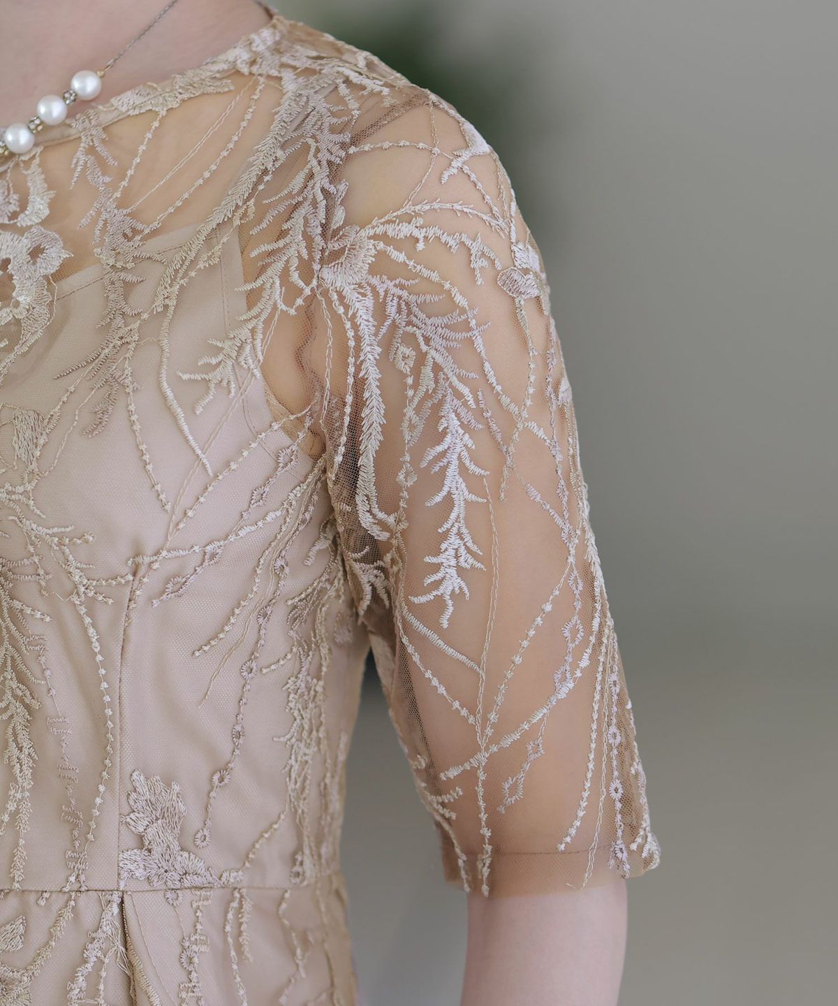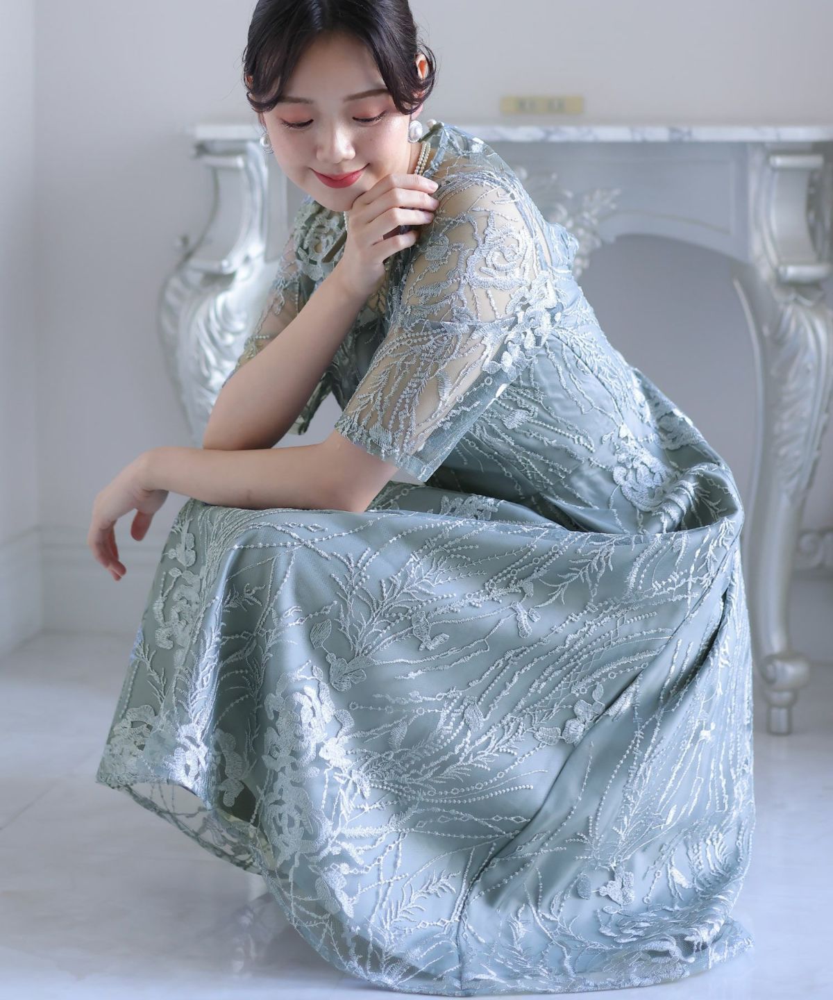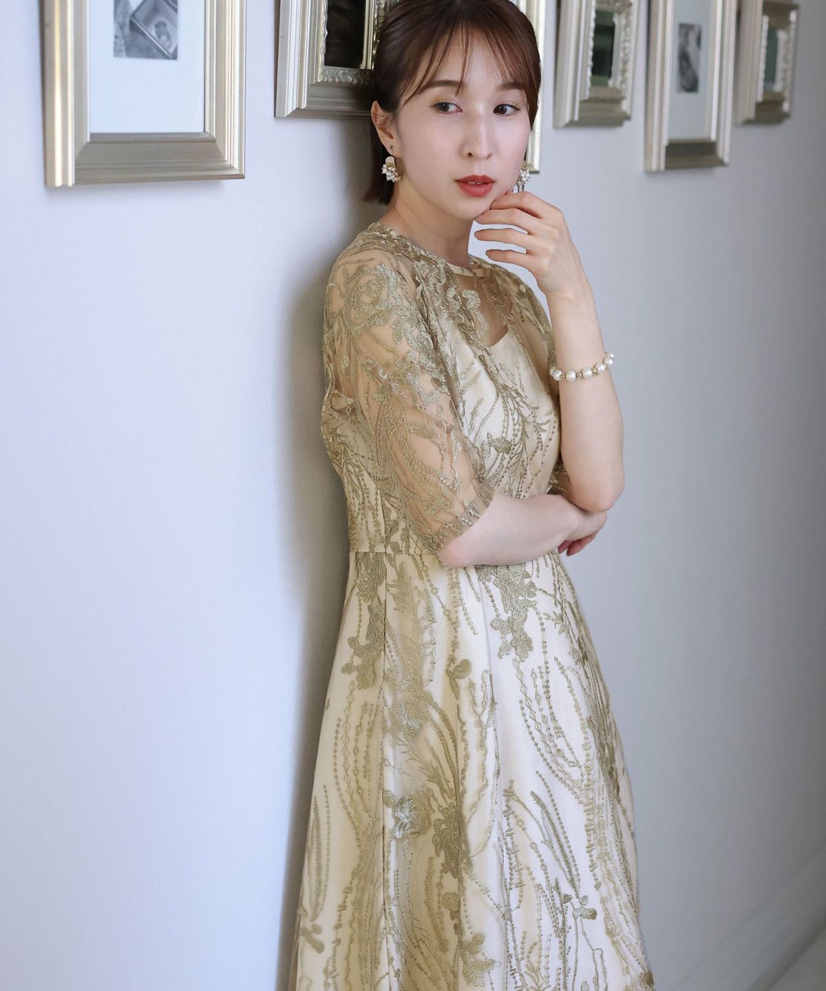 ボタニカルな総刺繍の光沢感が美しいレースドレス。大柄ながら繊細な刺繍ディティールなので、上品な印象に仕上がっています。