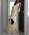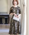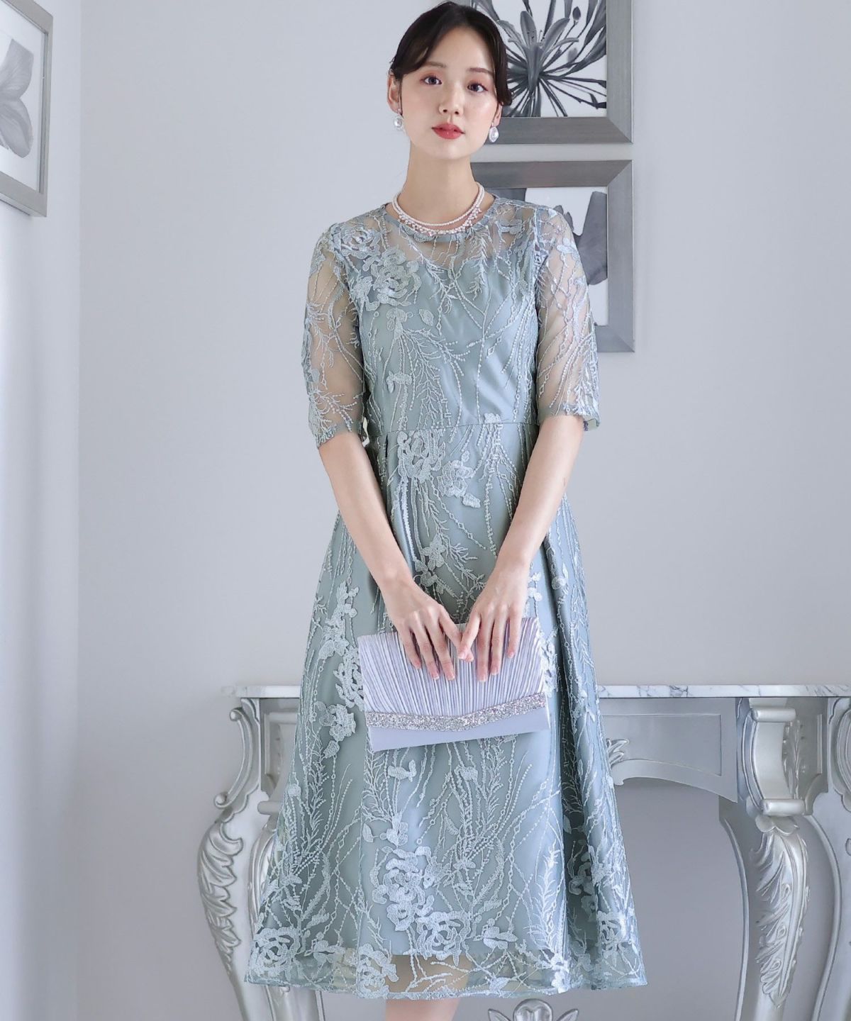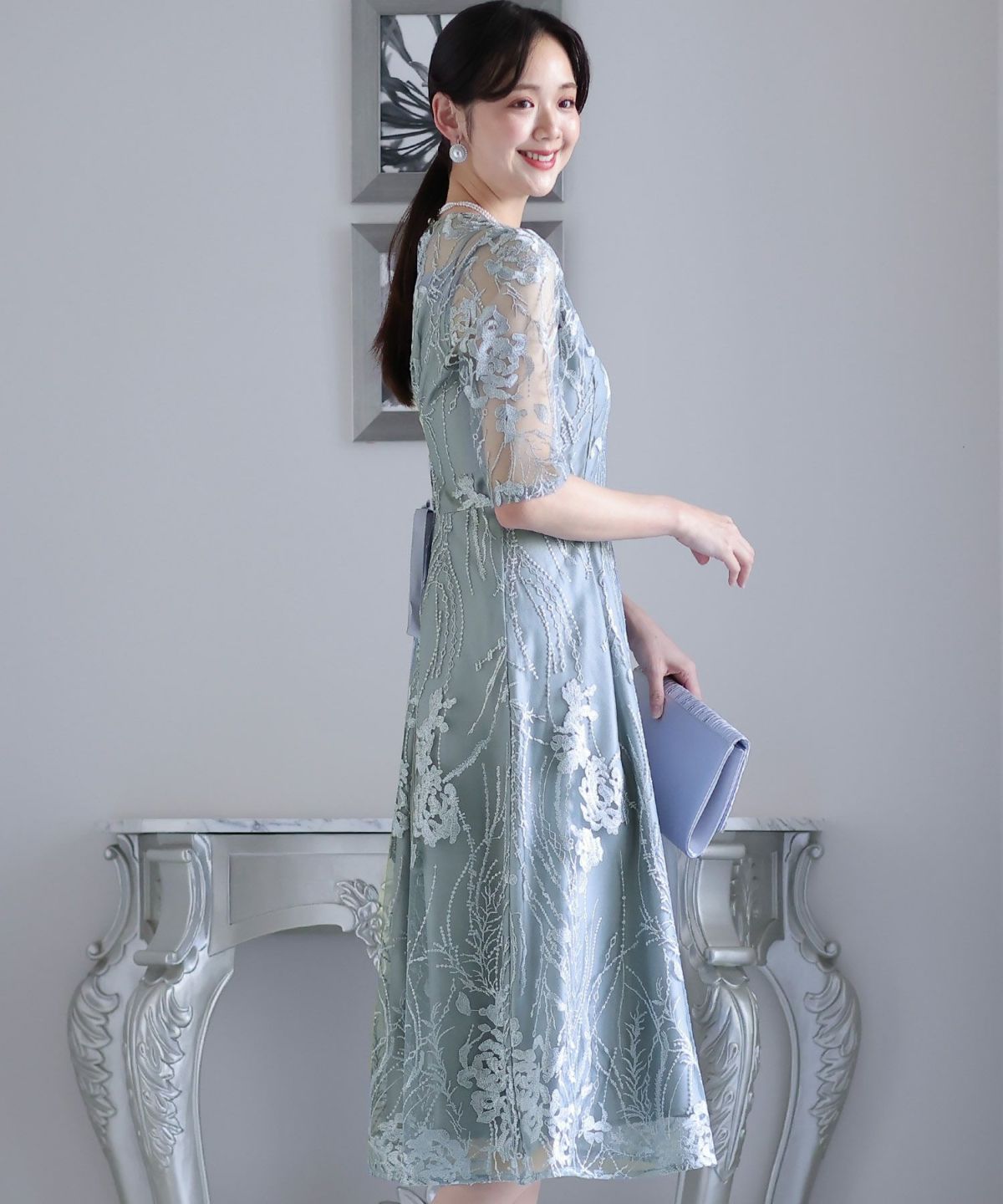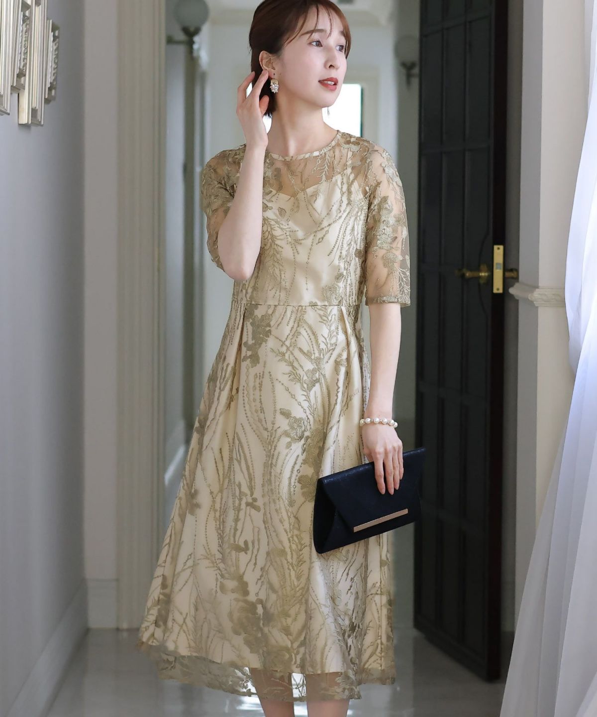 ボタニカルな総刺繍の光沢感が美しいレースドレス。大柄ながら繊細な刺繍ディティールなので、上品な印象に仕上がっています。