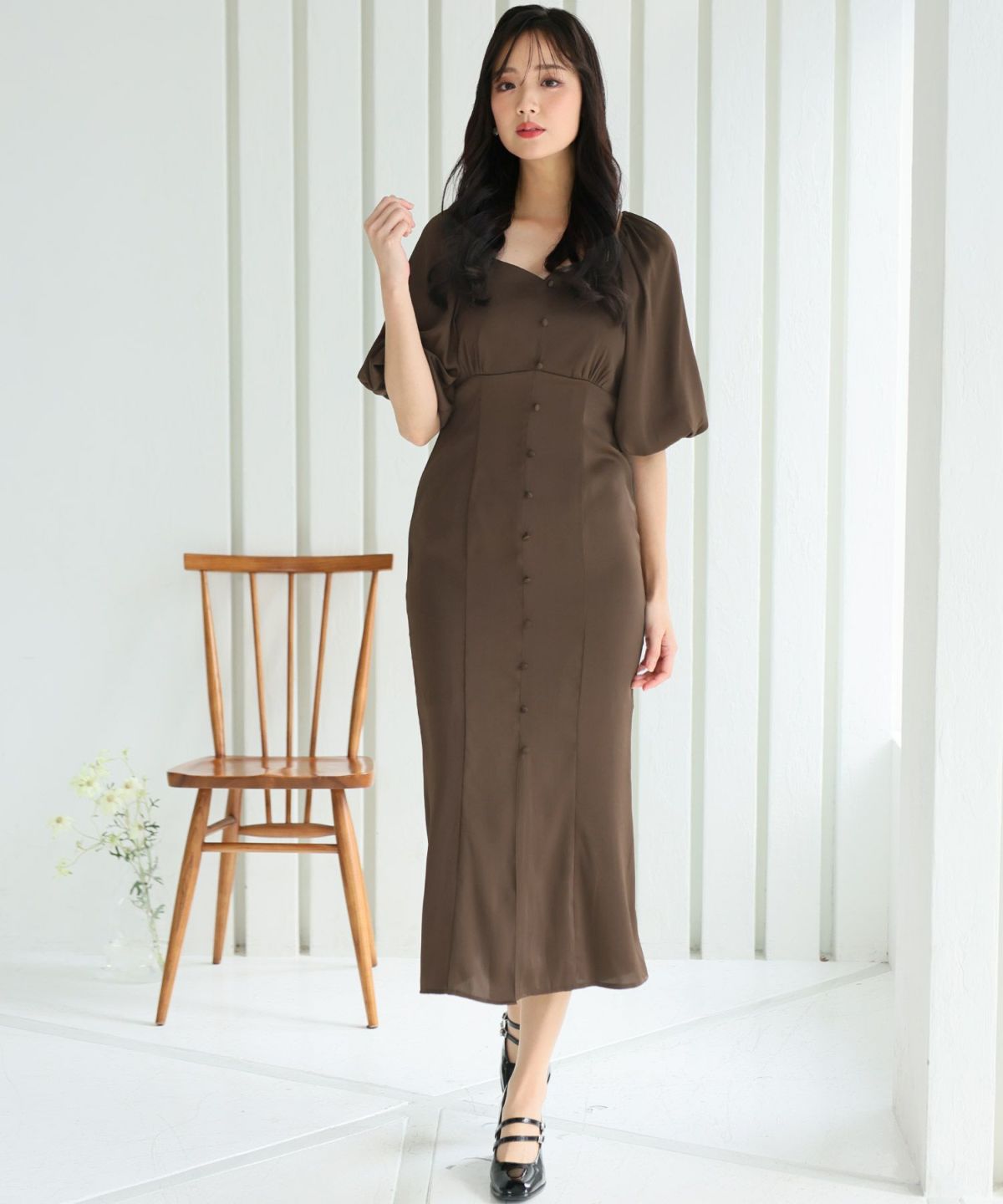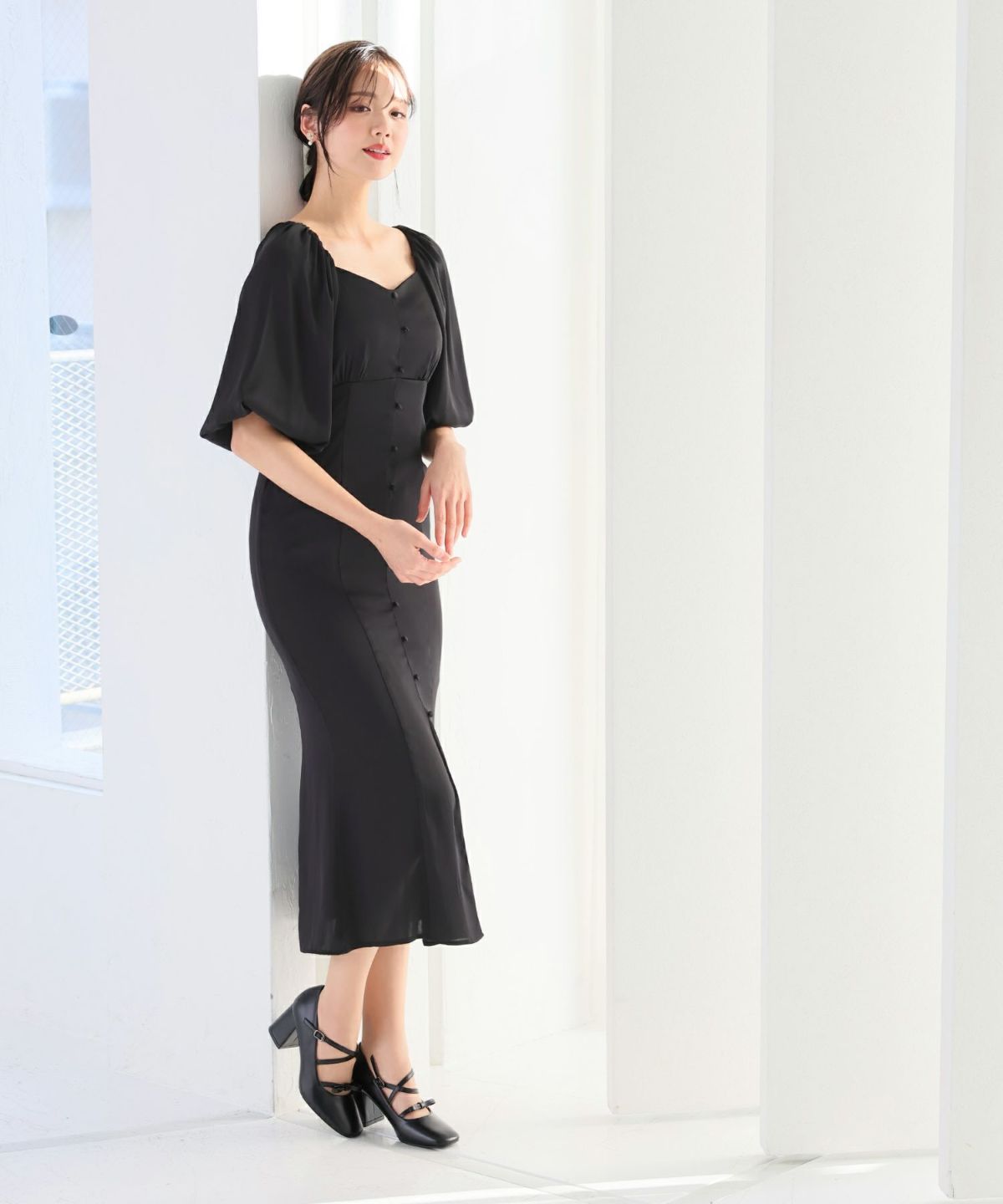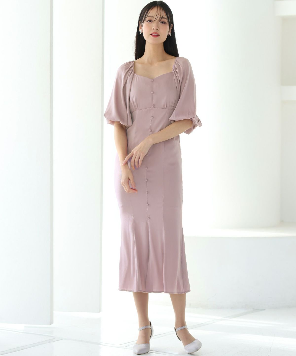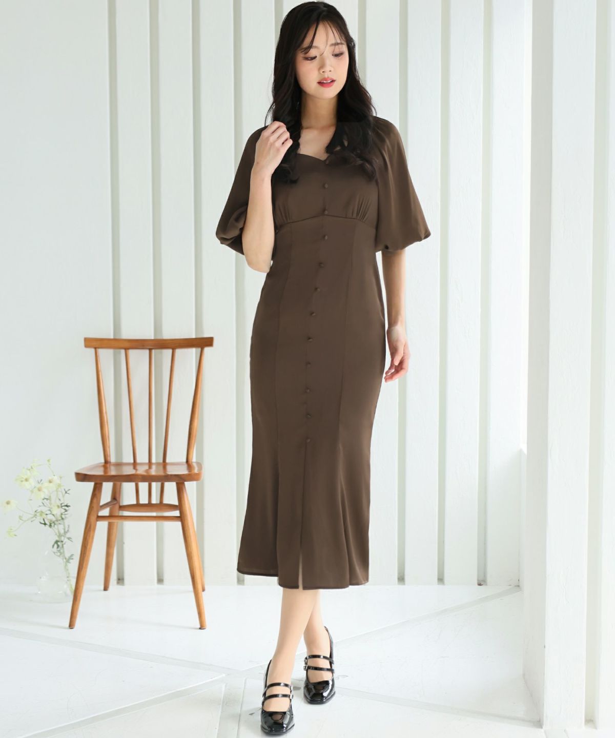 光沢楊柳サテンを使用したマーメイドワンピース。ボリューム感のあるパフスリーブがデザインポイントです。ふんわりと広がる袖がフェミニンな雰囲気を演出。シンプルなデザインが上品で大人っぽい印象に。