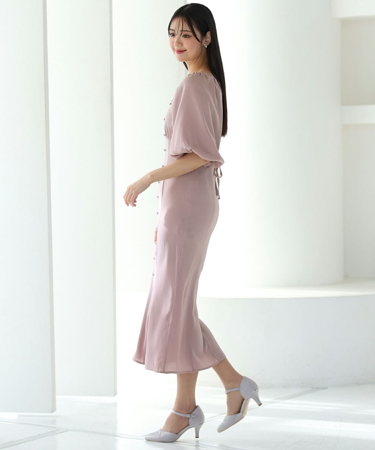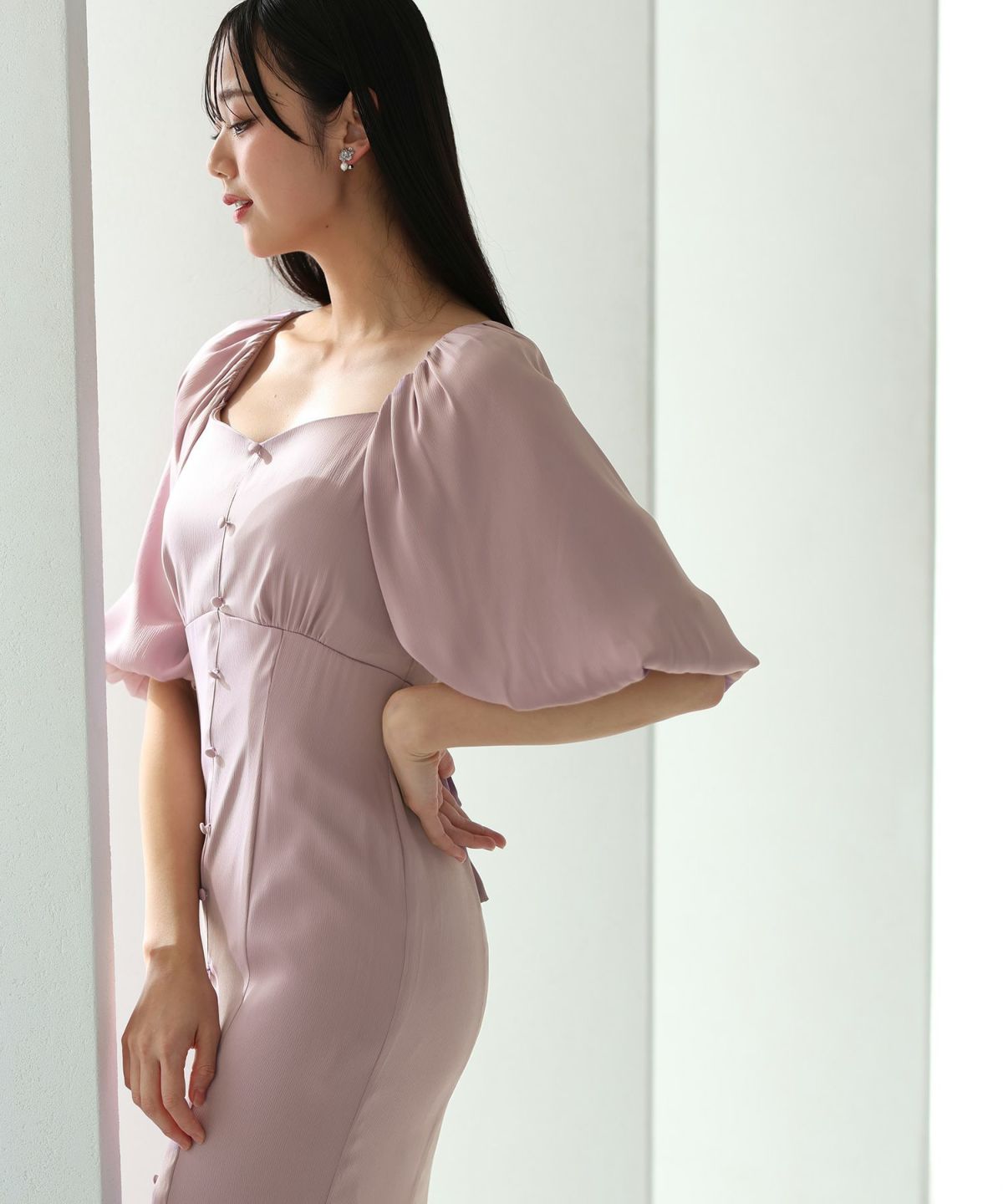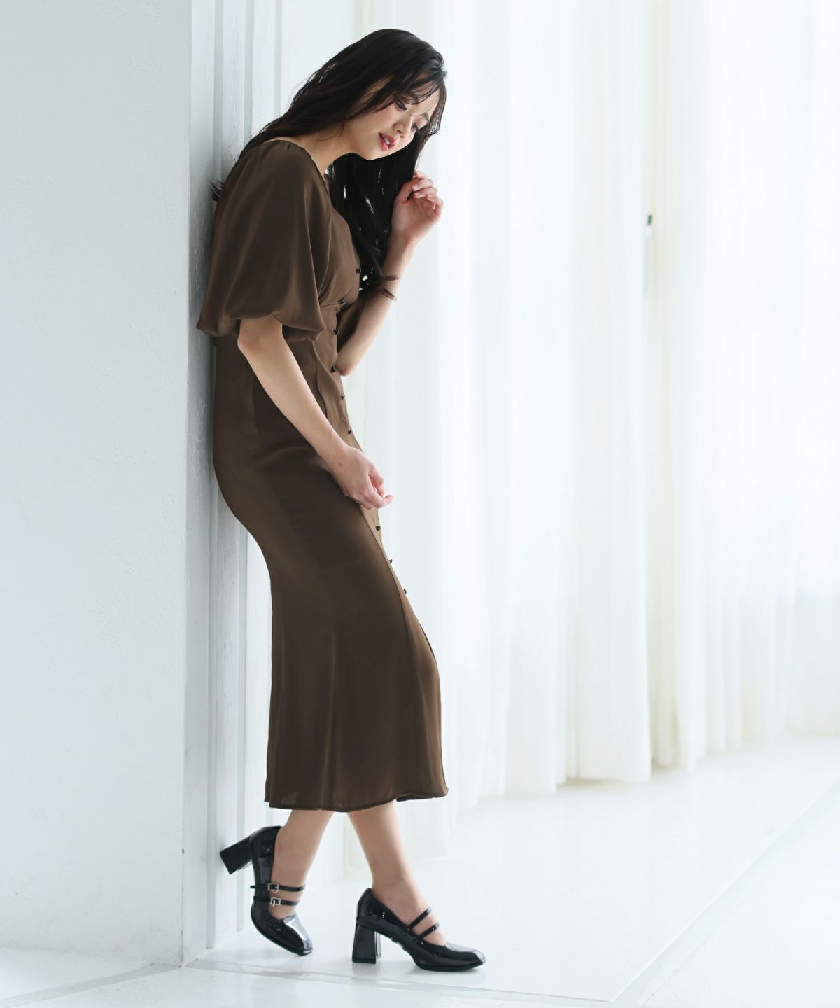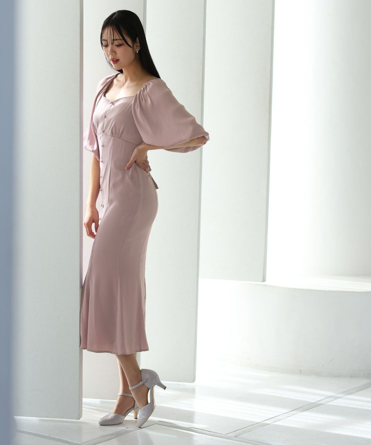 光沢楊柳サテンを使用したマーメイドワンピース。ボリューム感のあるパフスリーブがデザインポイントです。ふんわりと広がる袖がフェミニンな雰囲気を演出。シンプルなデザインが上品で大人っぽい印象に。