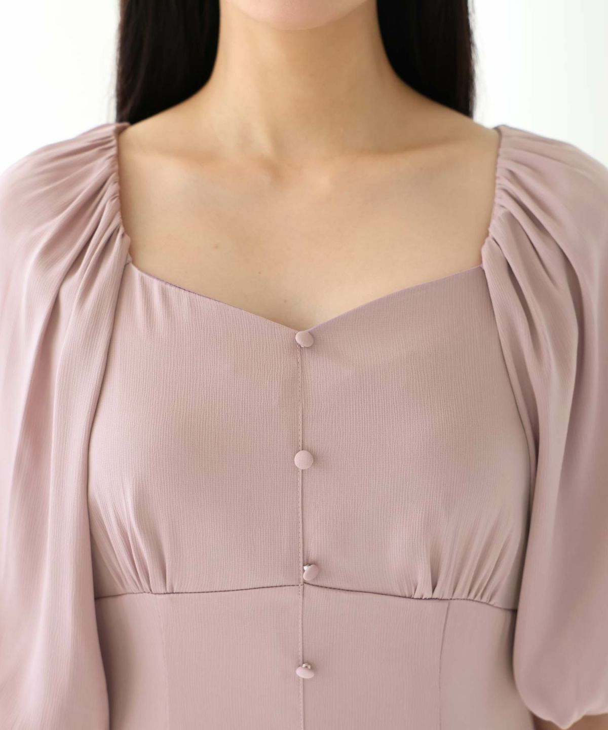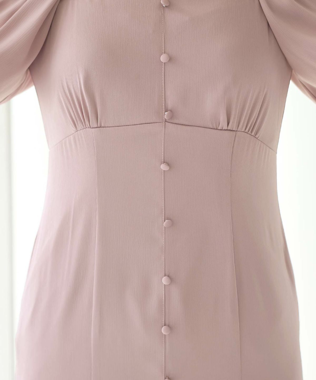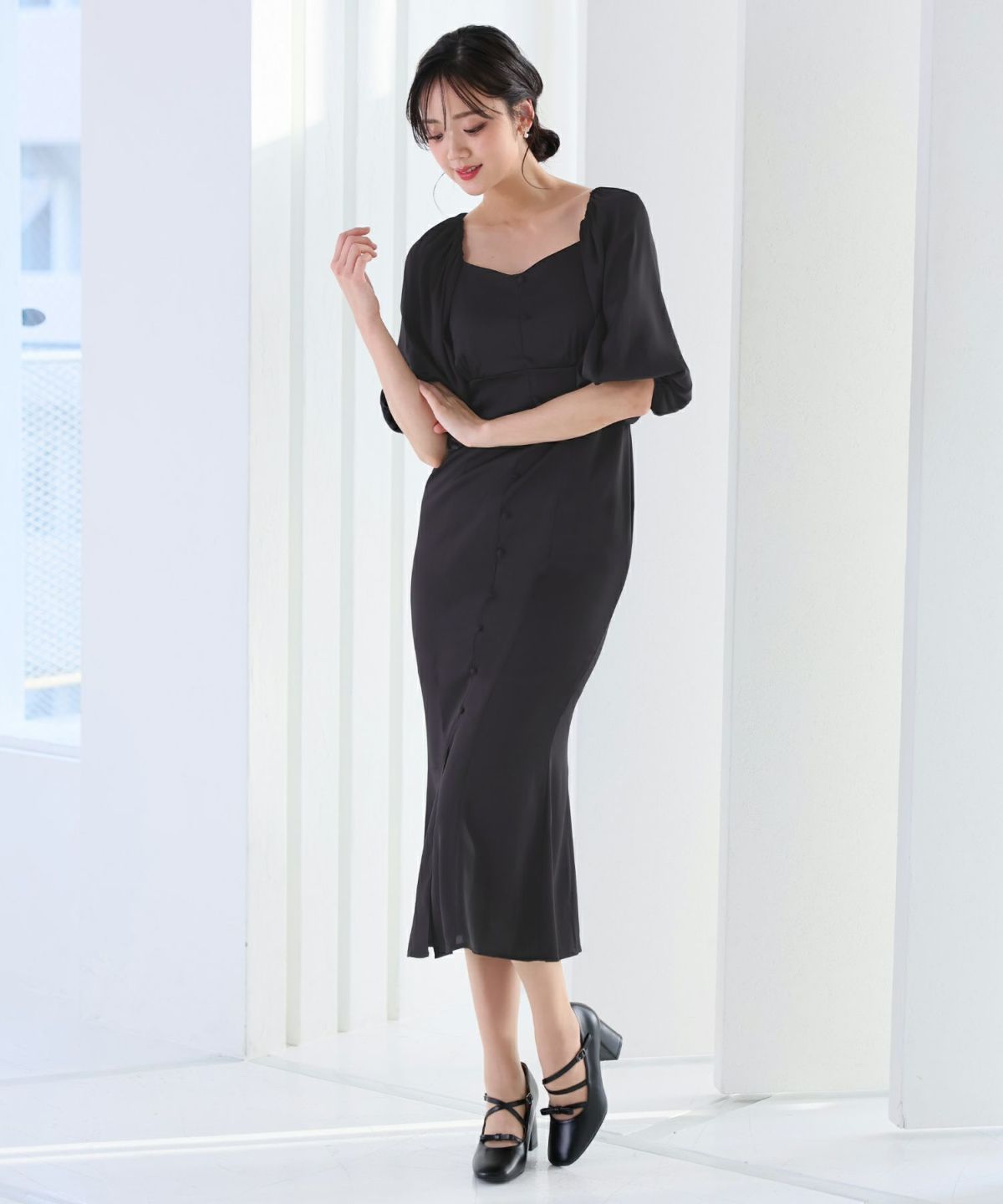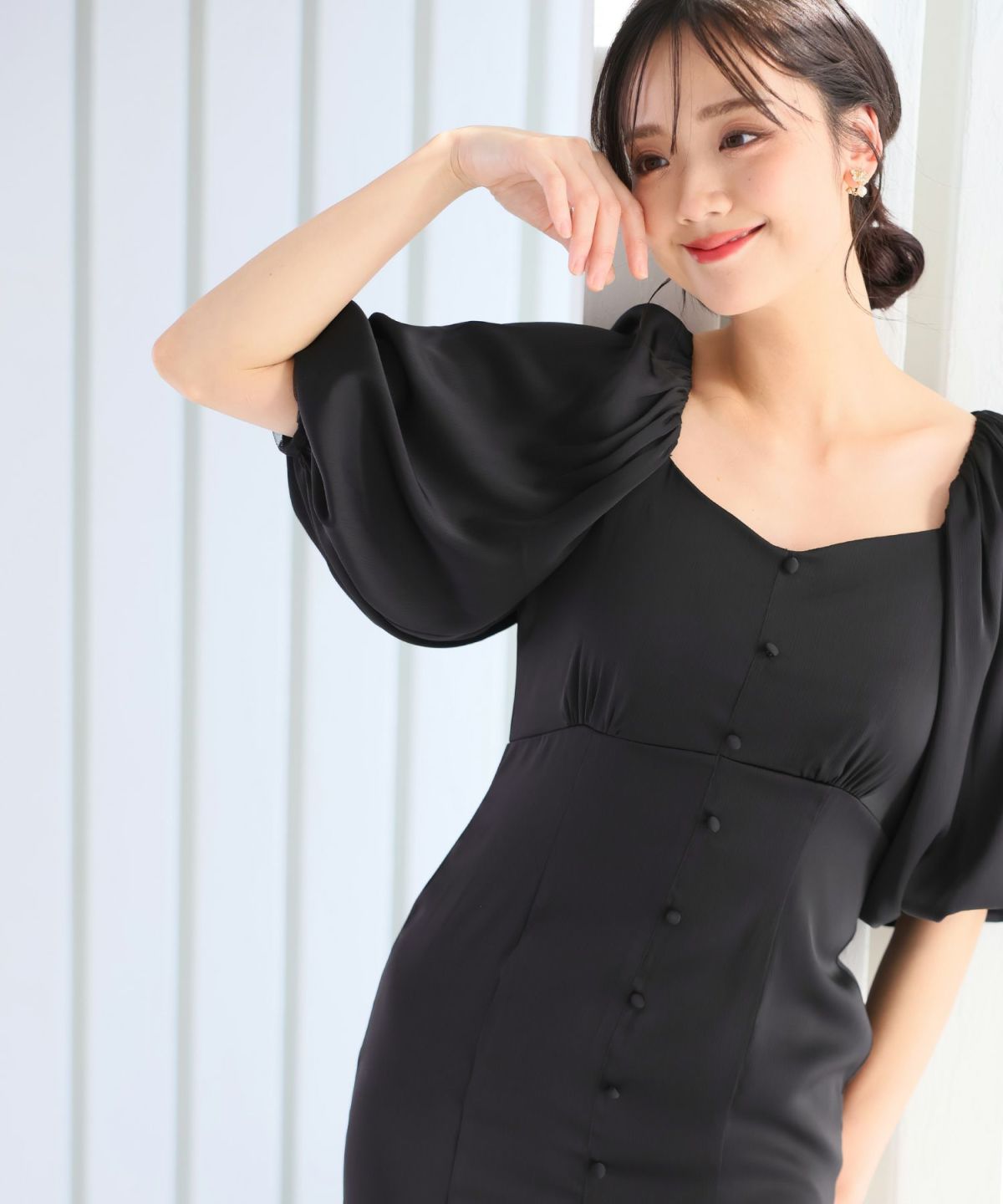 光沢楊柳サテンを使用したマーメイドワンピース。ボリューム感のあるパフスリーブがデザインポイントです。ふんわりと広がる袖がフェミニンな雰囲気を演出。シンプルなデザインが上品で大人っぽい印象に。