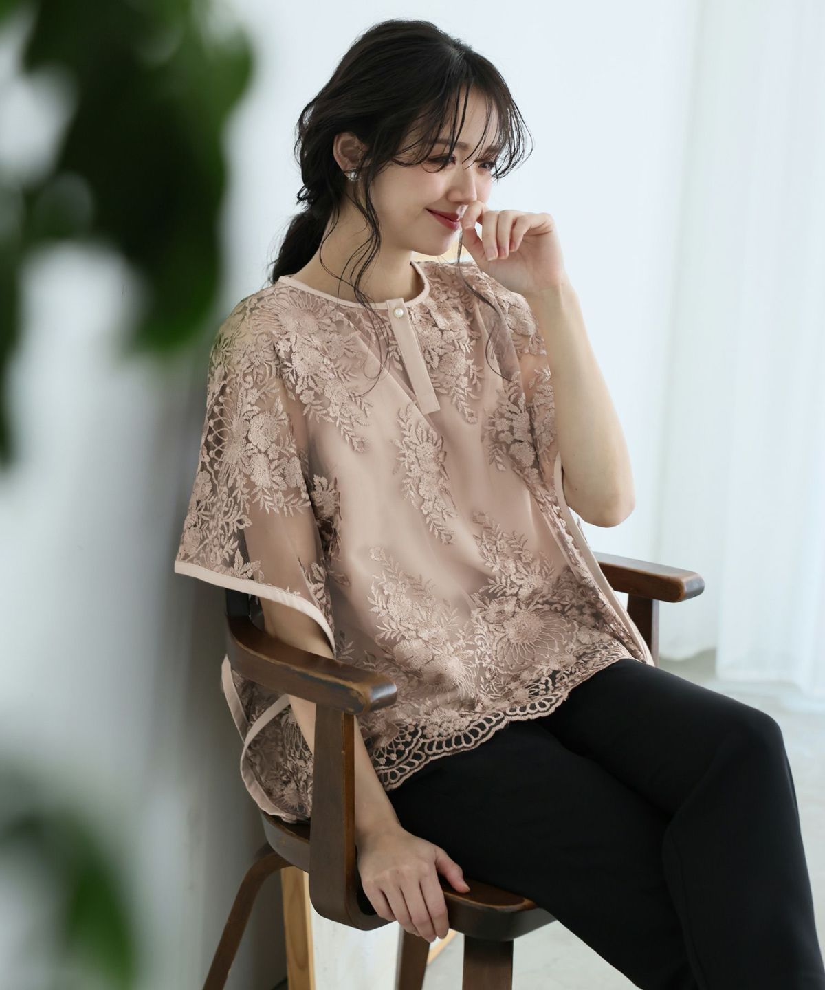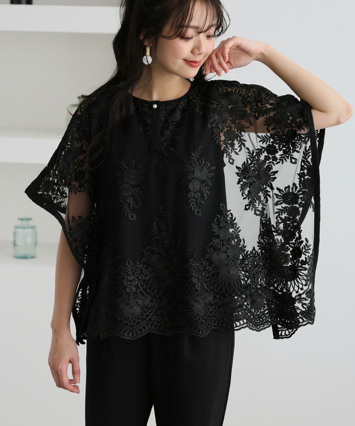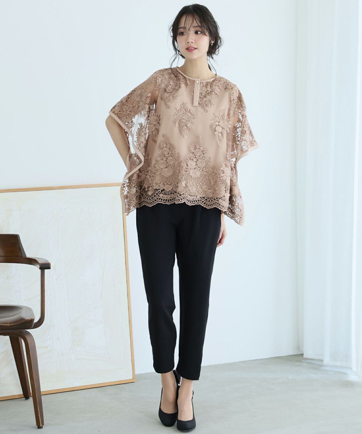 ■花柄刺繍トップスが目を惹く 体型カバーポイント:【ヒップ】【ウエスト】 袖口が大きく開いた形が特徴的なバタフライスリーブのため、締め付け感がなくストレスフリーな着心地を楽しんでいただけます。 ゆったりとした長めのトップスなので、お腹周りをしっかりカバーしてくれます。