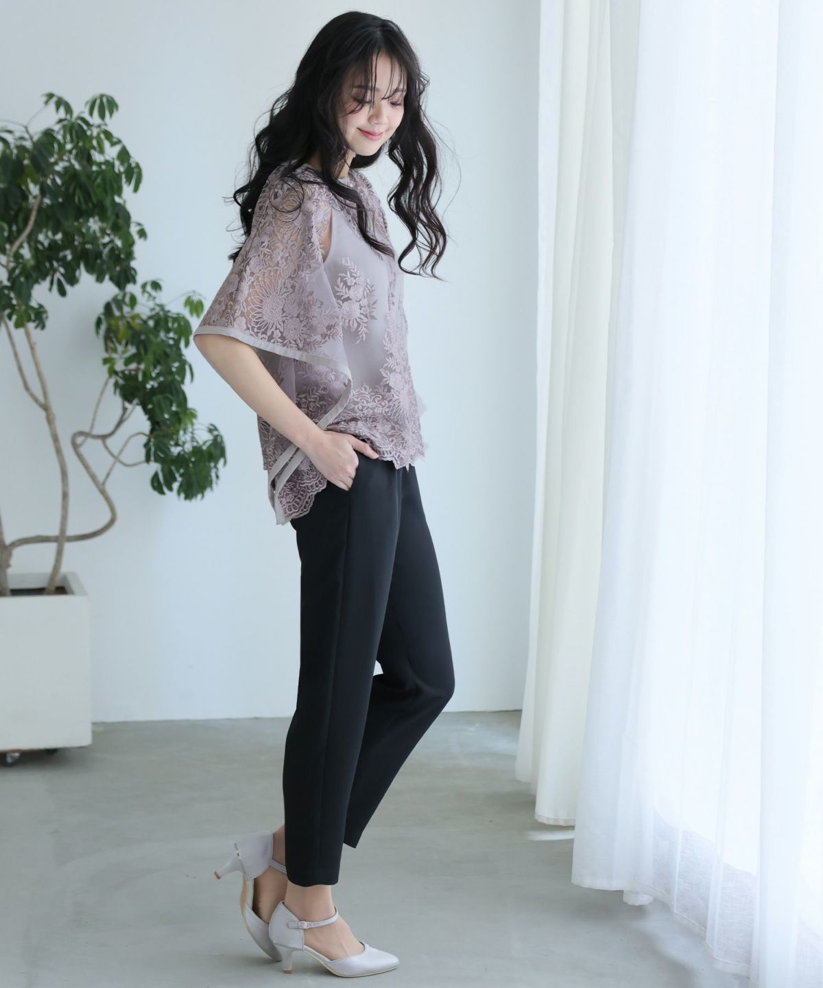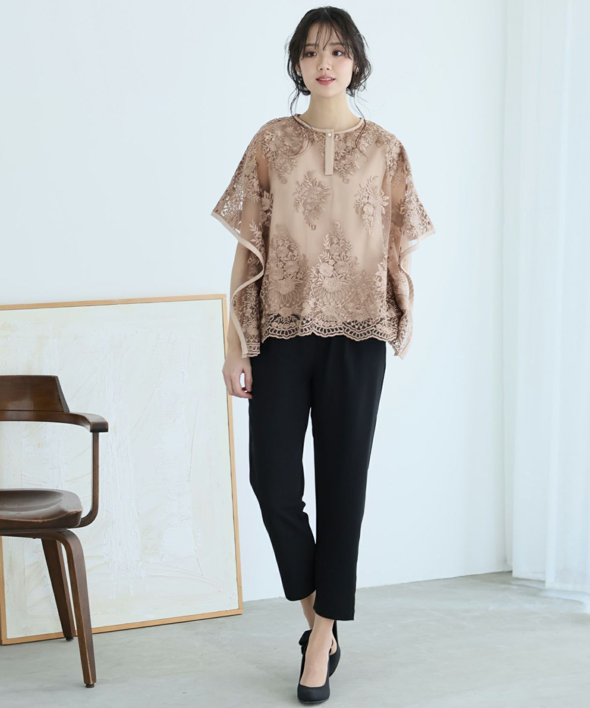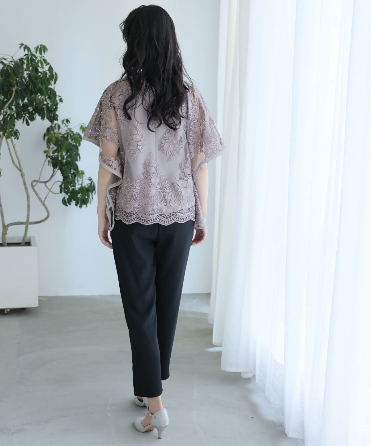 特徴的なバタフライスリーブでストレスフリーな着心地 刺繍パンツドレス3点セット