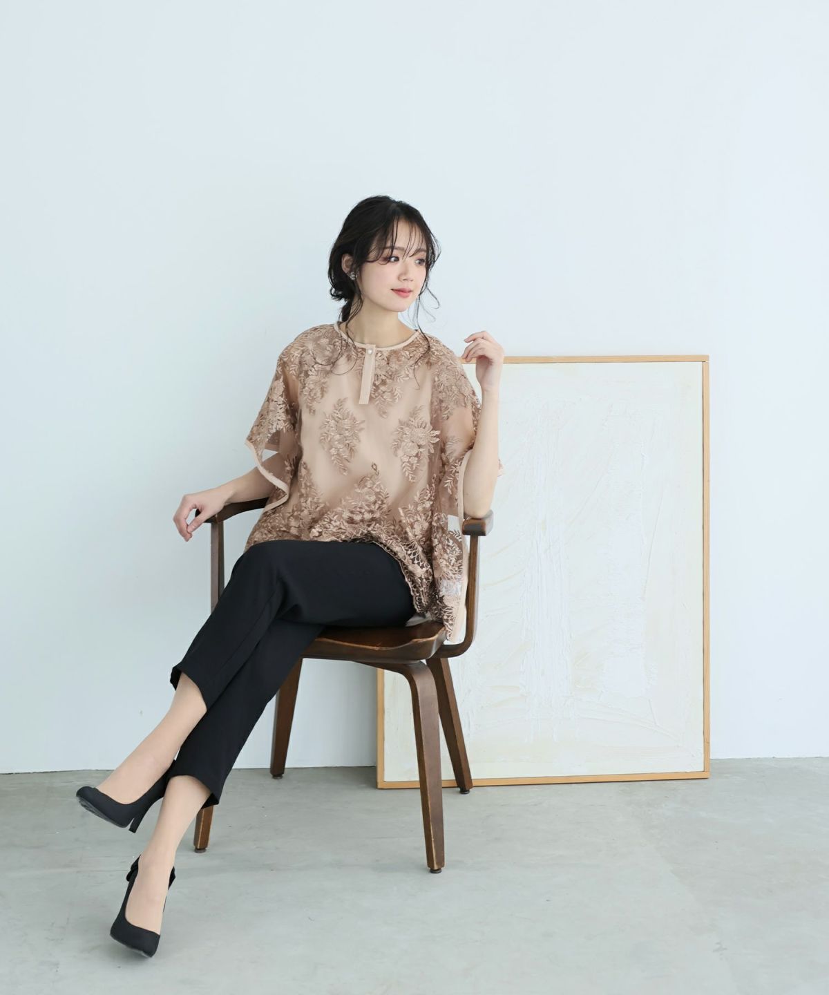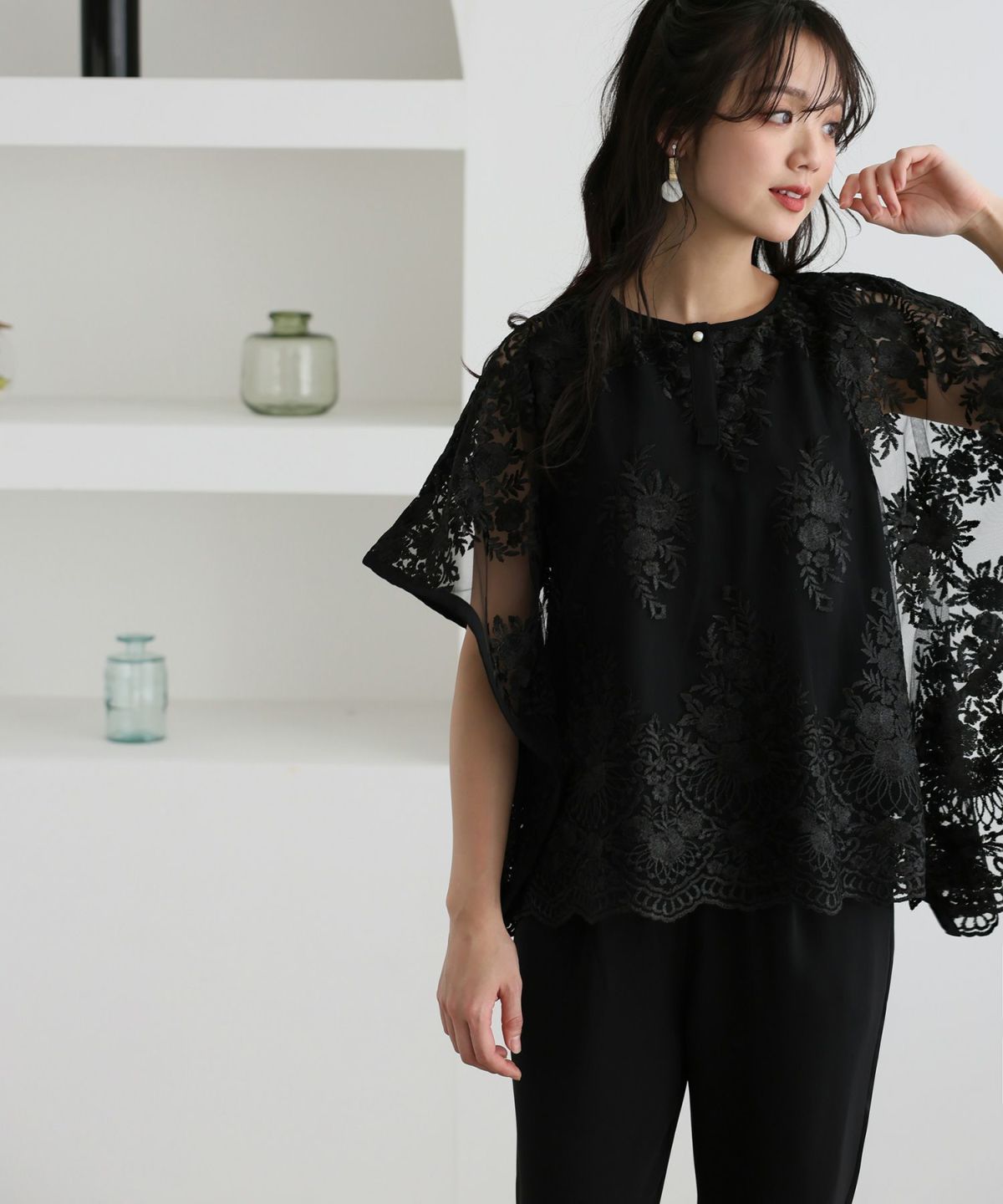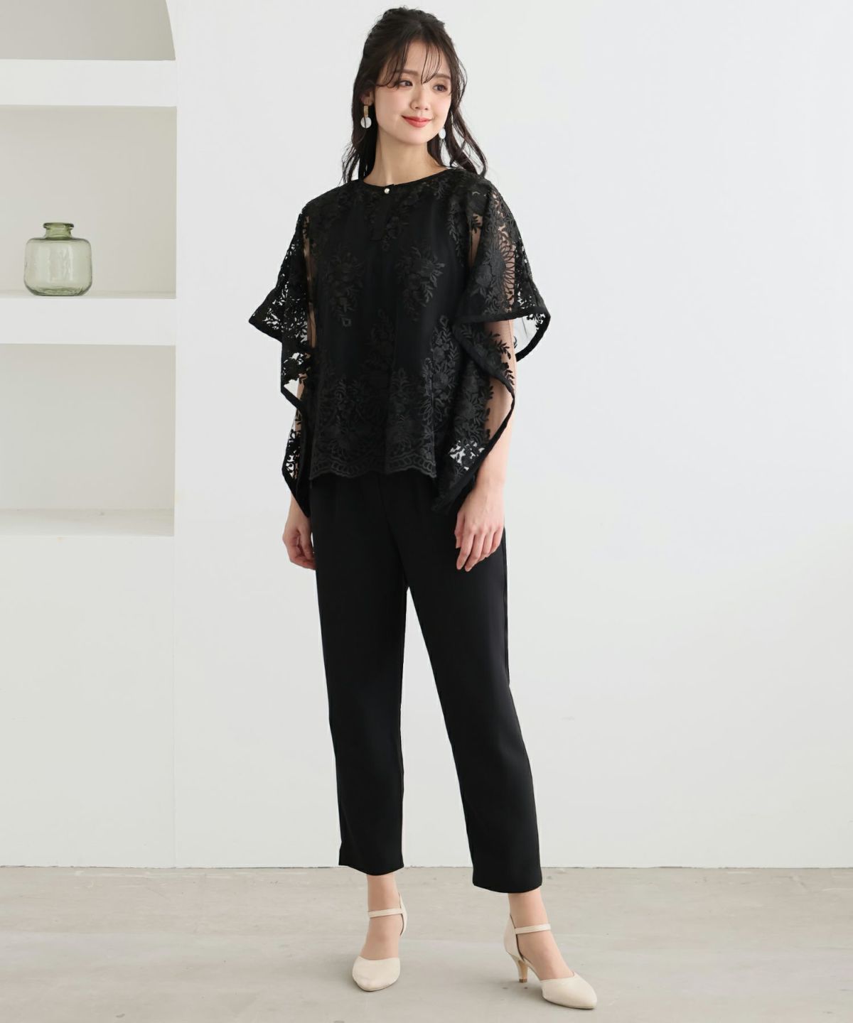 特徴的なバタフライスリーブでストレスフリーな着心地 刺繍パンツドレス3点セット