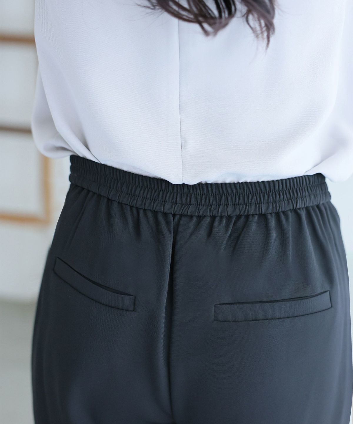 ■すっきりパンツでキレイめスタイルに ウエストは背面ゴムになっているので、長時間のご着用もストレスなくご使用いただけます。